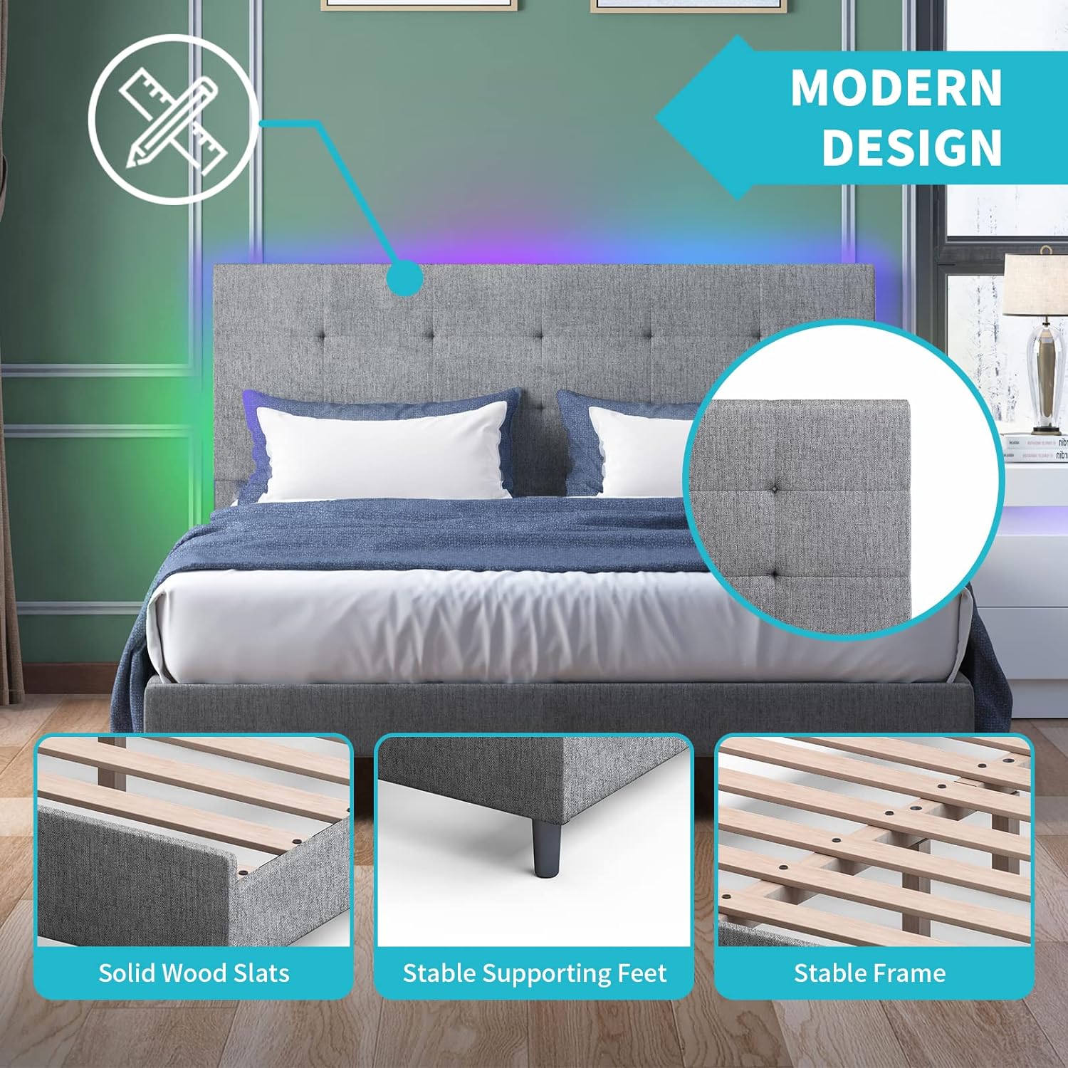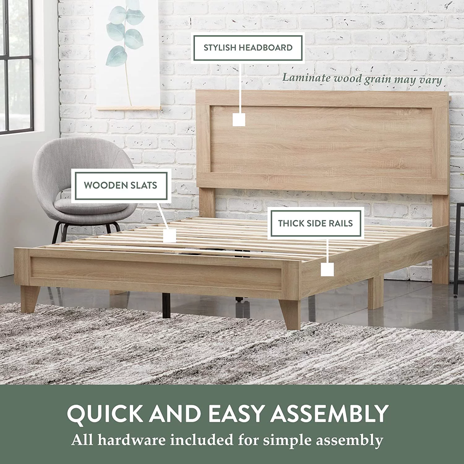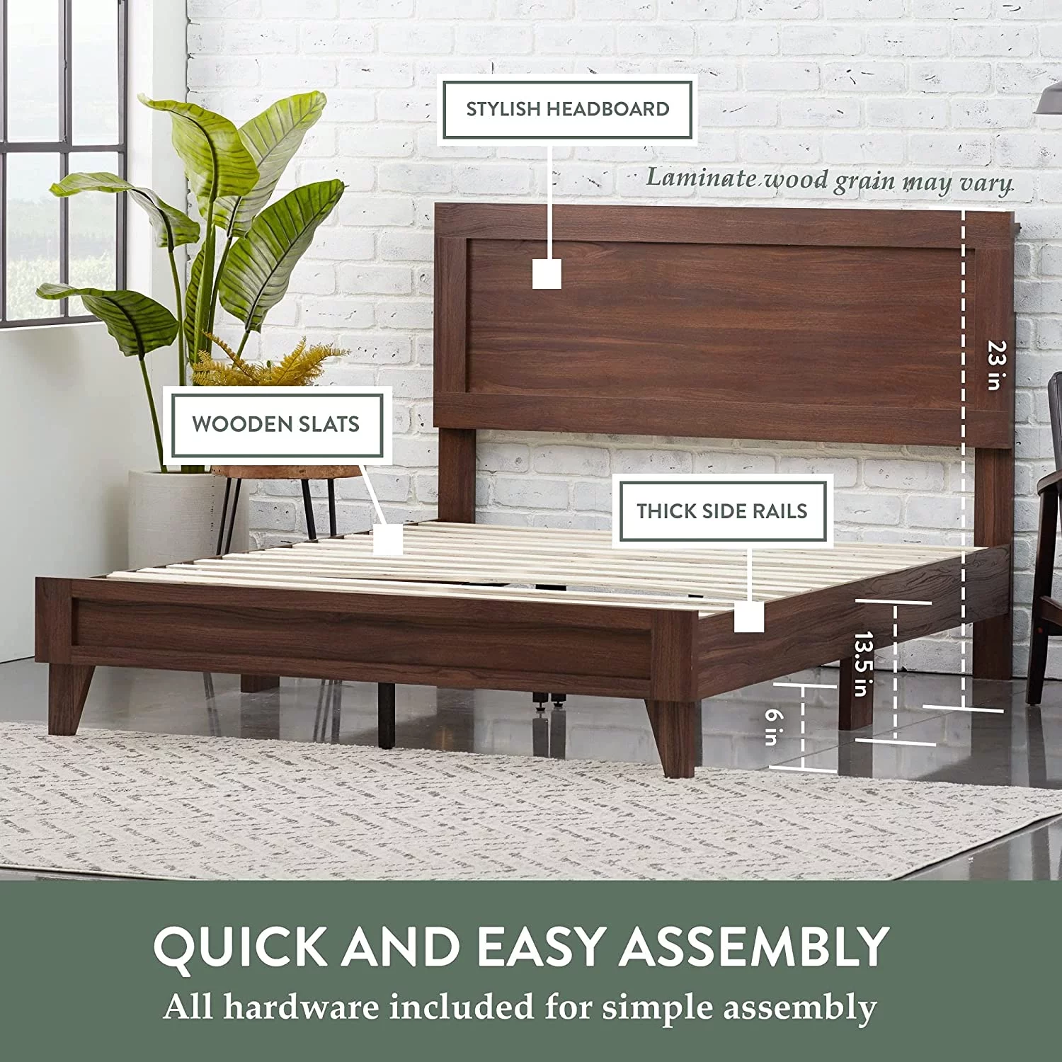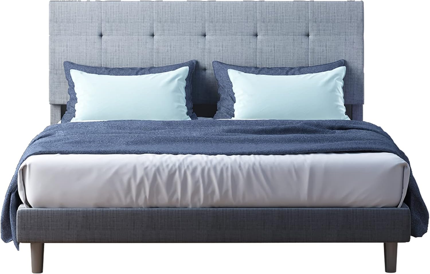 Queen Size Bed Frame with Headboard, Wood Slat Support, No Box Spring Needed