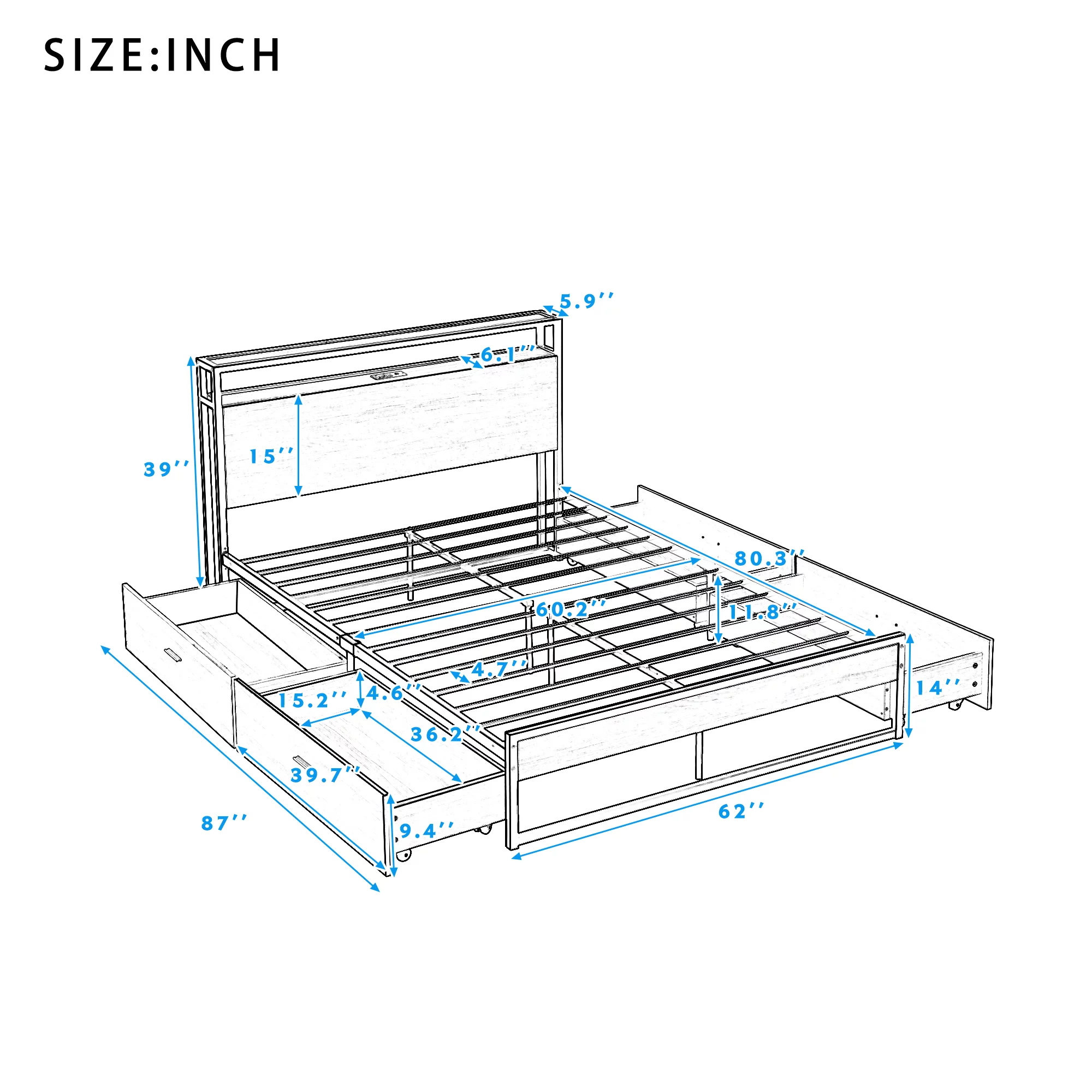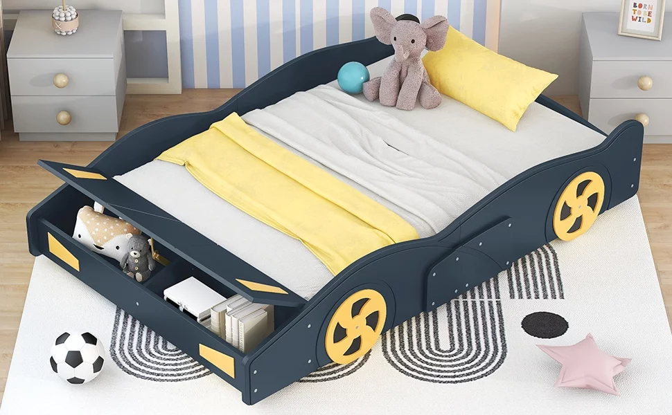 Full Size Race Car-Shaped Platform Bed with Wheels and Storage, Dark Blue+Yellow
