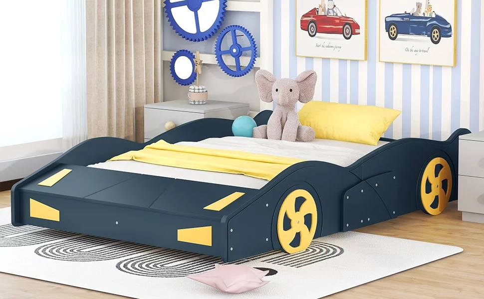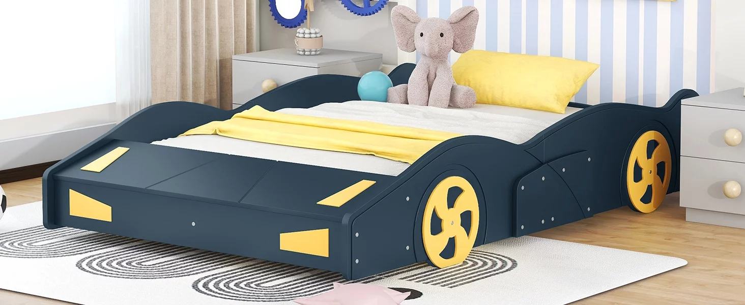 CoSoTower Full Size Race Car-Shaped Platform Bed with Wheels and Storage, Dark Blue+Yellow