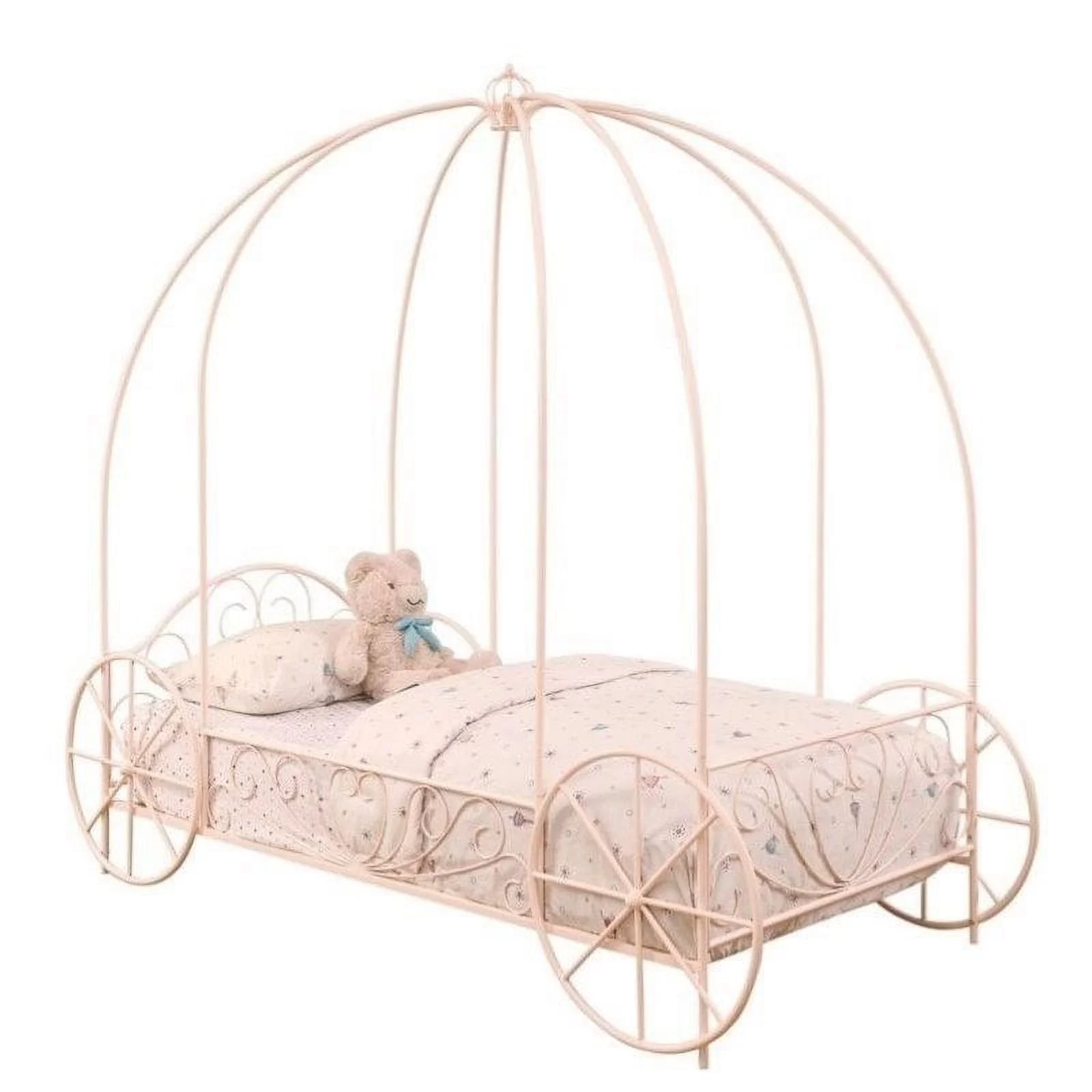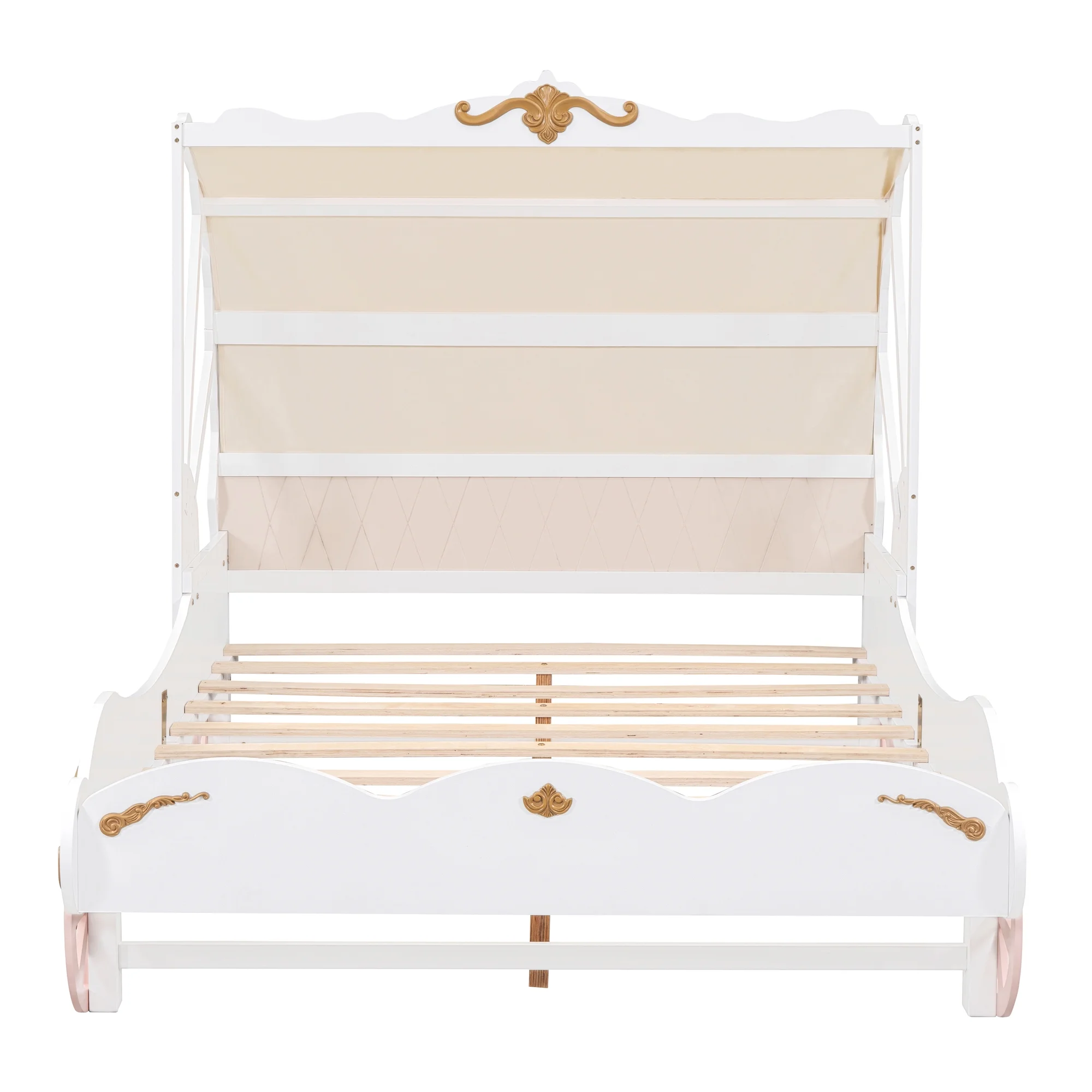 CoSoTower Full Size Princess Carriage Bed with Canopy, Wood Platform Car Bed with 3D Carving Pattern, White+Pink+Gold