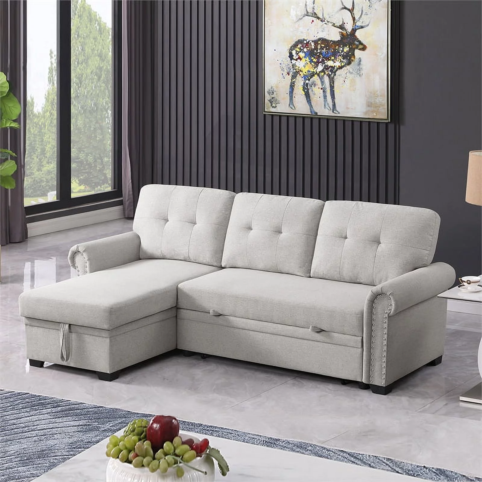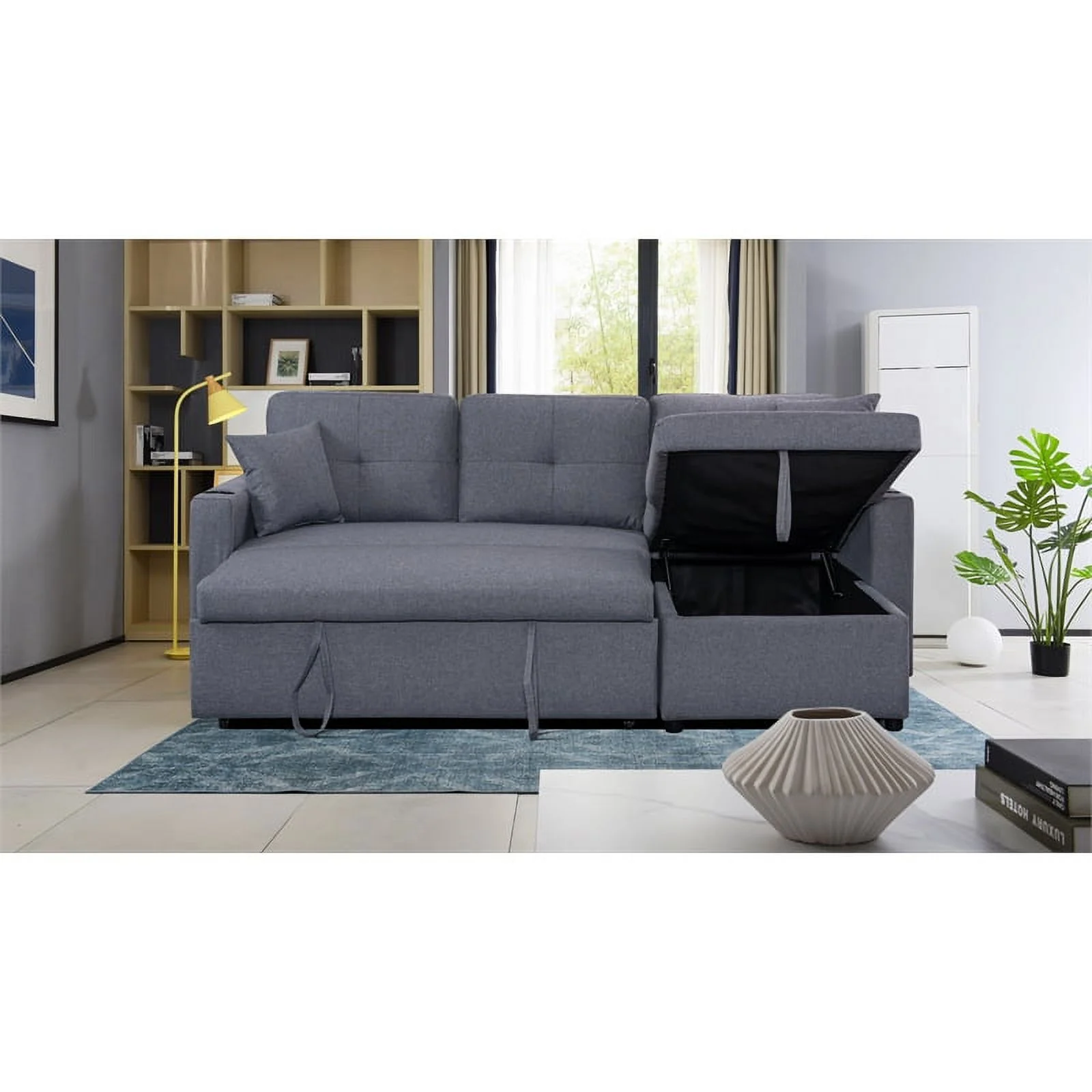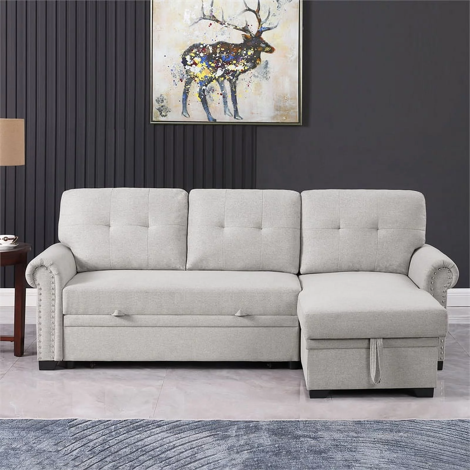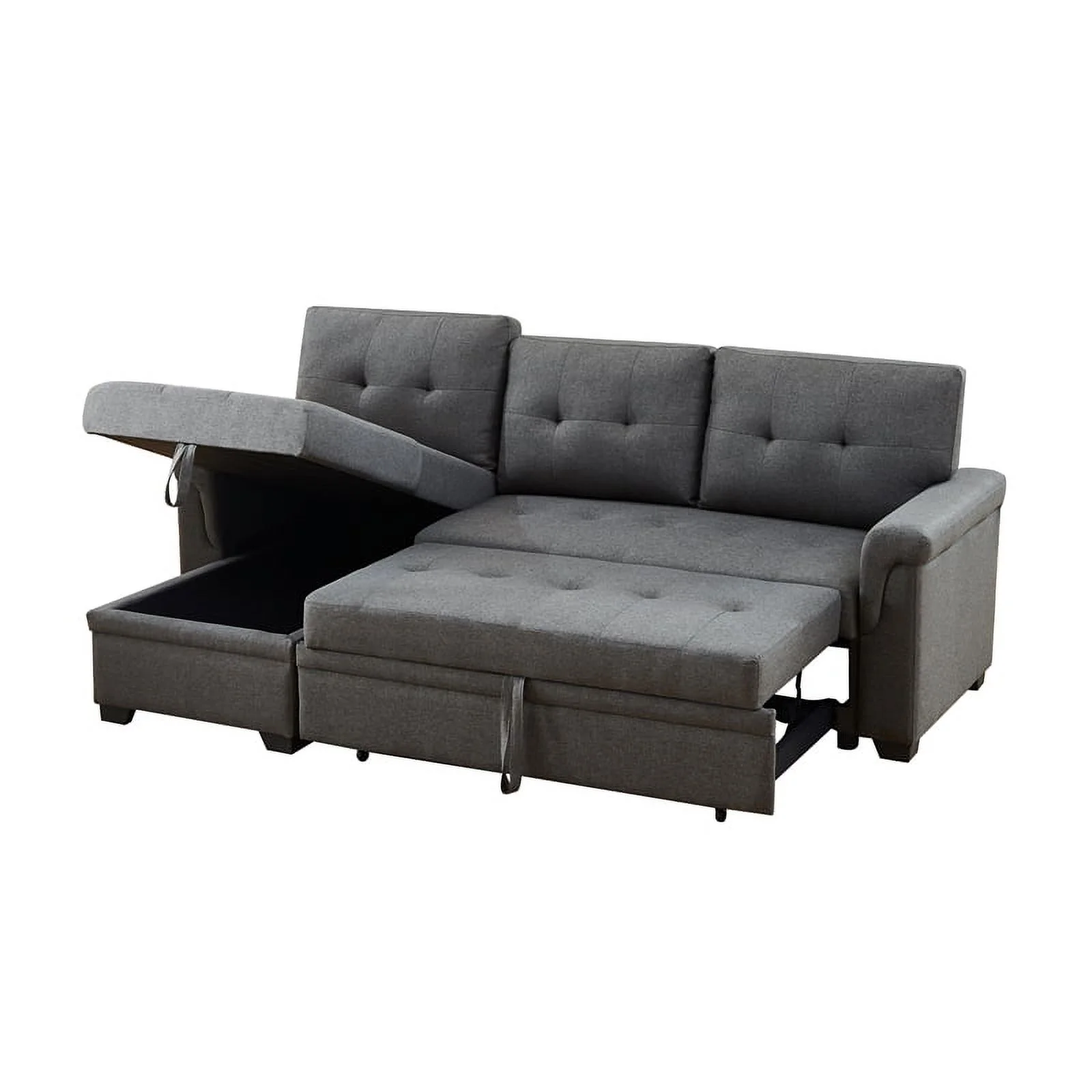 Pemberly Row Linen Fabric Reversible Sleeper Sofa Storage Chaise in Gray