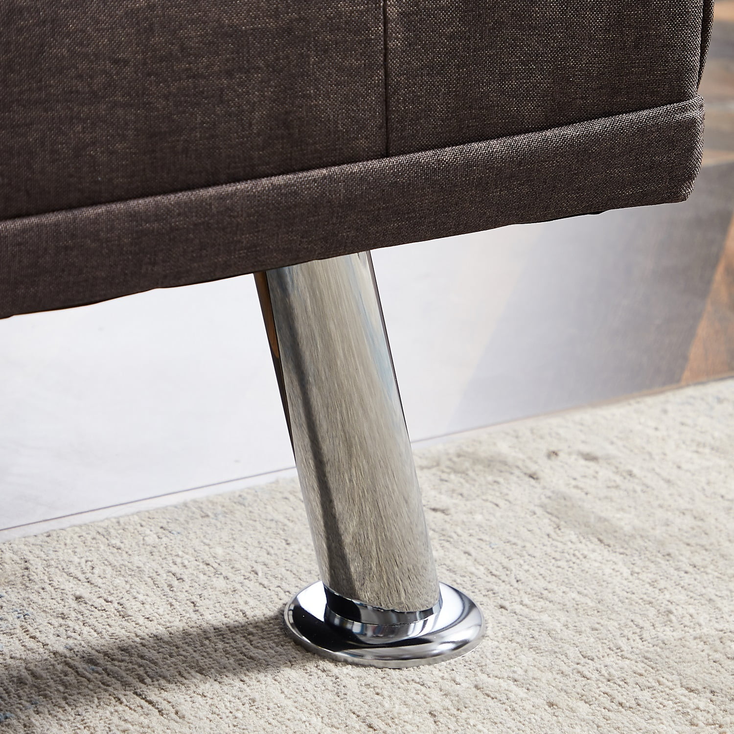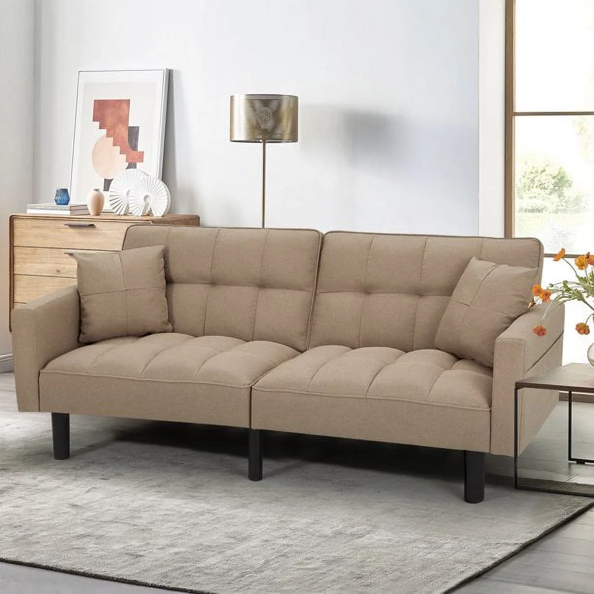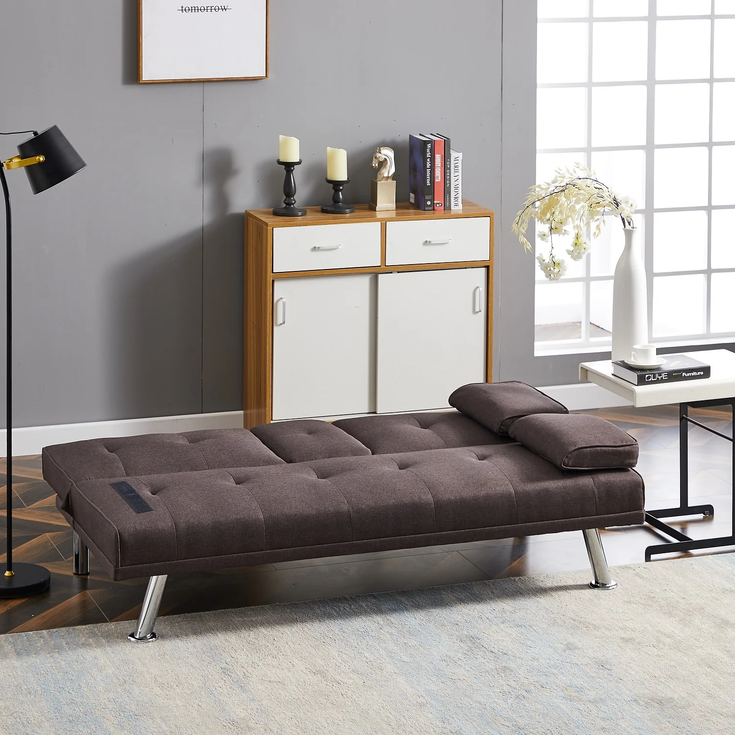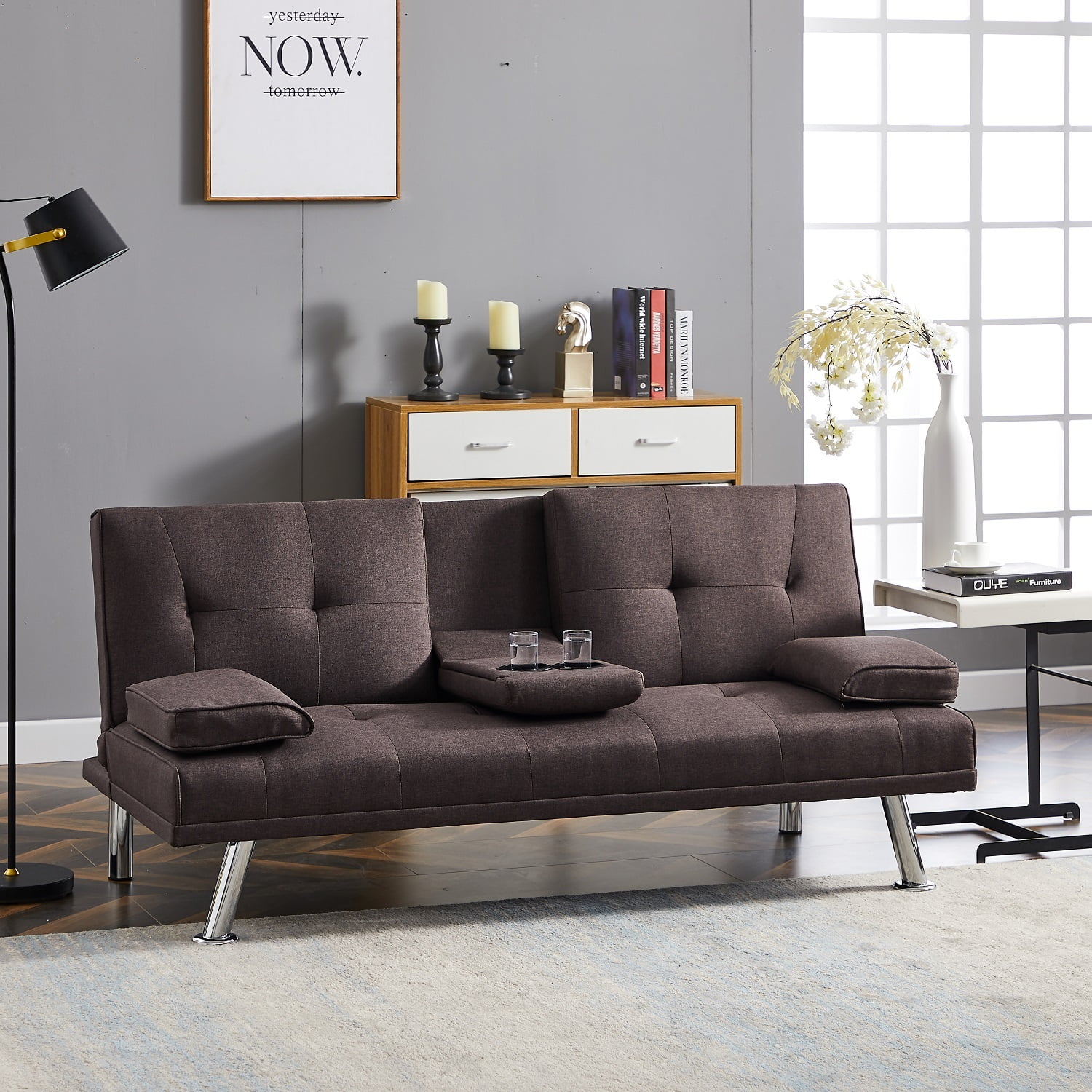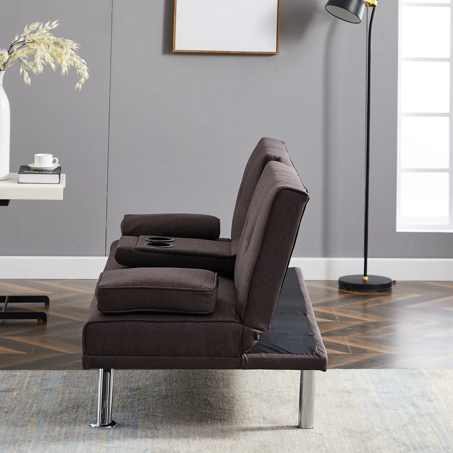 Dubbin Modern Linen Convertible Futon Sofa Bed with Removable Armrests,Metal Legs,and Cupholders - Brown