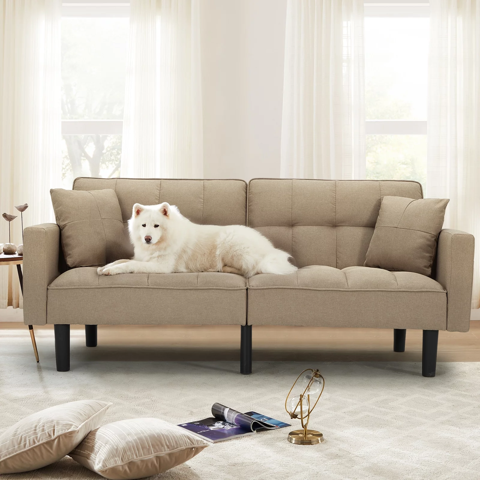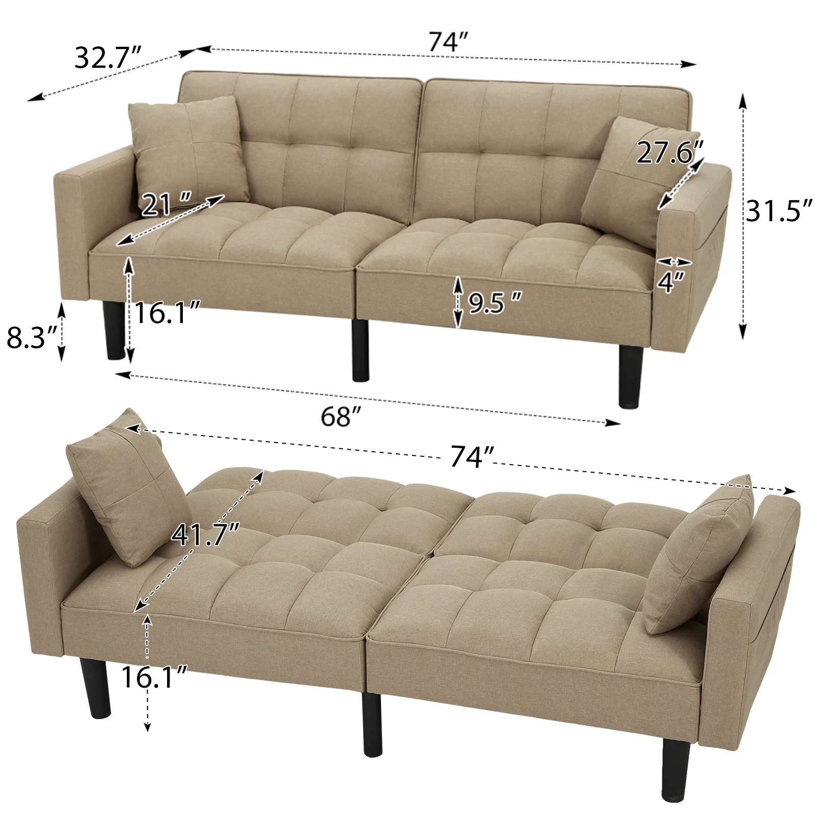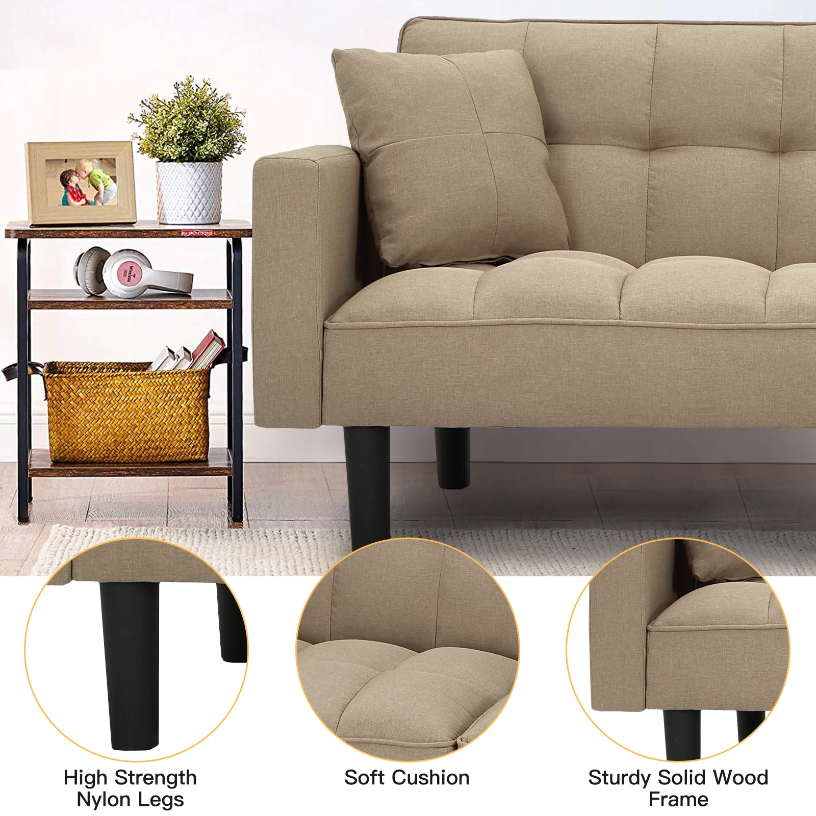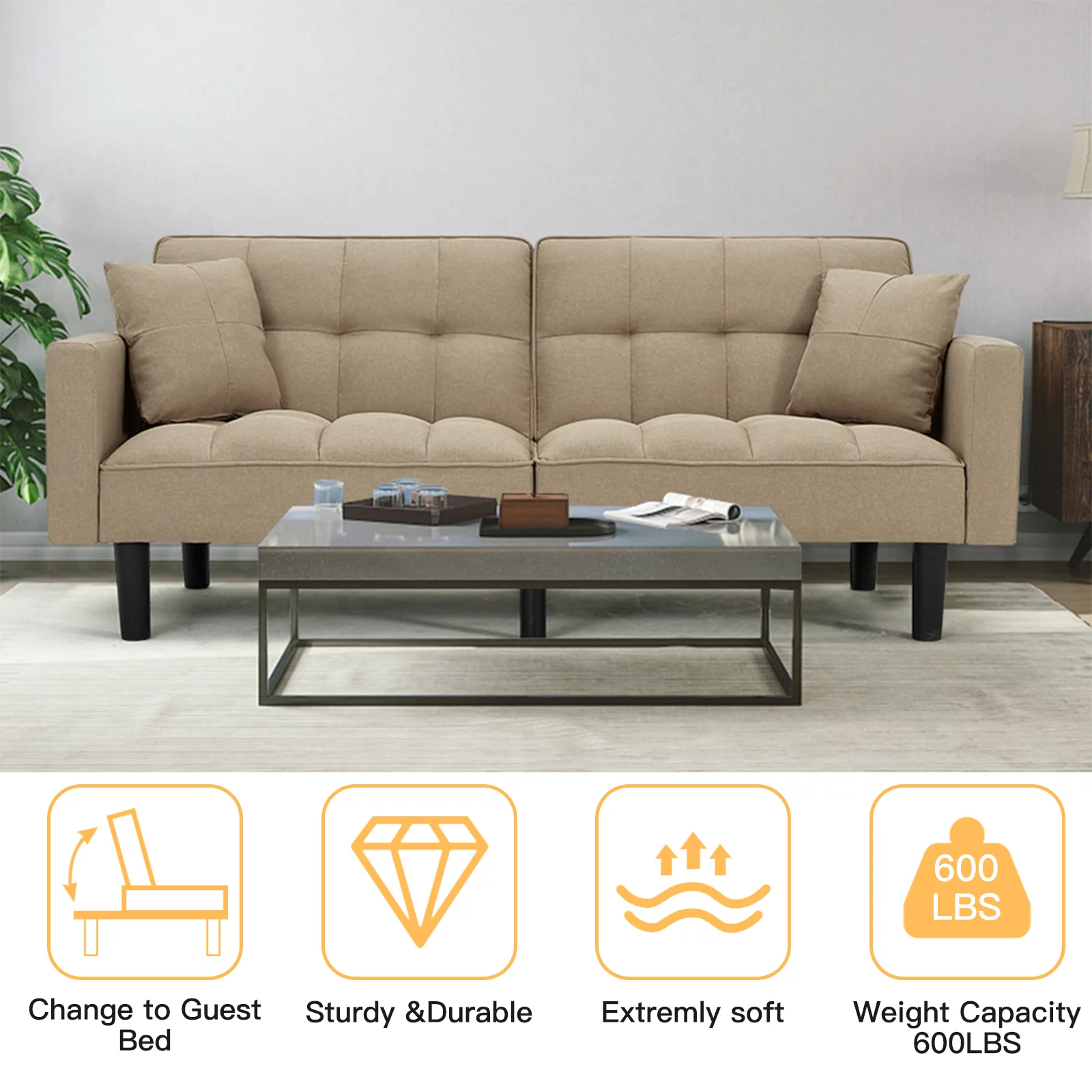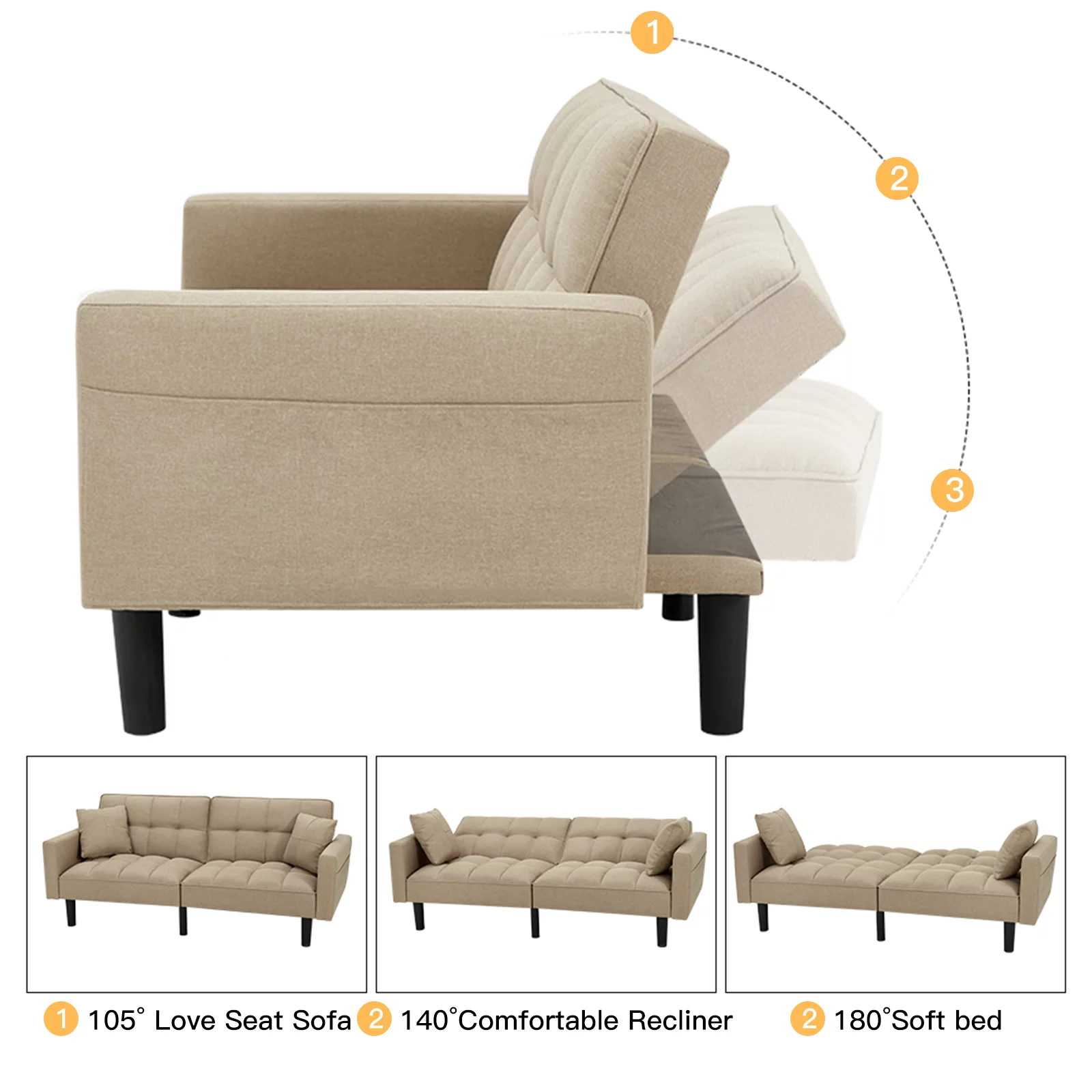Dubbin Modern Linen Convertible Futon Sofa Bed with Removable Armrests,Metal Legs,and Cupholders - Brown