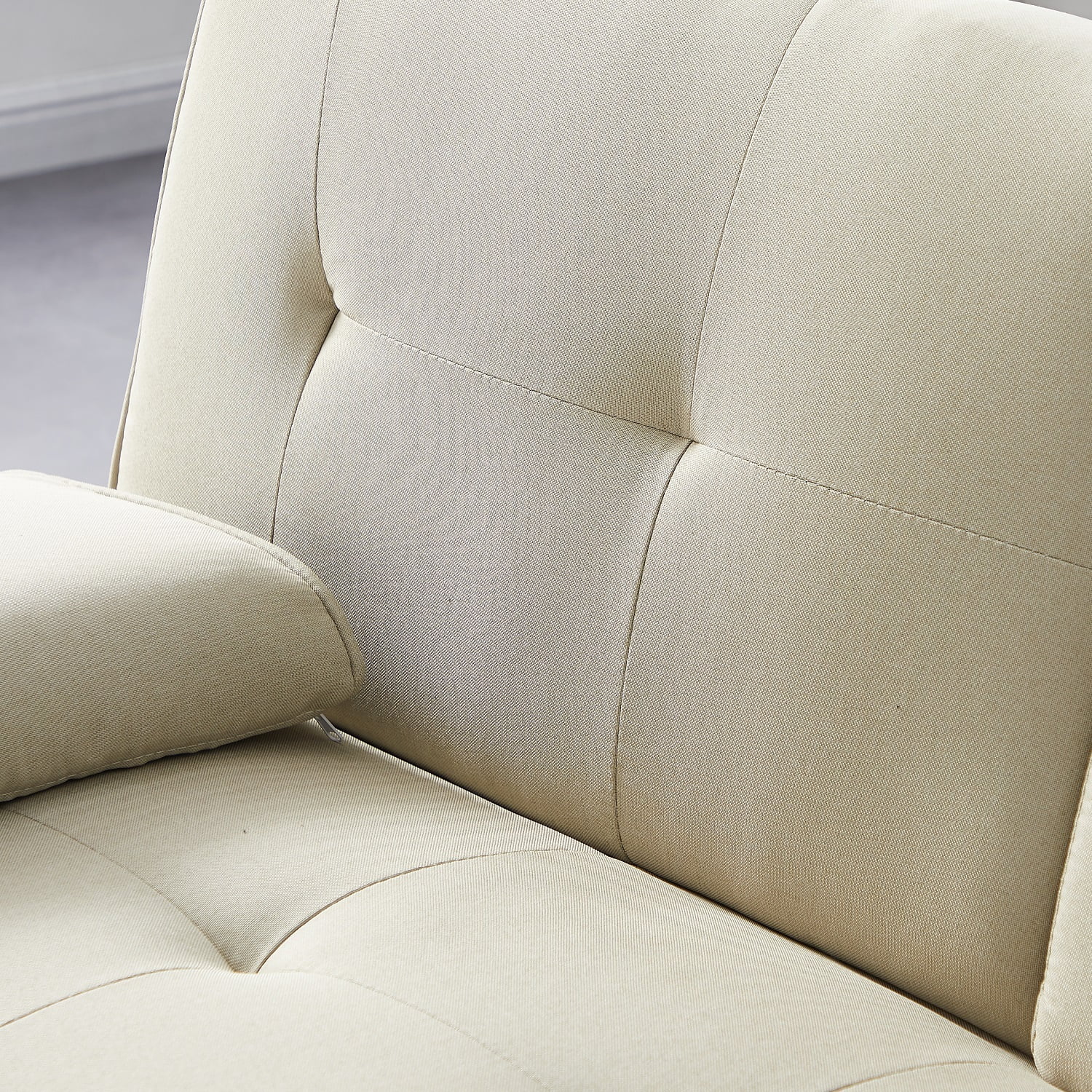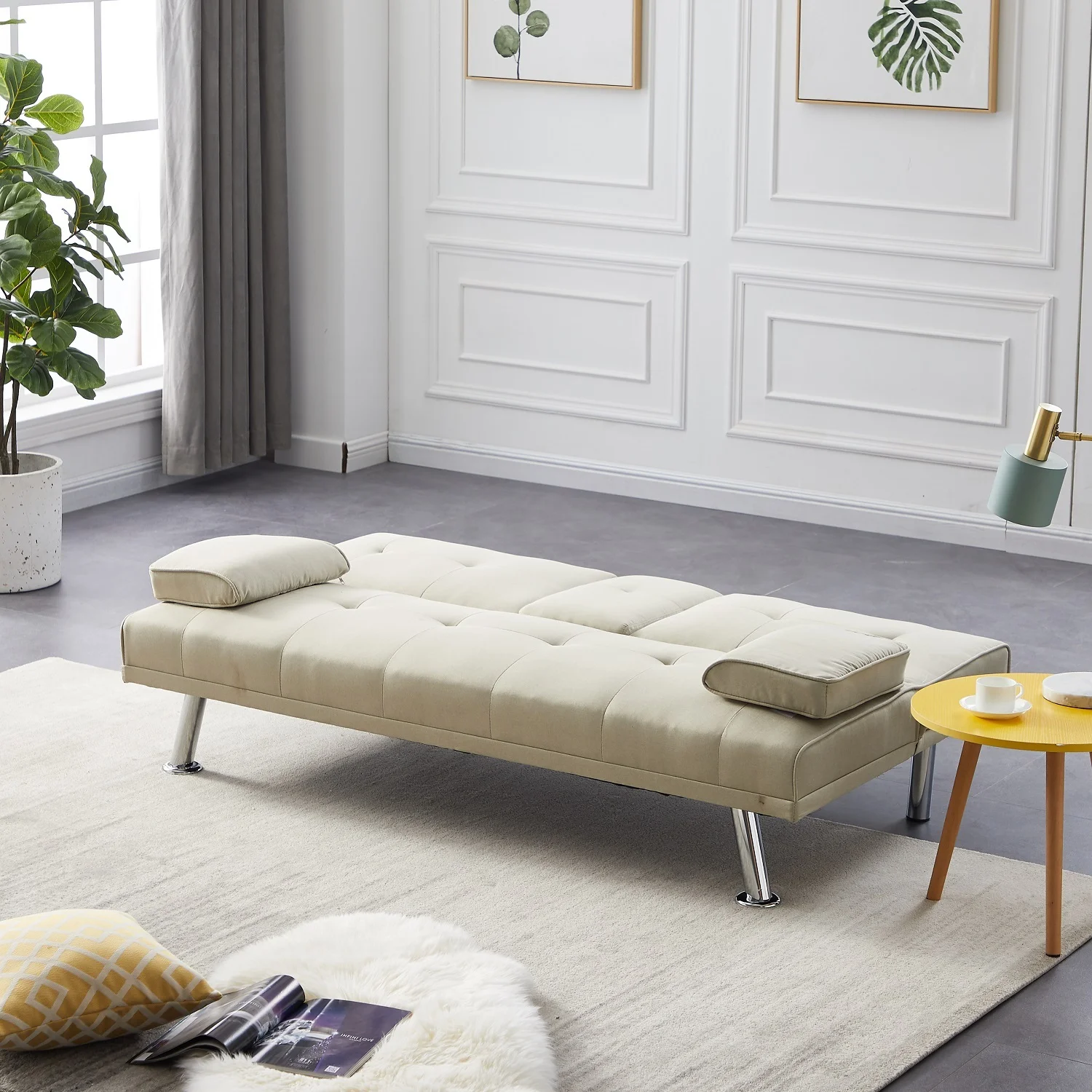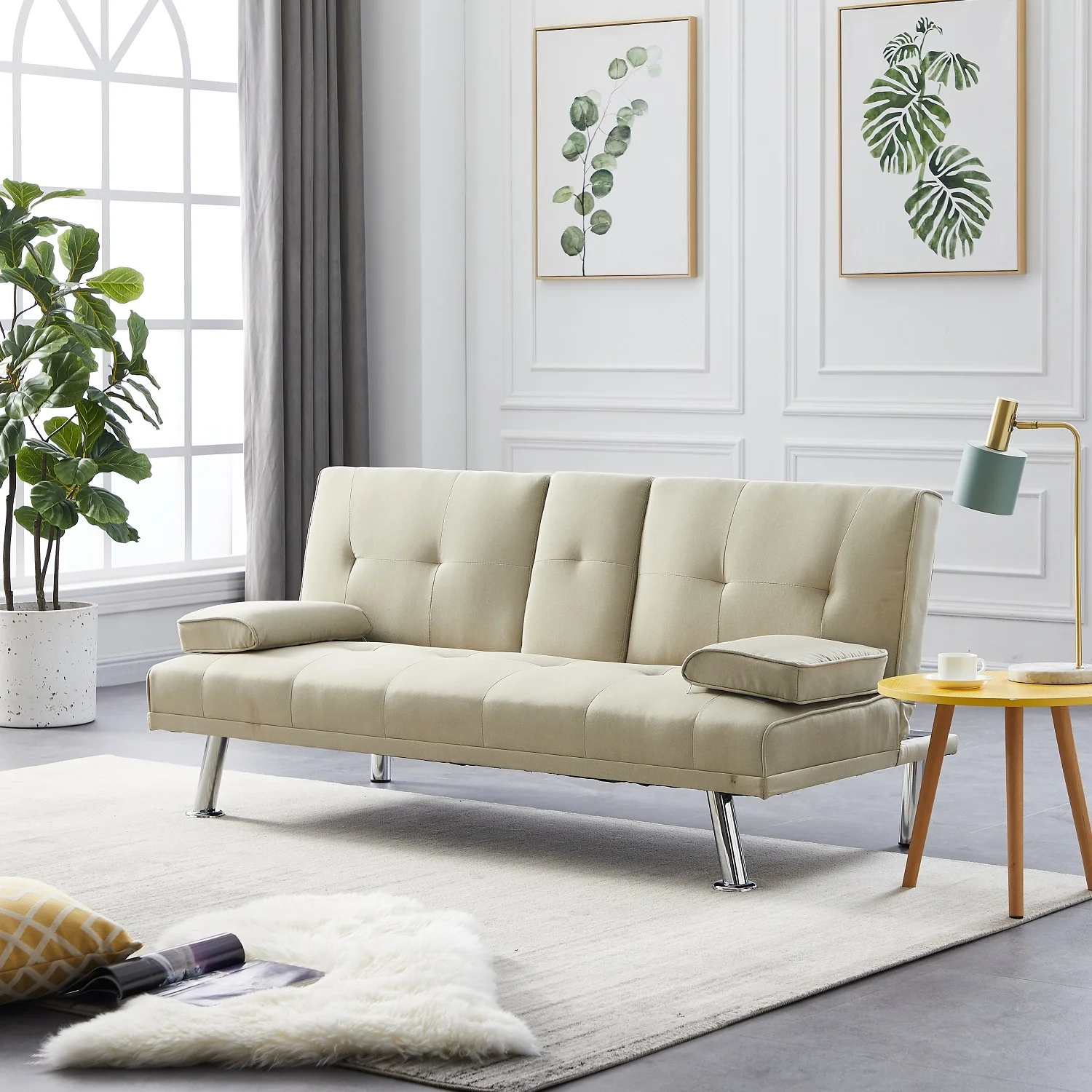 Dubbin Velvet Convertible Futon Sofa Bed with Removable Armrests,Metal Legs,and Cupholders - Beige