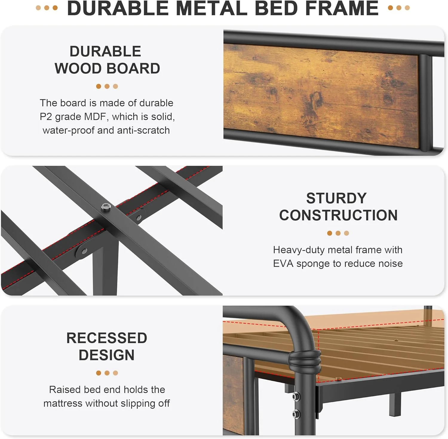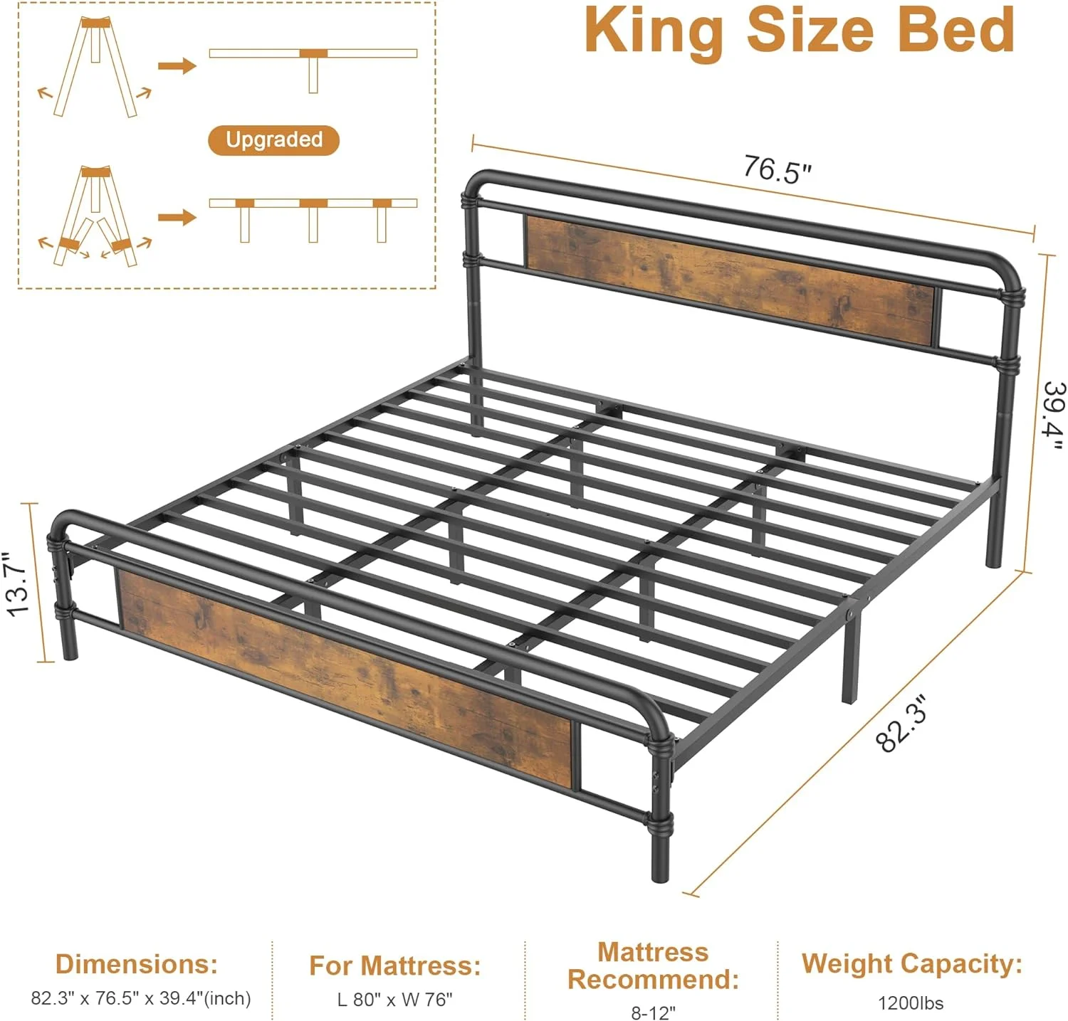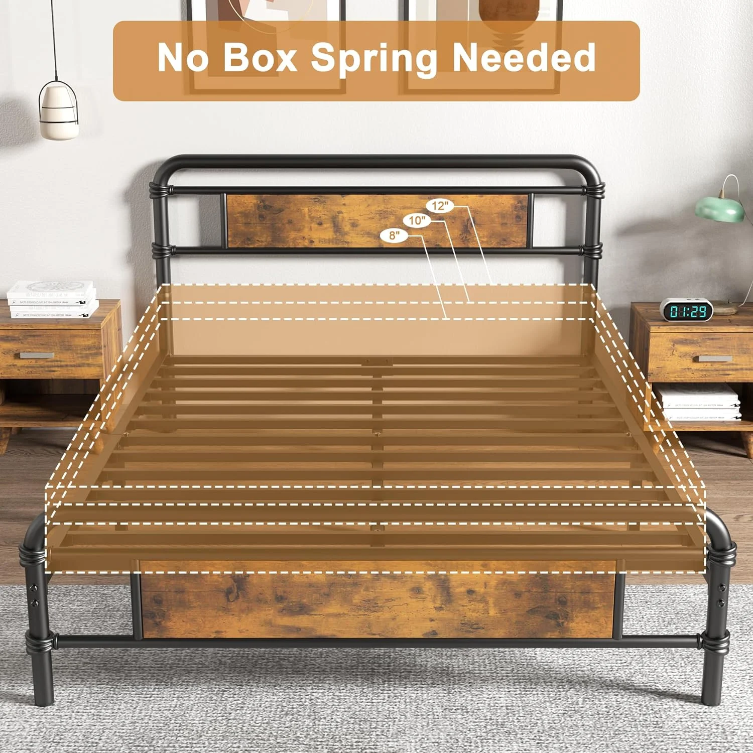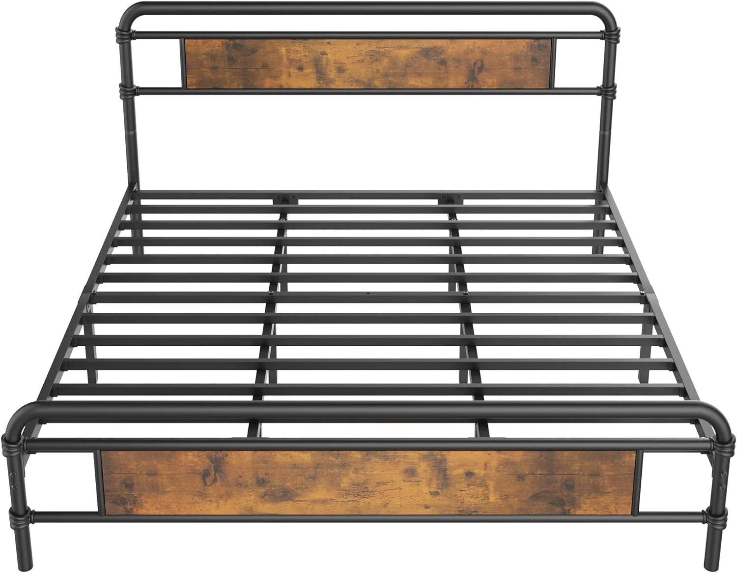 Brown Queen Size Metal Platform Bed Frame with Headboard & Footboard and Large Under Bed Storage
