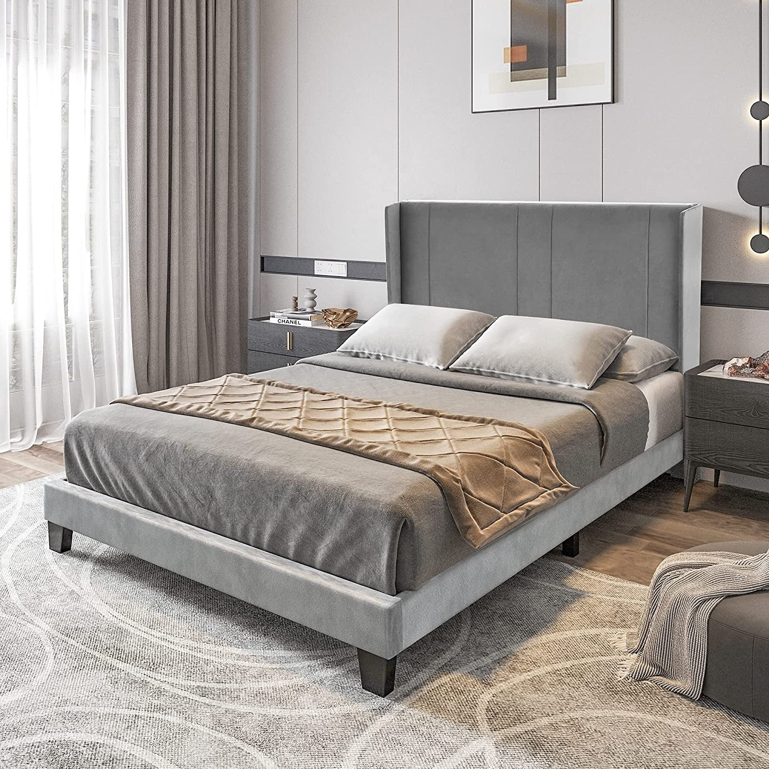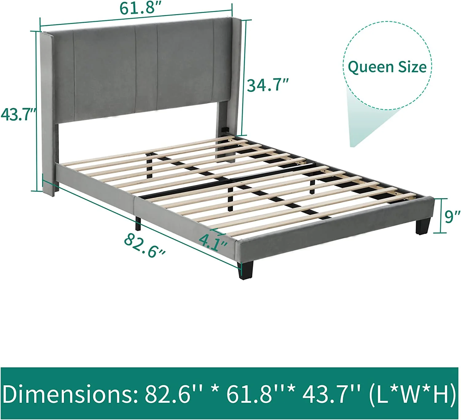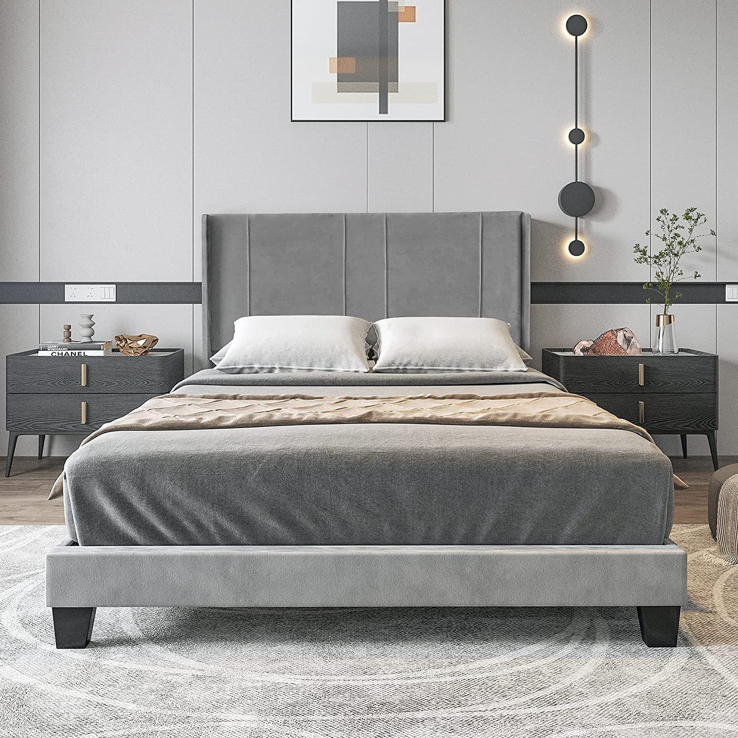 DWVO Upholstered Platform Bed Frame with Headboard Wood Slat Metal Frame (Queen)