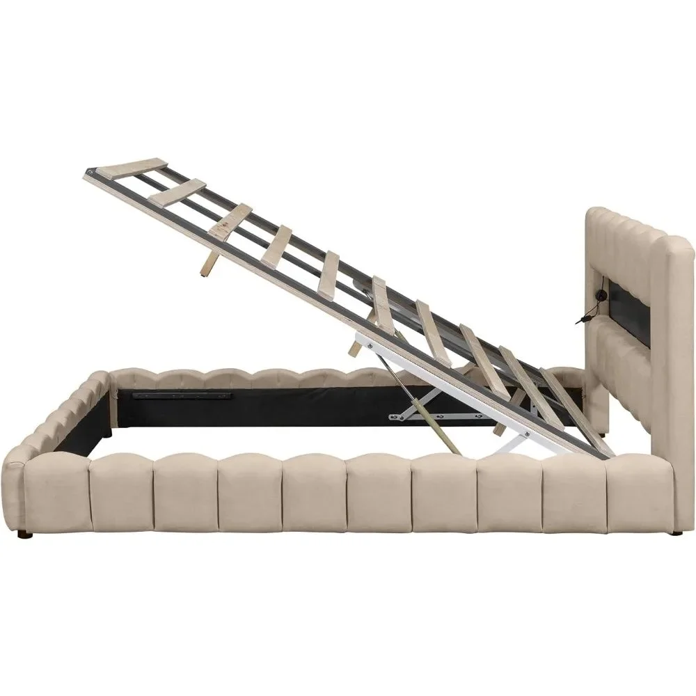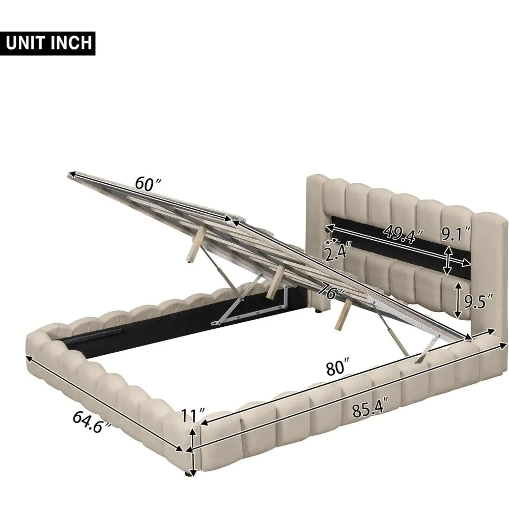 Large Linen Upholstered Platform Bed with LED Headboard, Wooden Slatted Support, Noiseless and Easy To Assemble