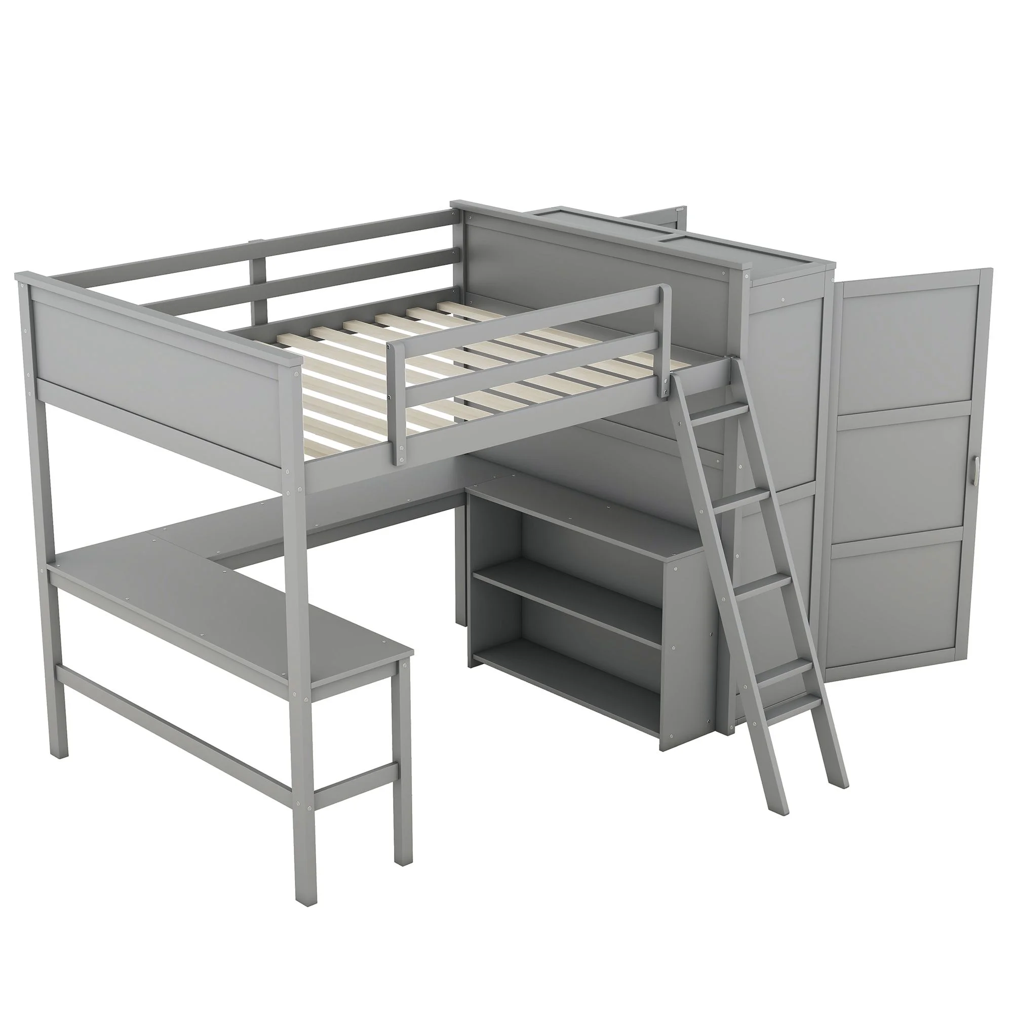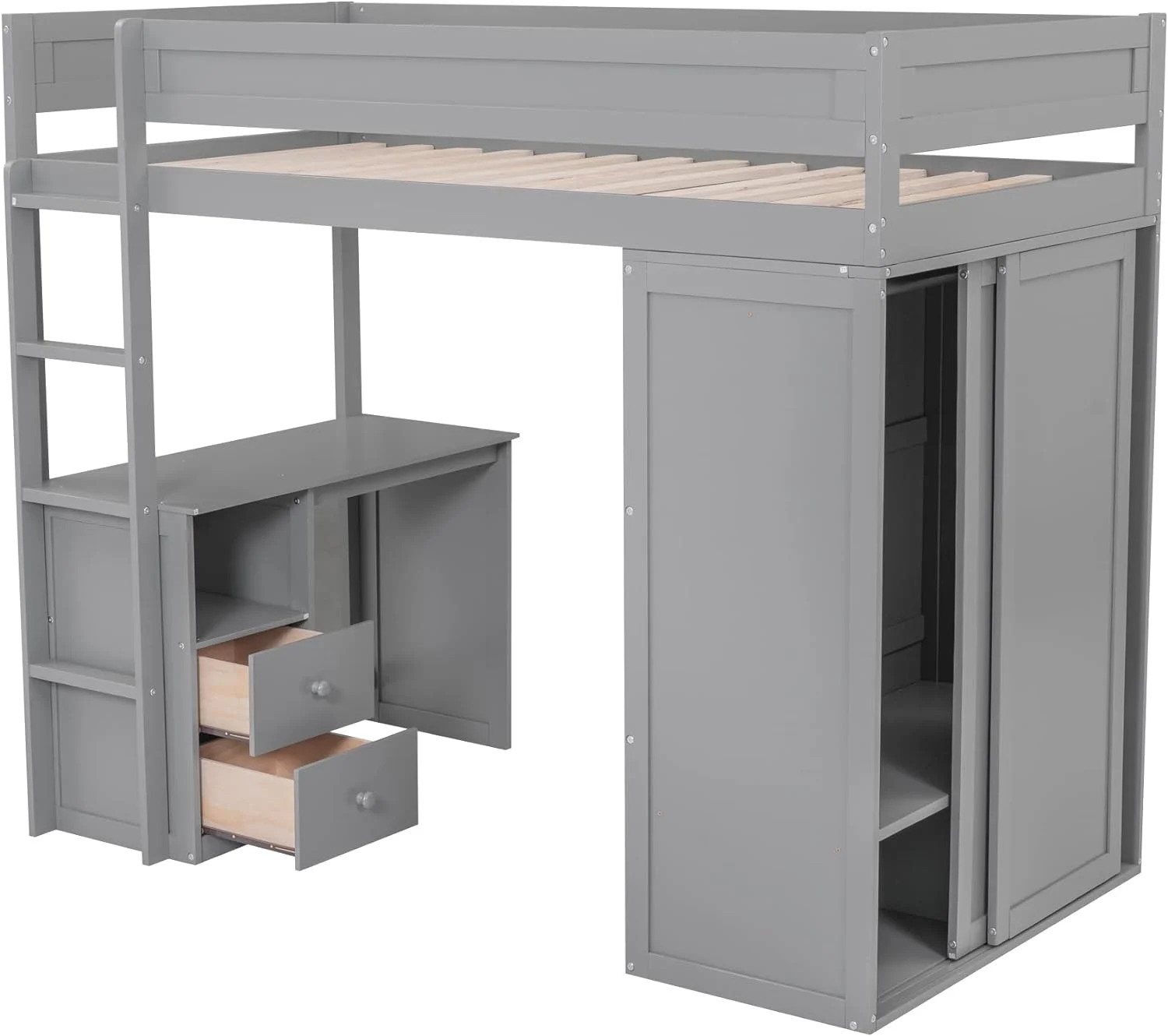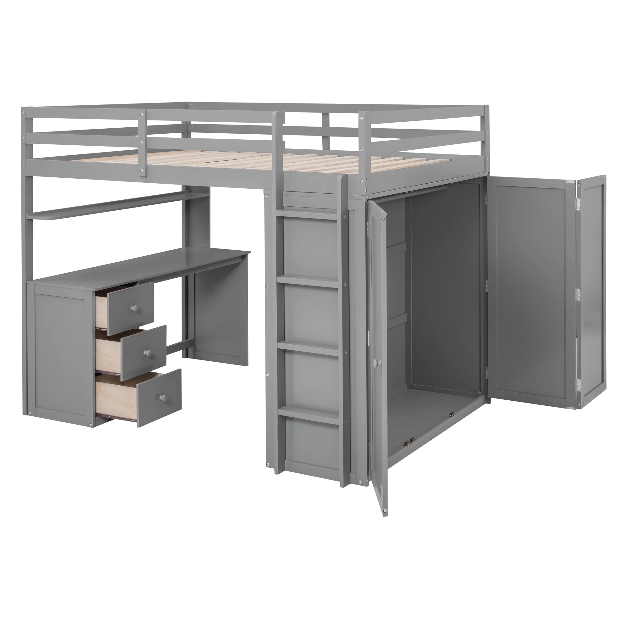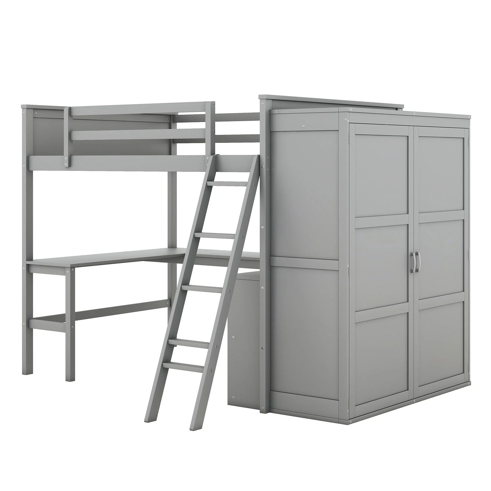 Churanty Full Size Loft Bed with Wardrobe and Built-in Desk, Solid Wood High Loft Bed Frame with Storage for Kids,Gray