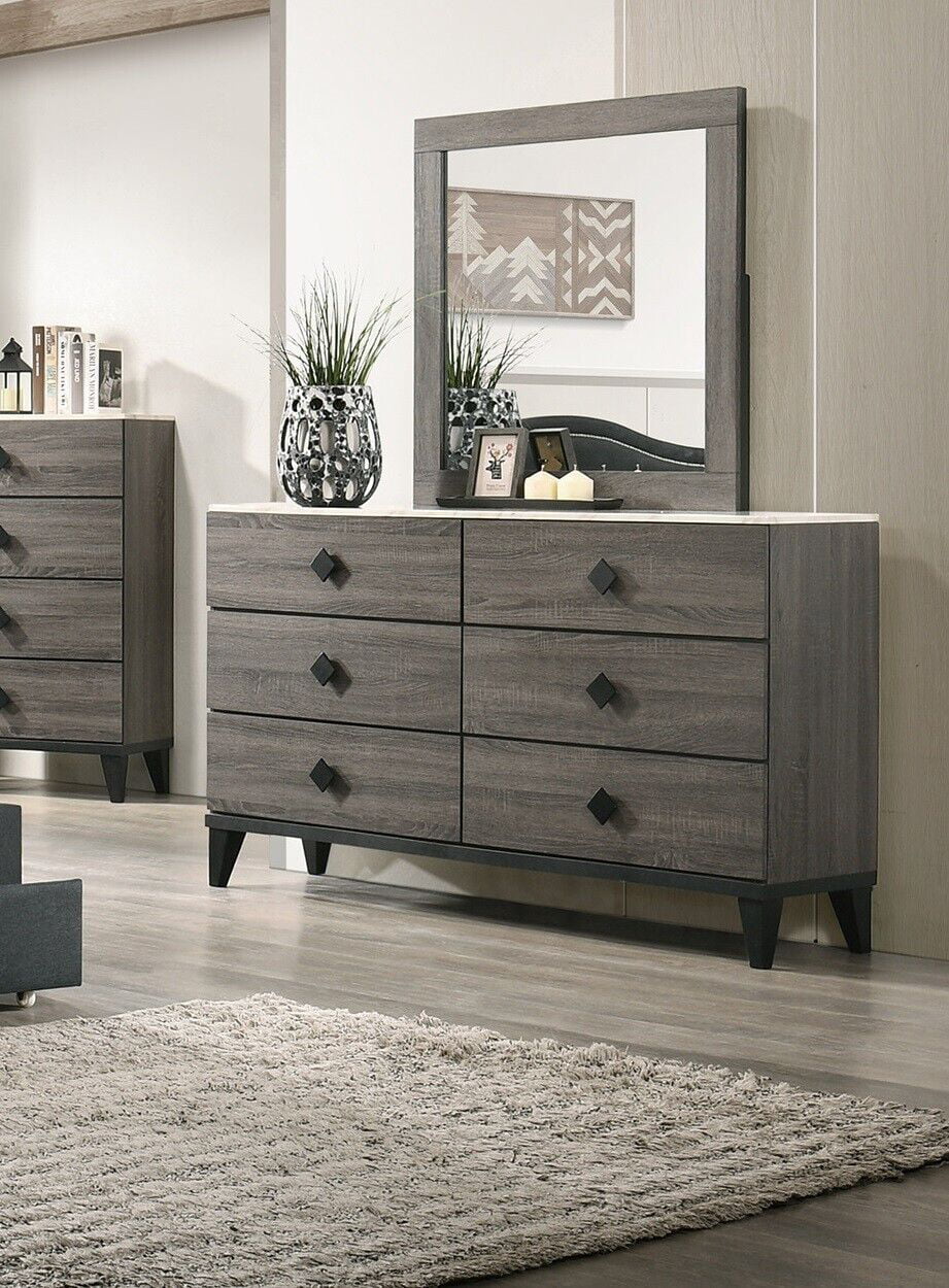 Contemporary Grey Hue Veneer 6pc Bedroom Furniture Eastern King Size Bed Dresser Mirror 2x Nightstands Chest Sleigh Bed Plywood