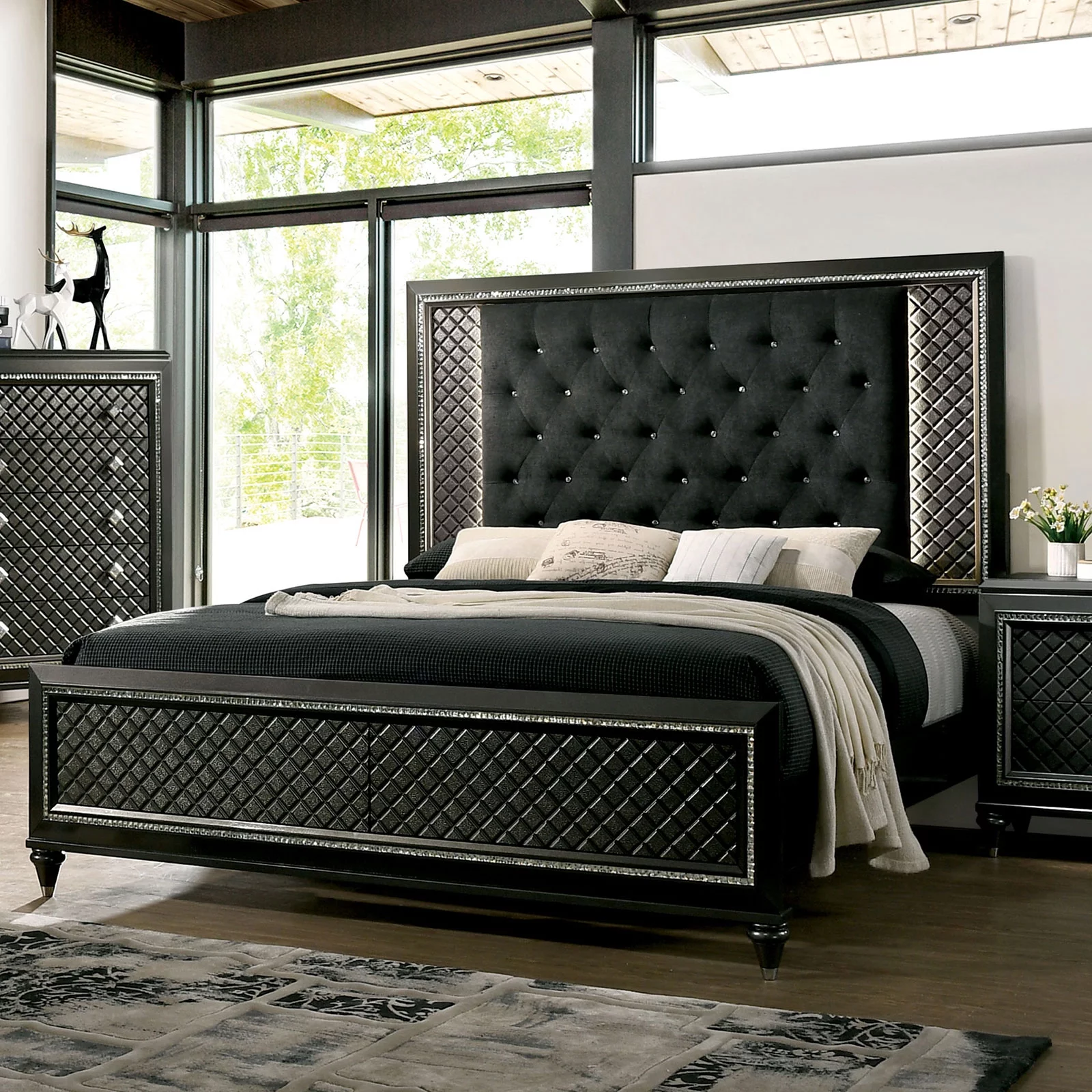 3Pc Silver Finish King Size Panel Upholstered Button Tufted Headboard Bed Nightstand Set Wooden Bedroom Furniture
