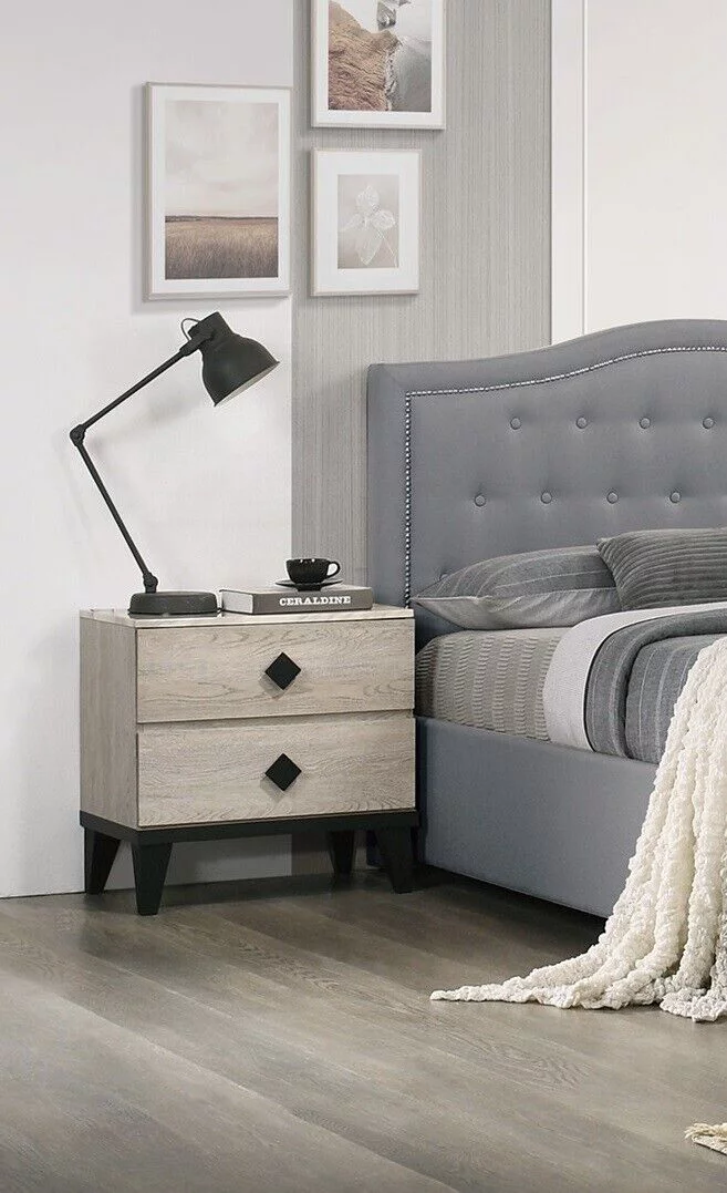 California King Size Bed And 2x Nightstands Gray Finish Transitional Wooden Bedroom Tufted Headboard Bedframe 3pc Furniture Set