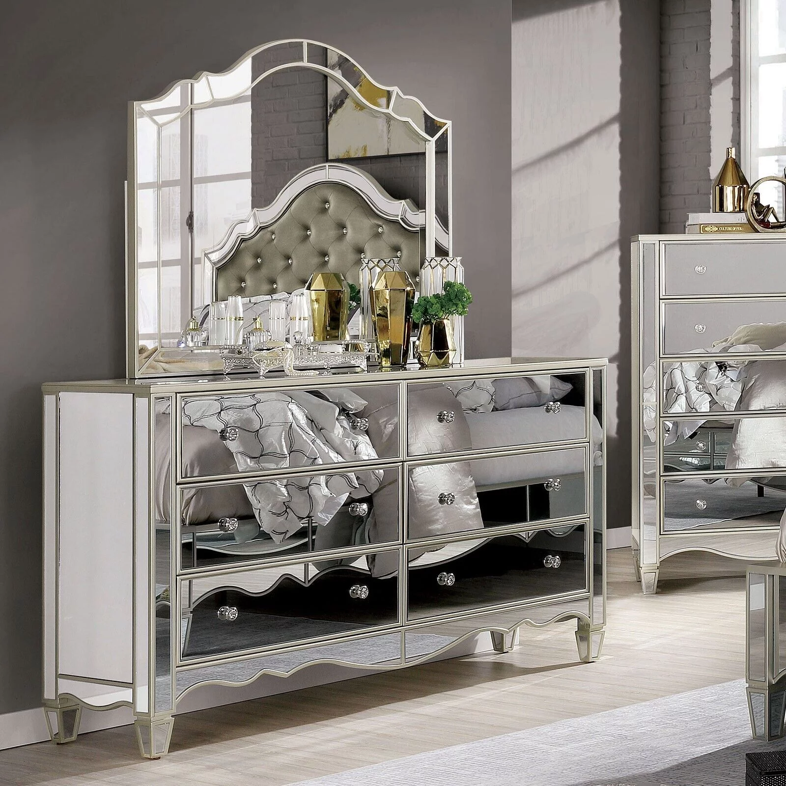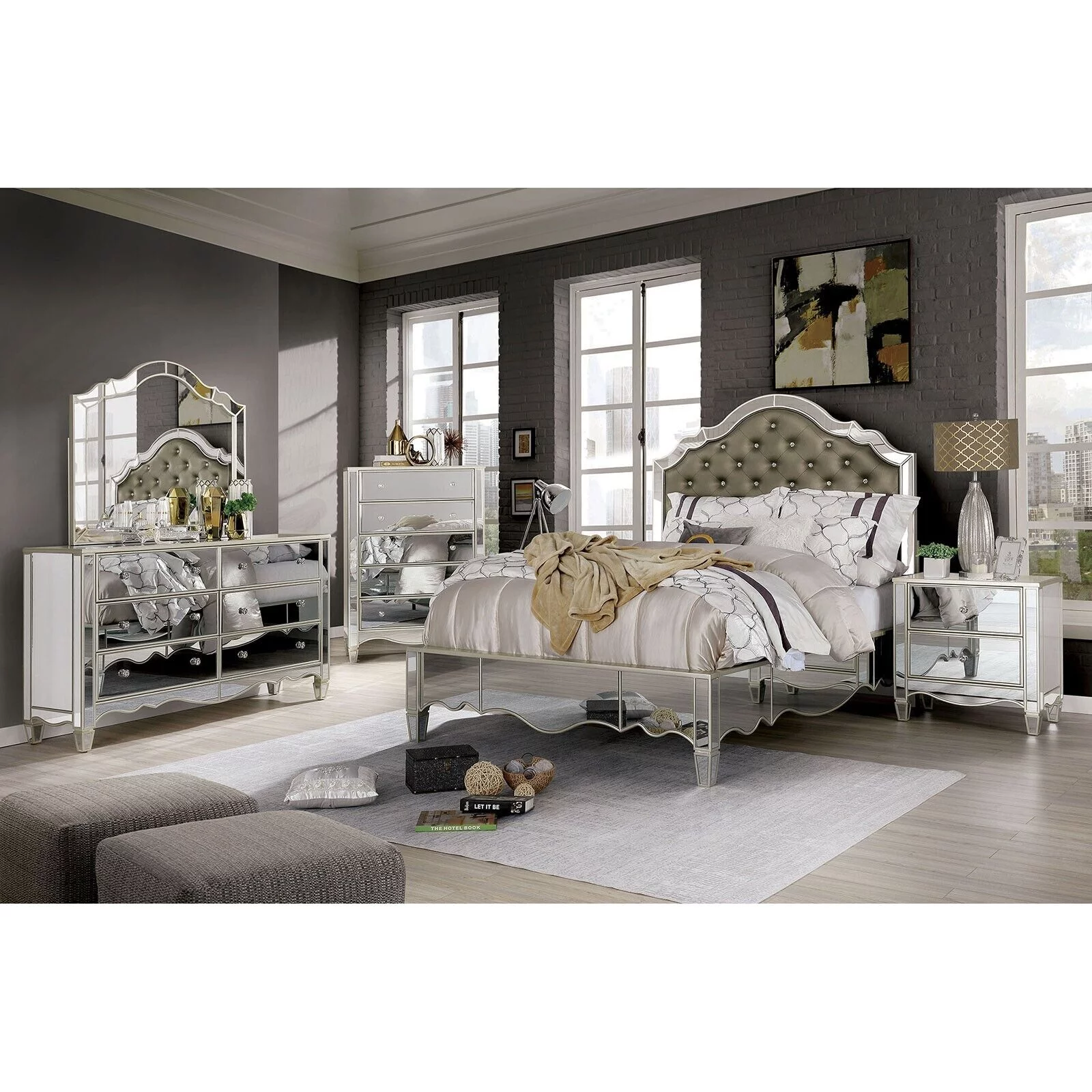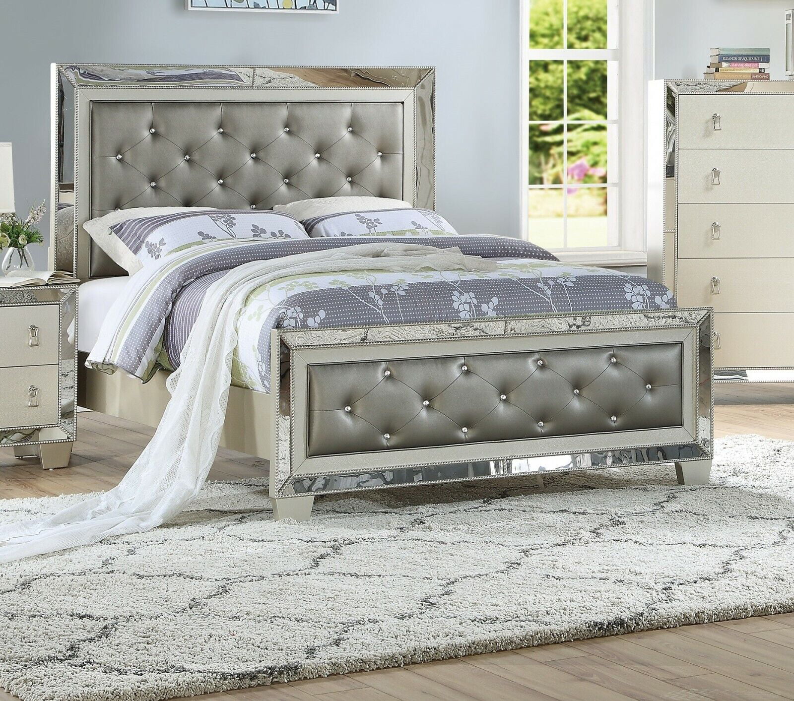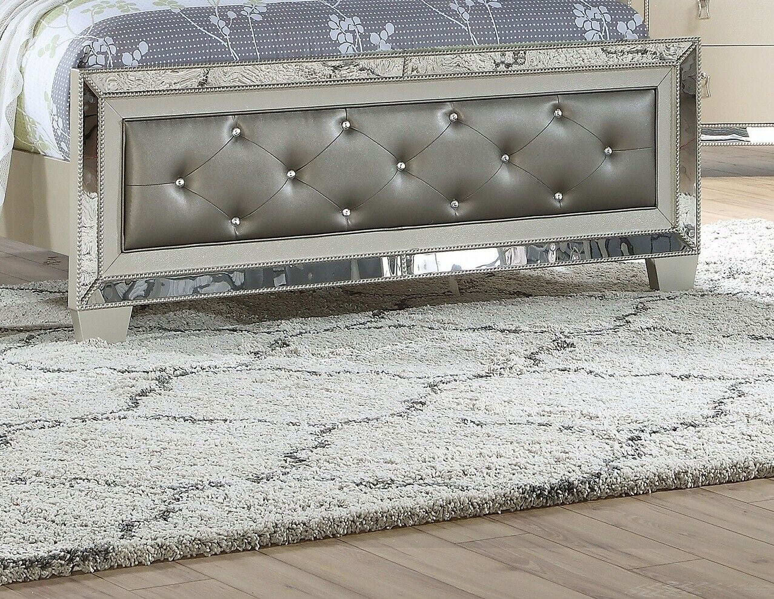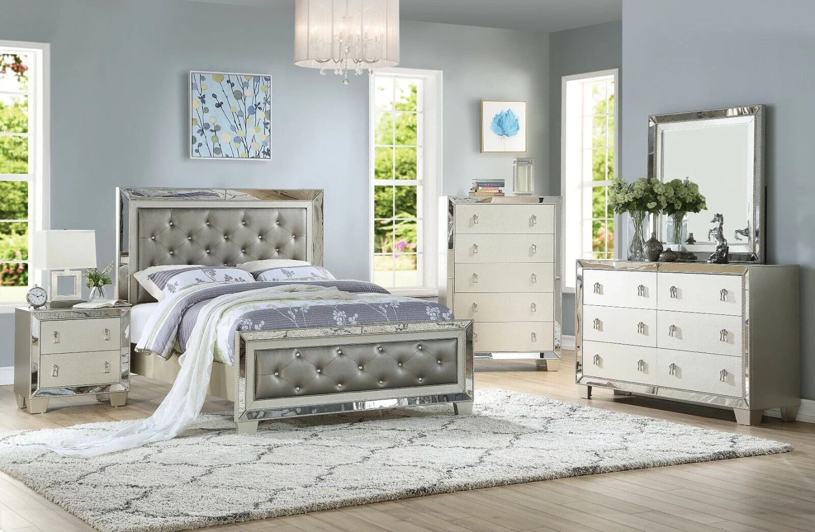 Glamour Traditional 4pc Bedroom Silver Color Cal King Size Bed Set Dresser Mirror Nightstand Mirror Panel Tufted HB Bedframe