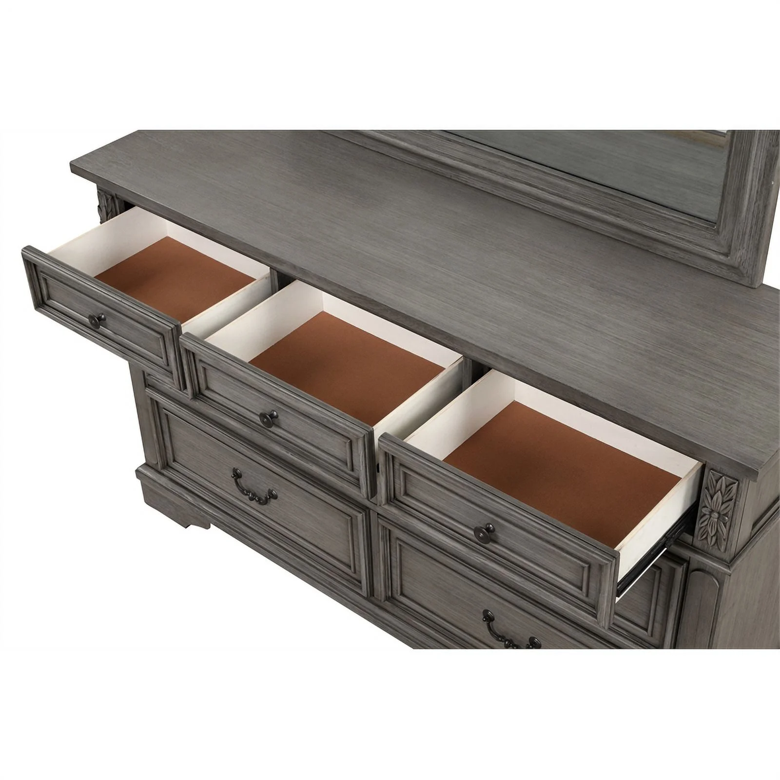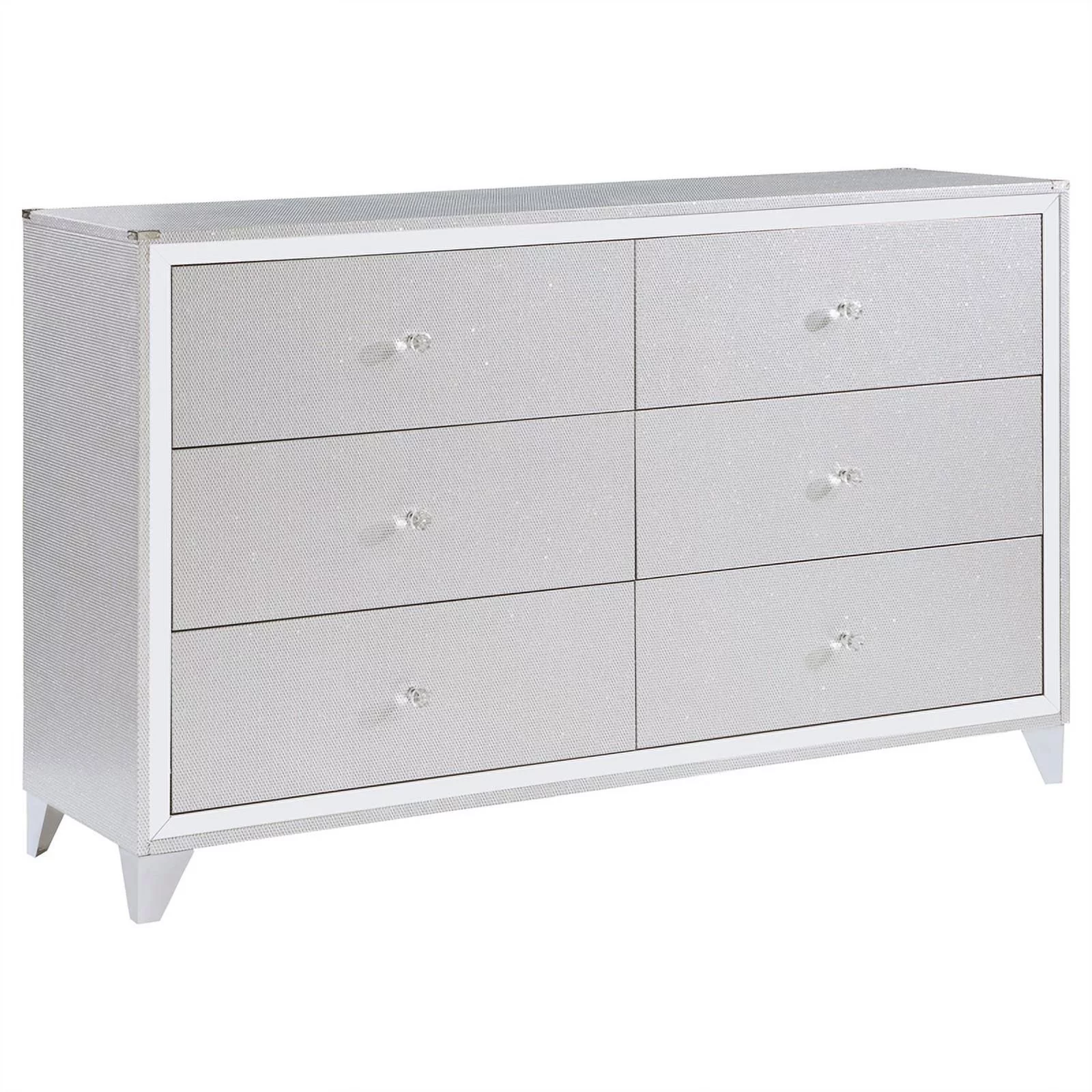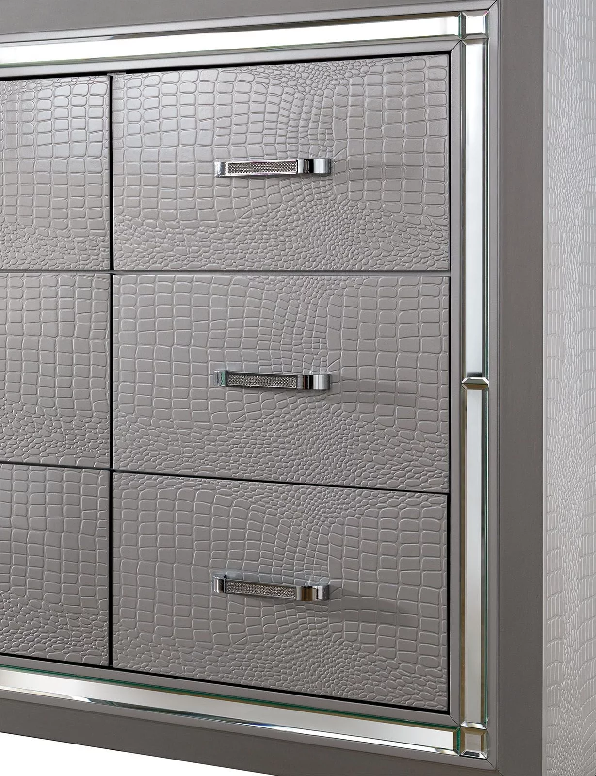 California King Size Bed 6pc Set Faux Leather Tufted Headboard Dresser Mirror Nightstand Silver Finish Antique Bedroom Furniture
