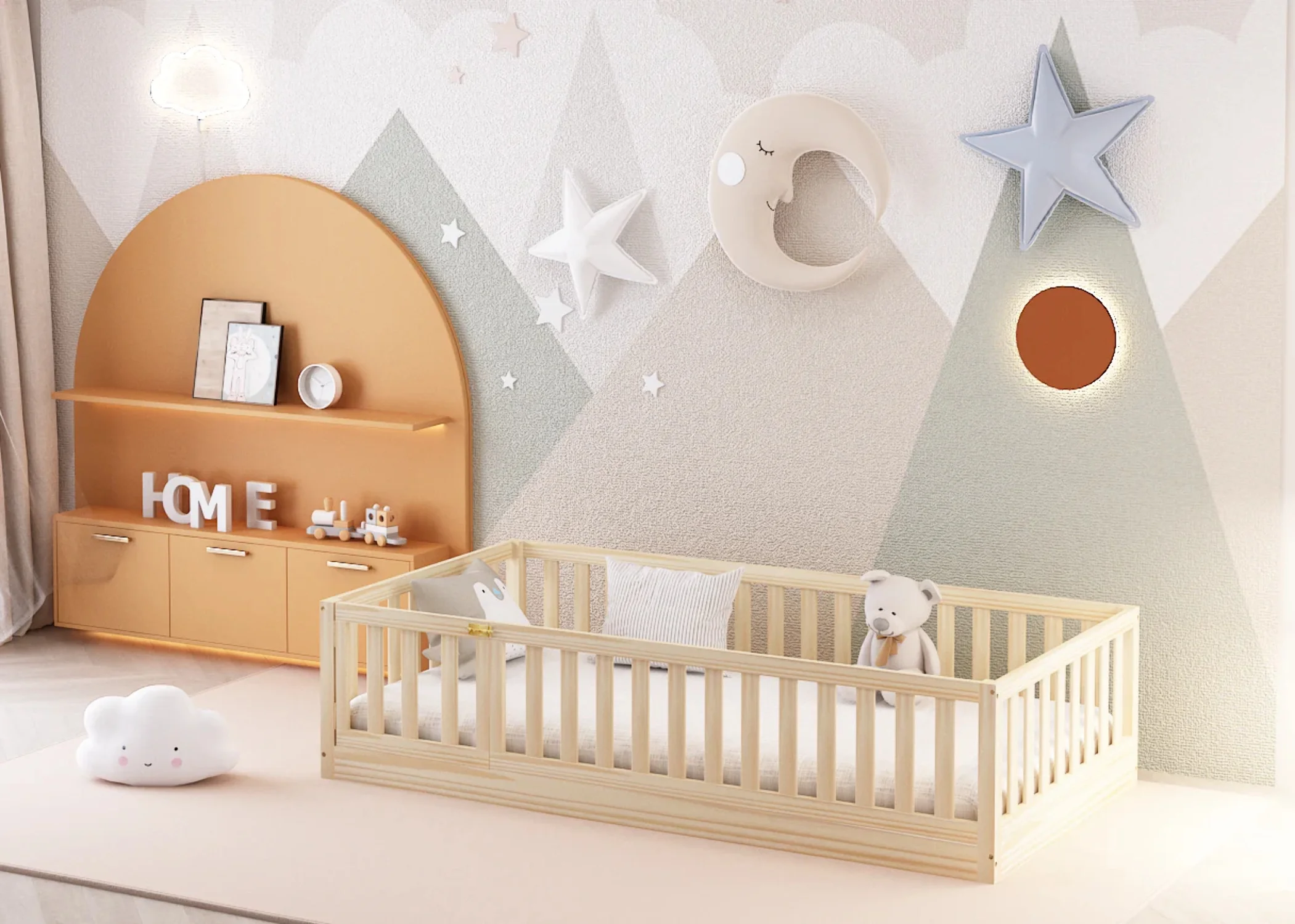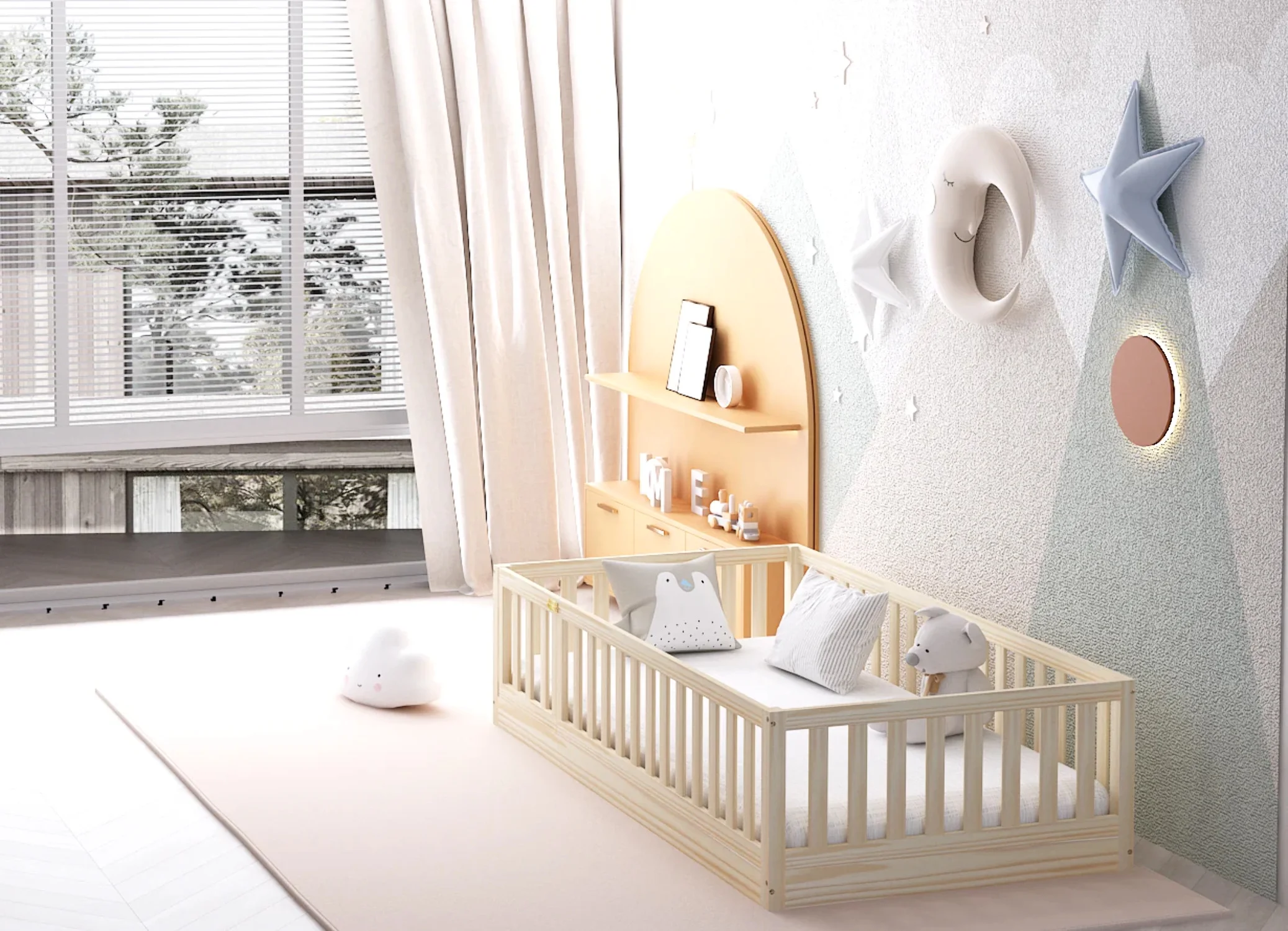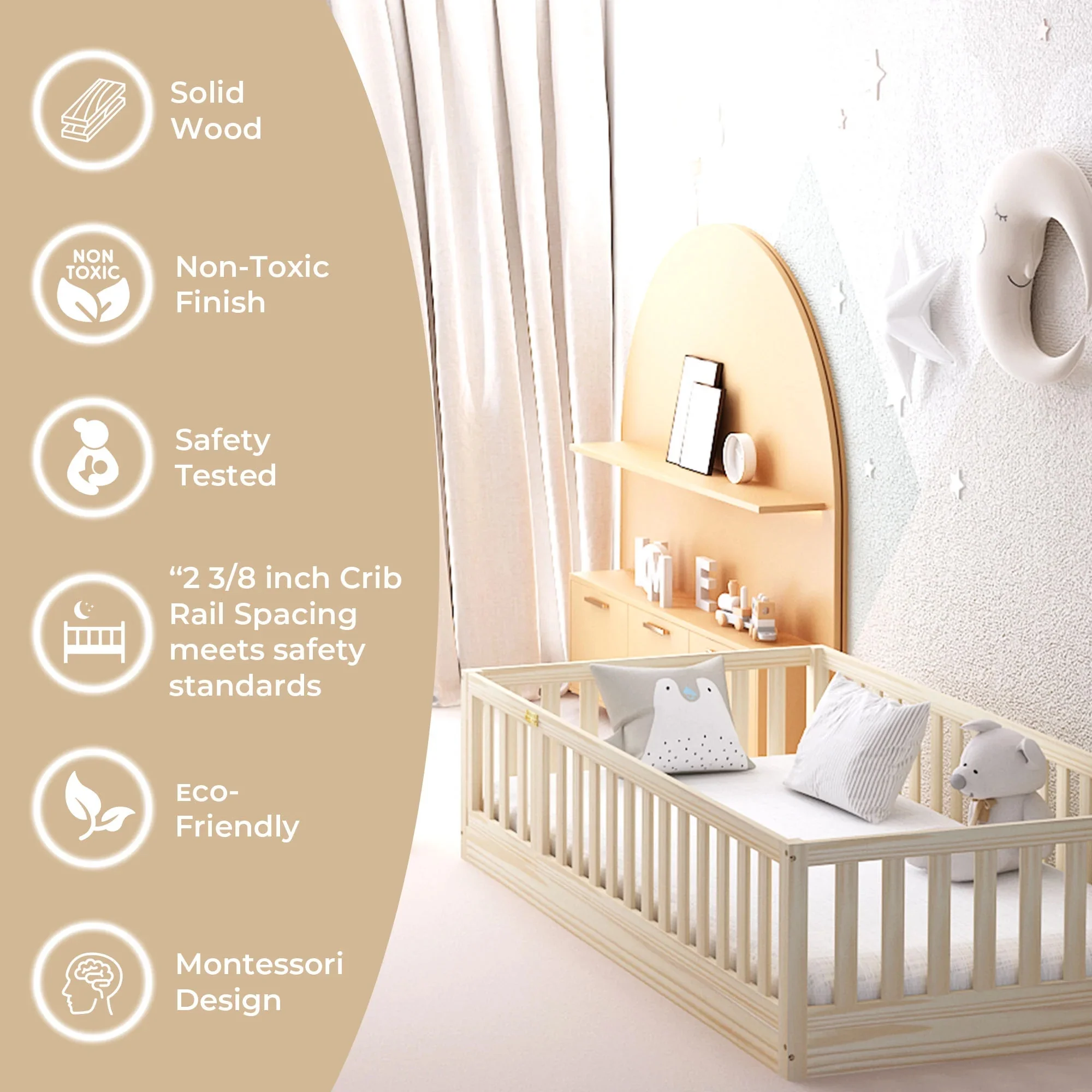 Custom Kids Furniture Hardwood Gianna Toddler Floor Bed with Slats and Gate