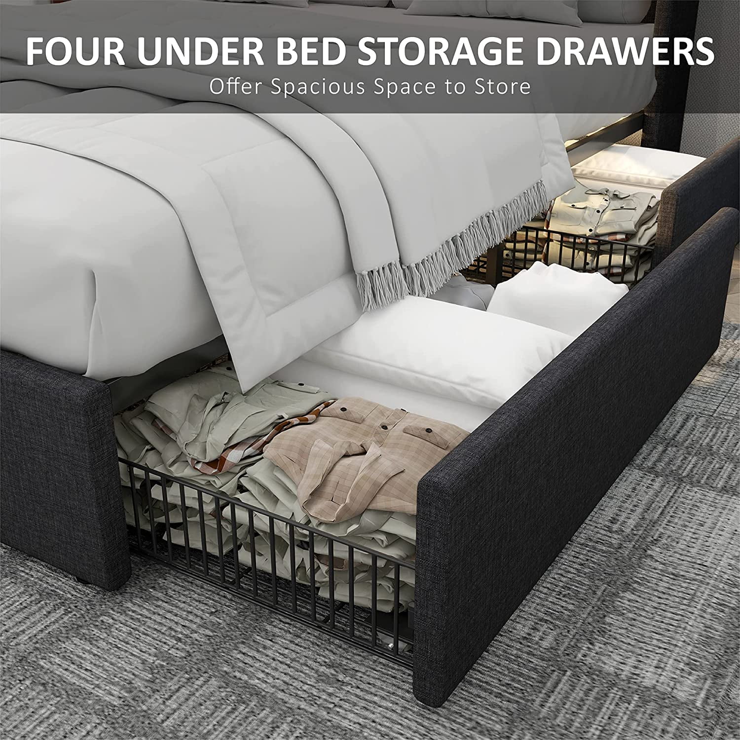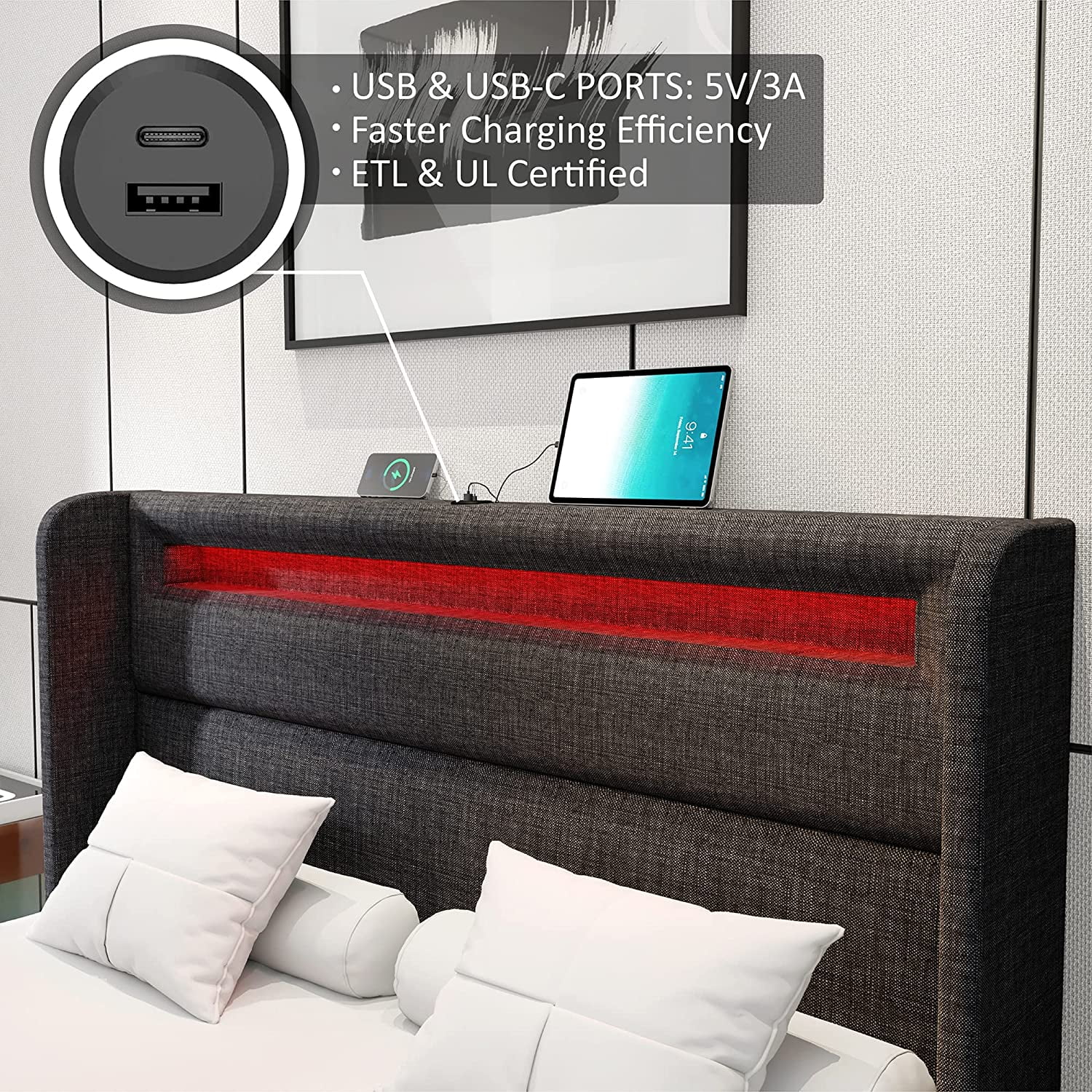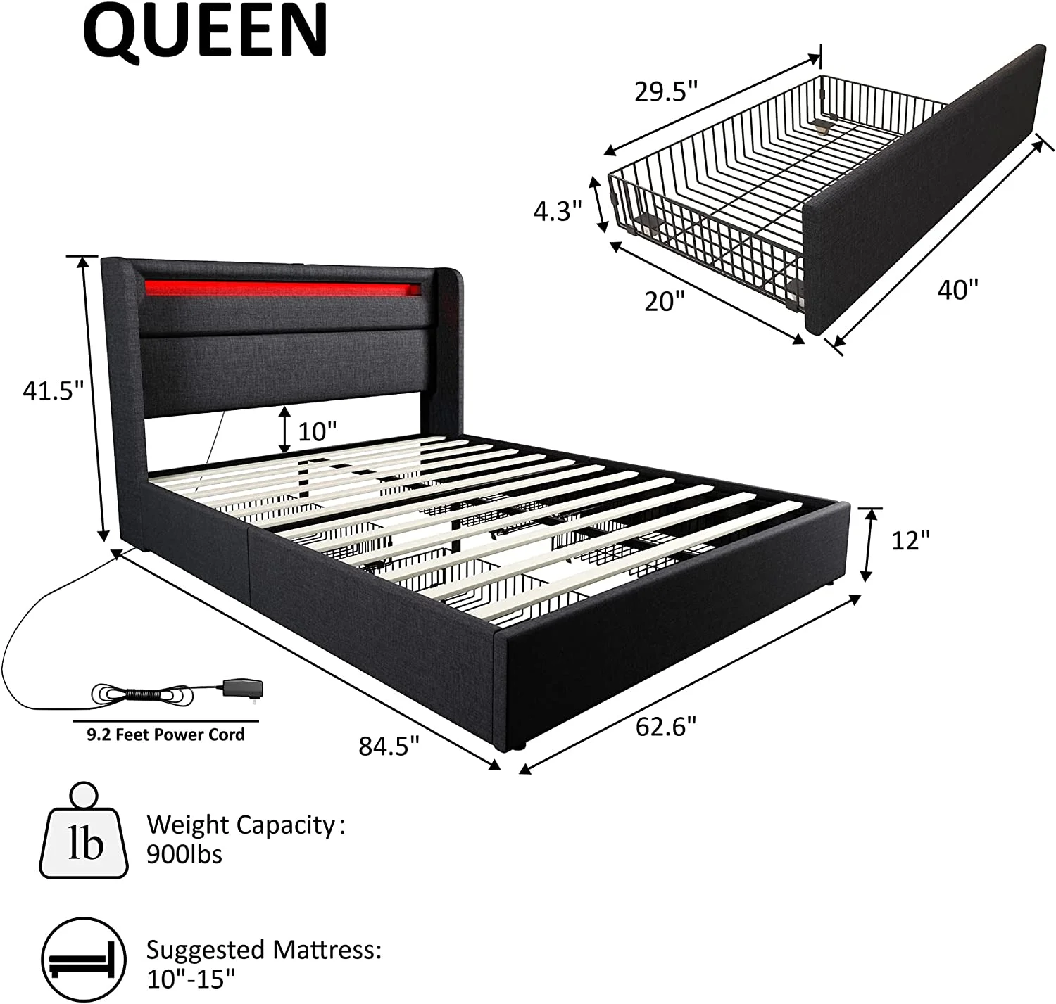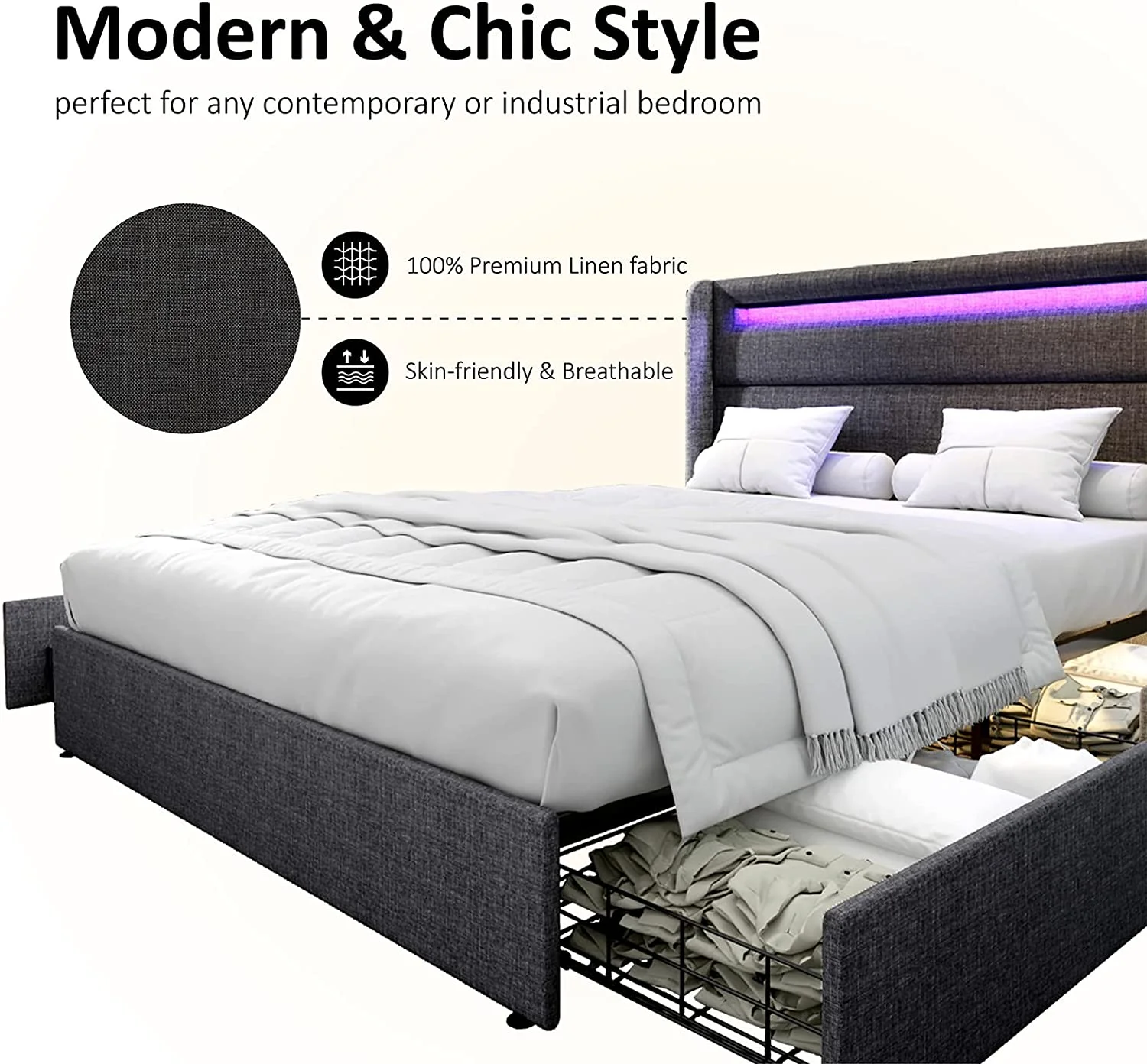 AMERLIFE Queen Upholstered Bed Frame with RGBW LED Headboard, 4 Storage Drawers & USB Ports, Dark Grey
