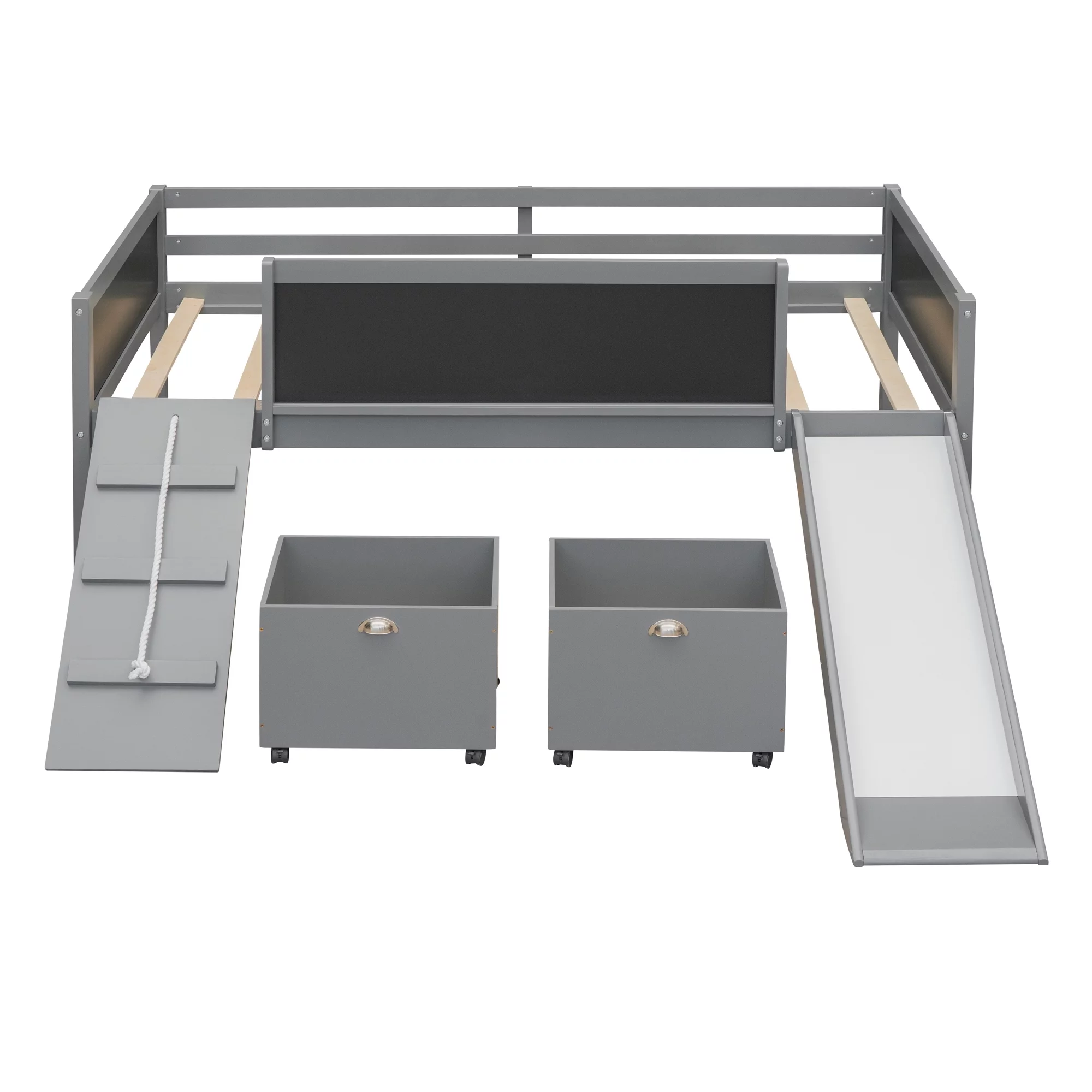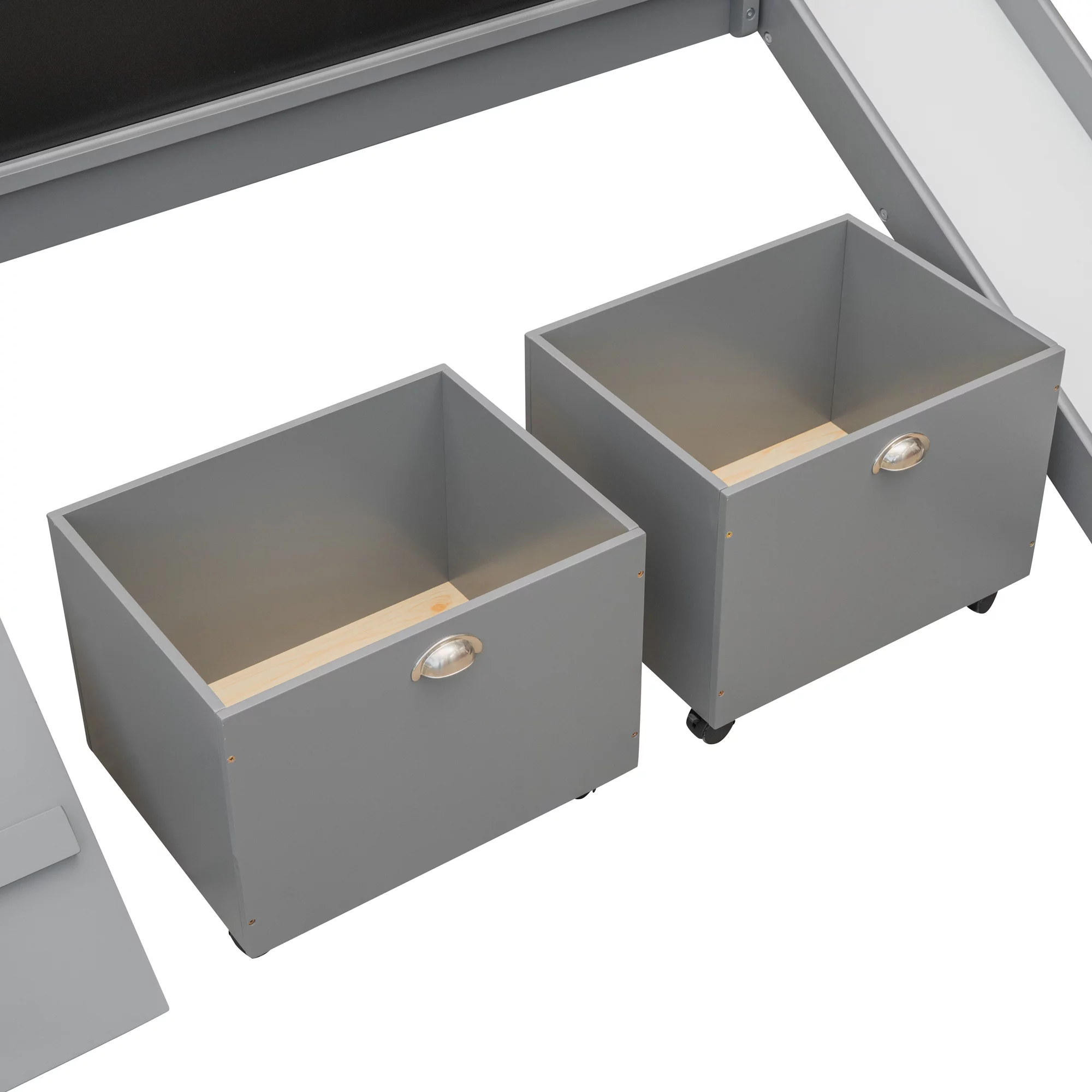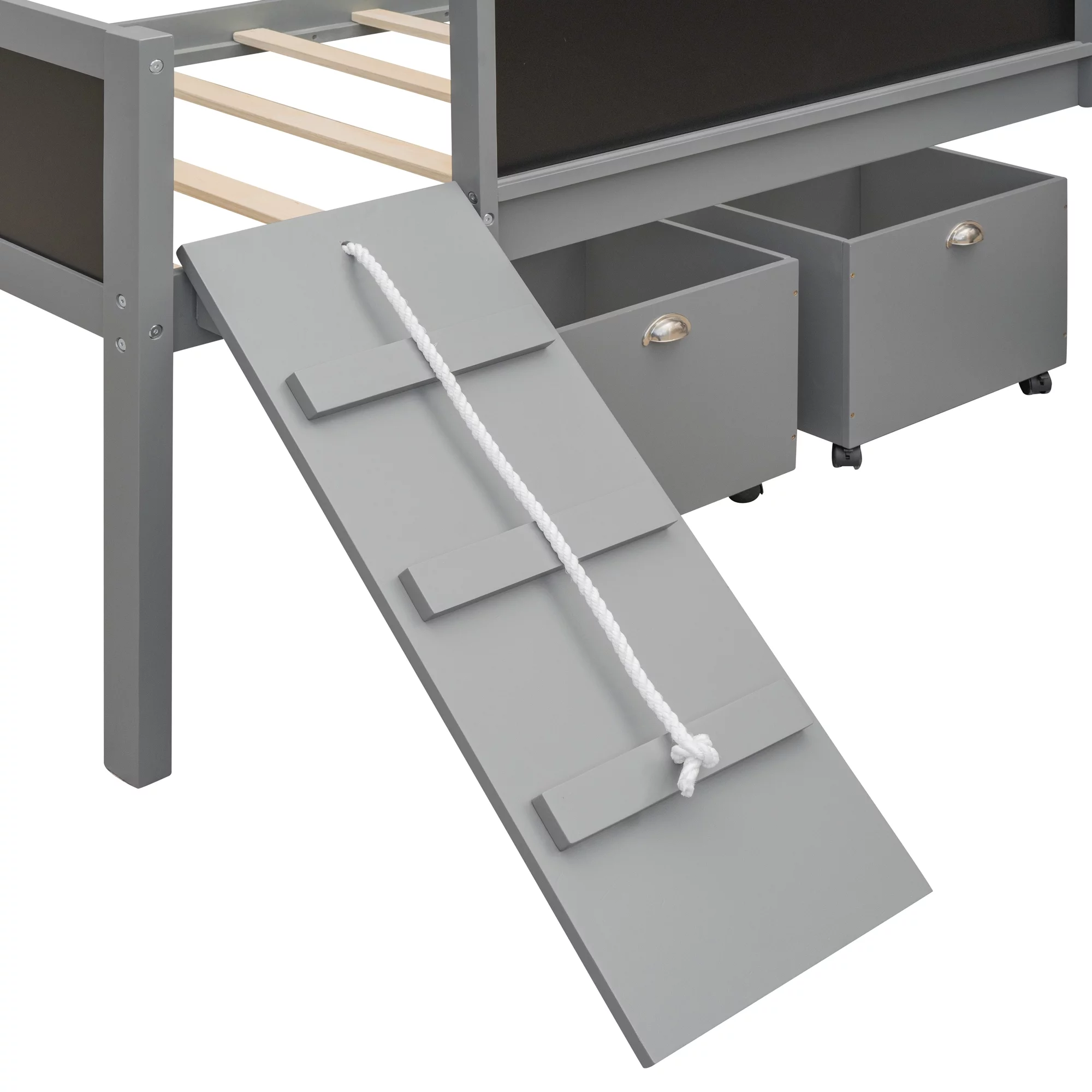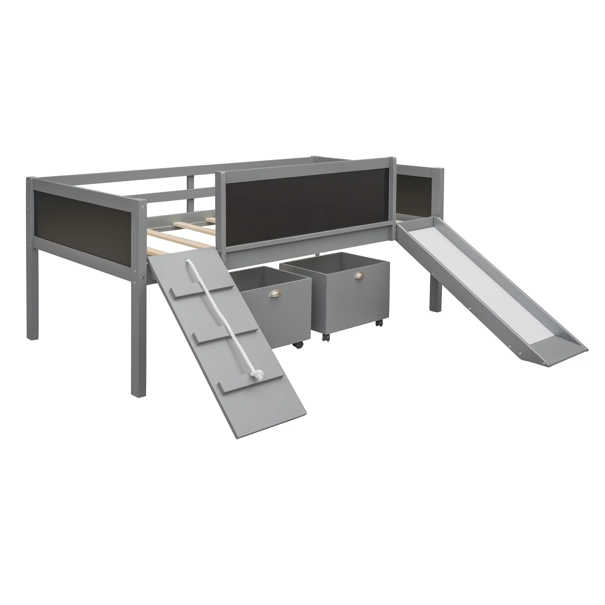 Gewnee Twin Size Wood Loft Bed with Slide,Climbing Frame,Two Movable Drawers and Chalkboard for Kids,Gray