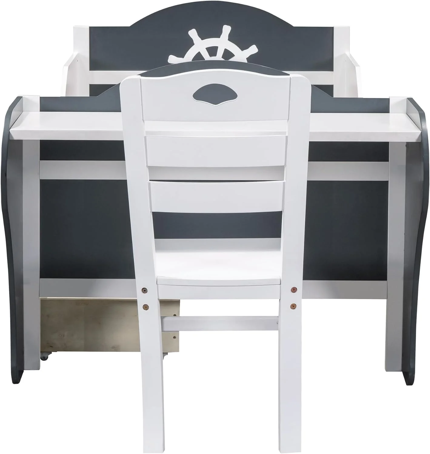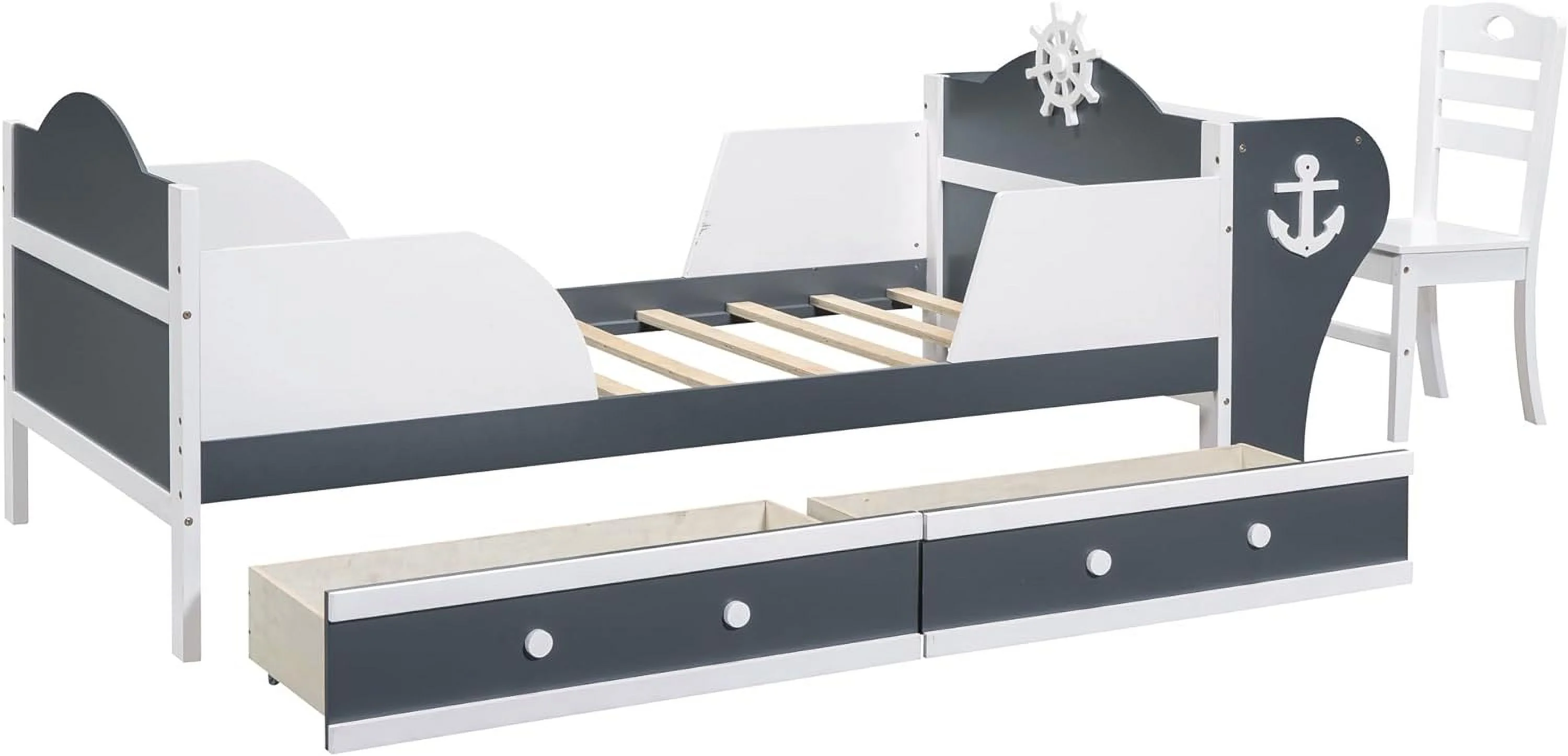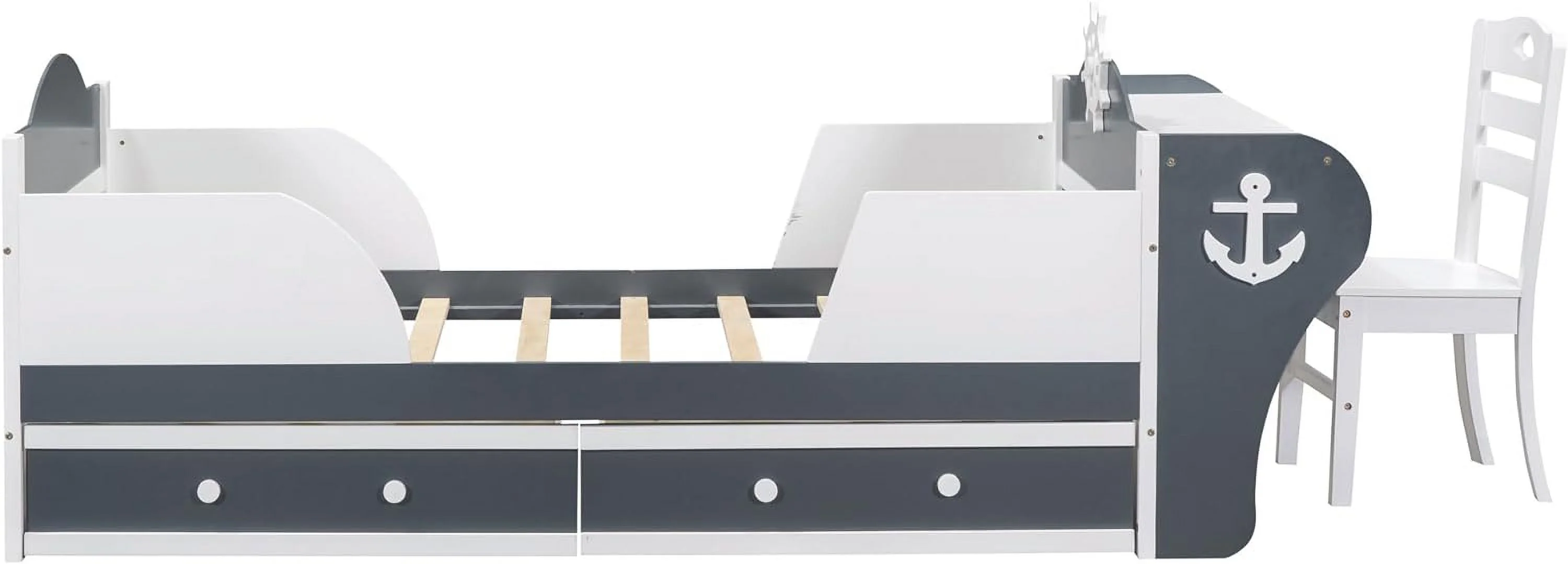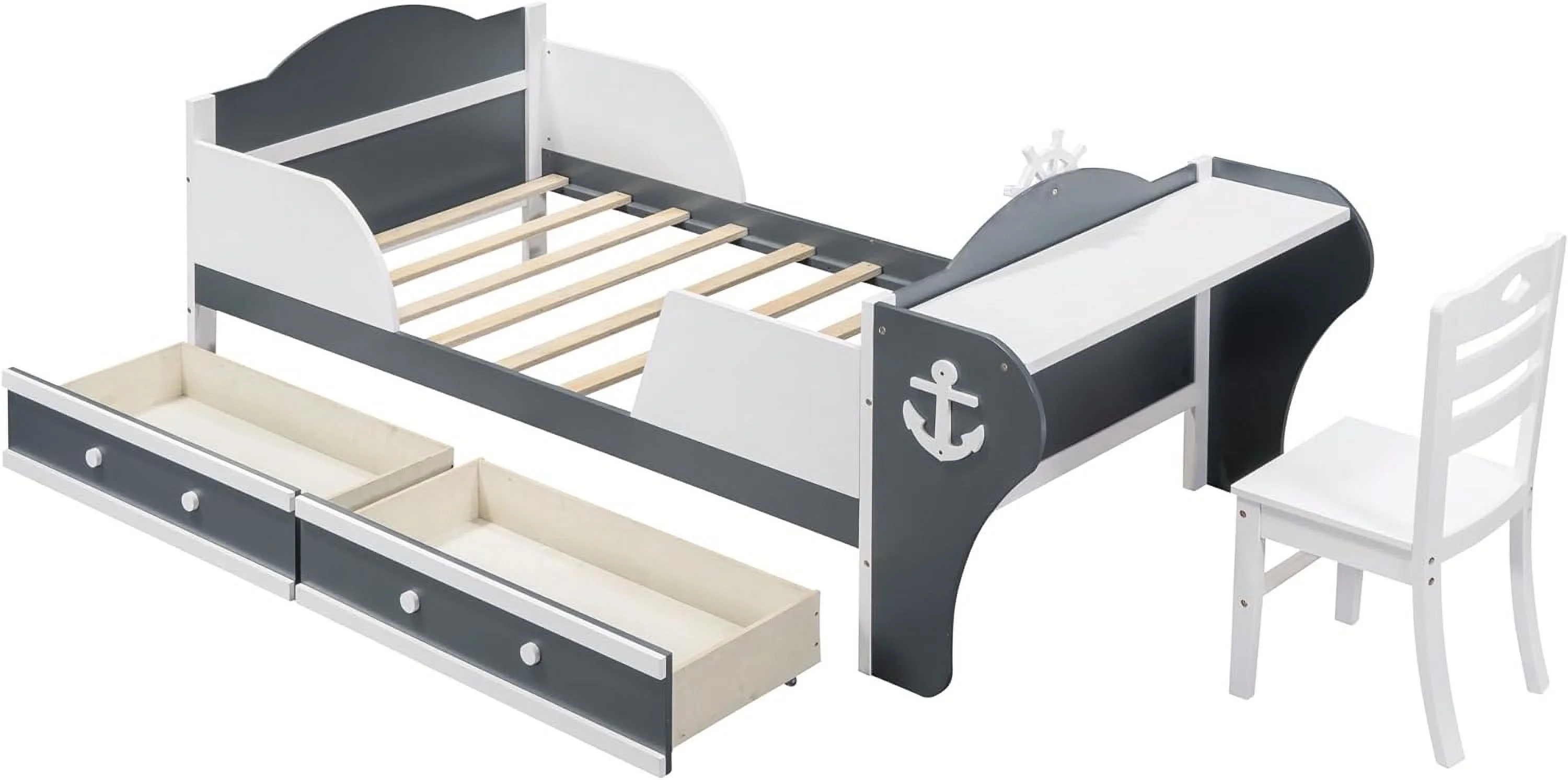 Size Boat-Shaped Platform Bed Frame For Boys Girls Kids Toddler With Two Drawers, Bed With Desk Ad Chair For Bedroom,White Gray