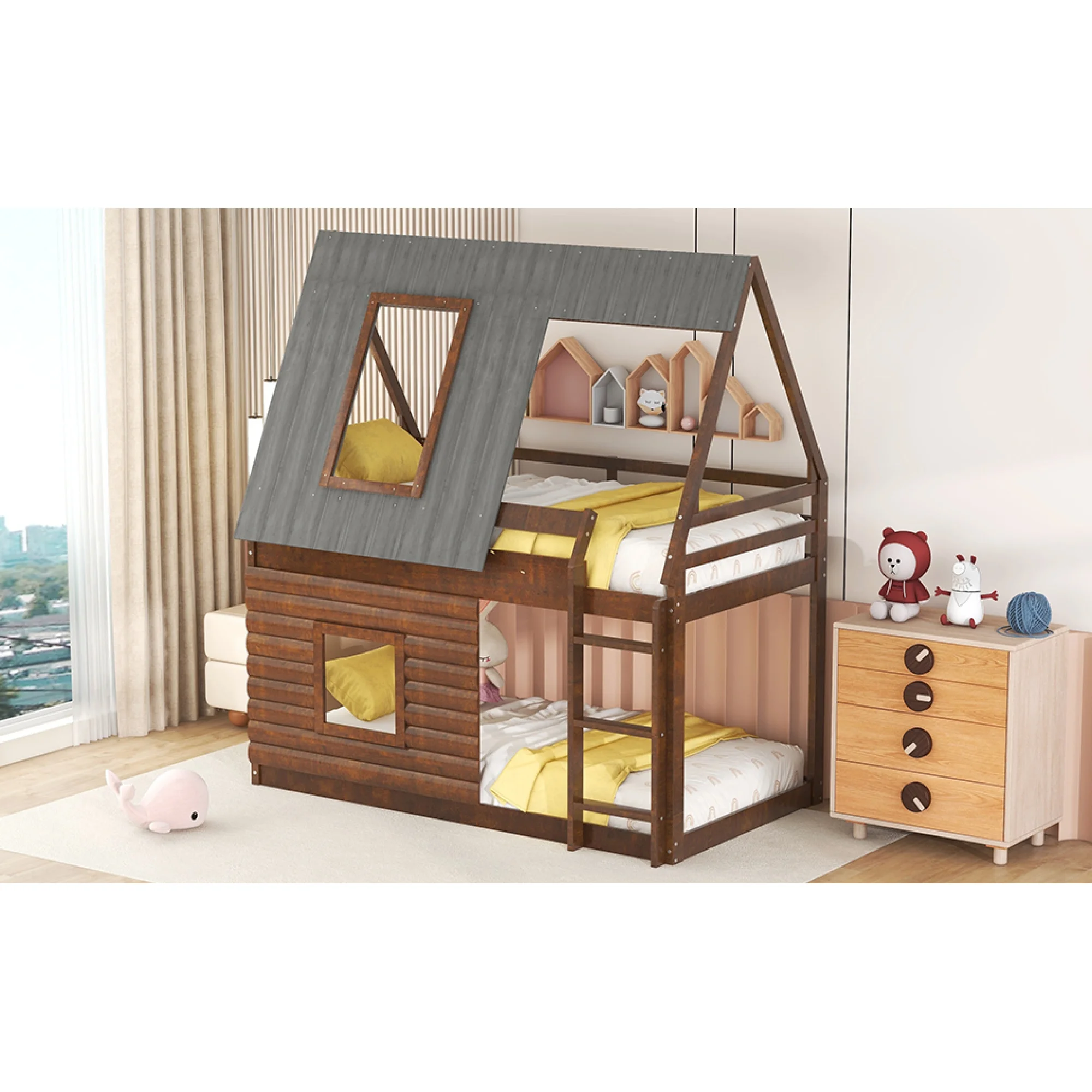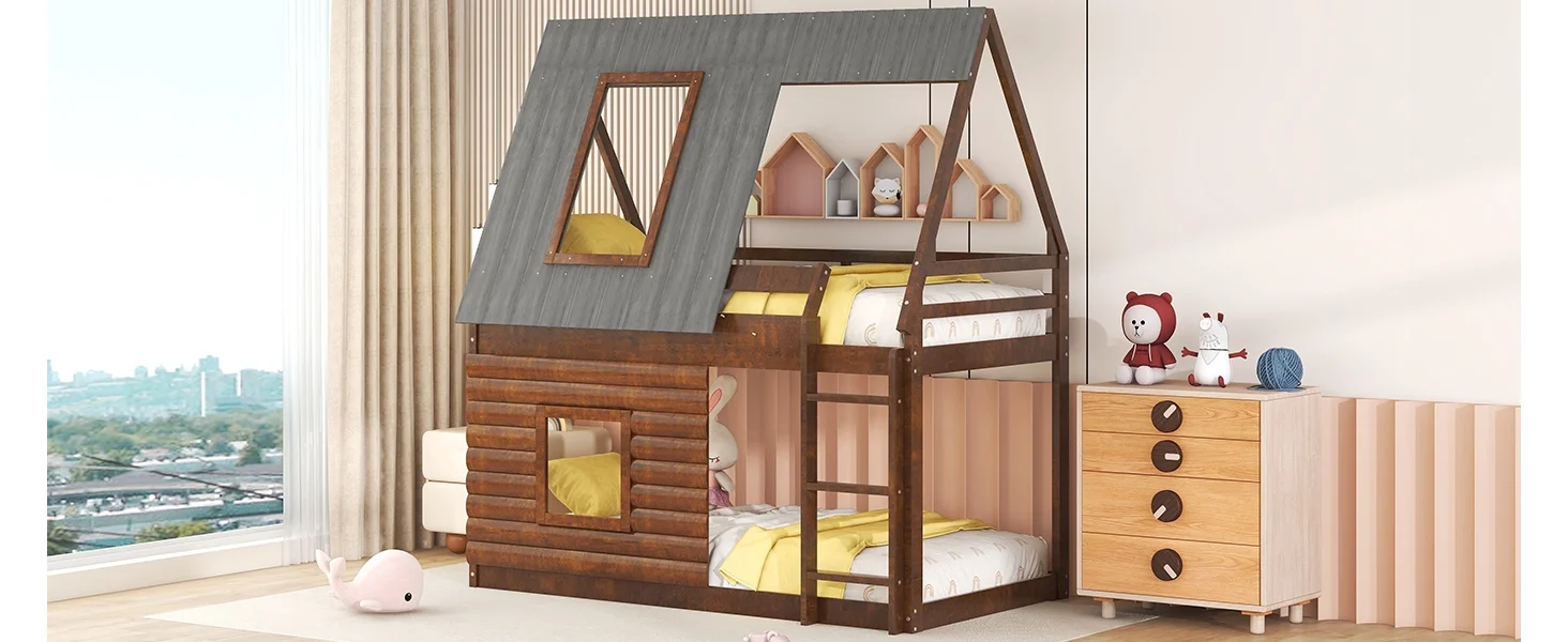 "Oak and Smoky Grey Wood Twin-Size House Bunk Bed with Roof, Ladder, and Windows for Cozy Sleepovers"