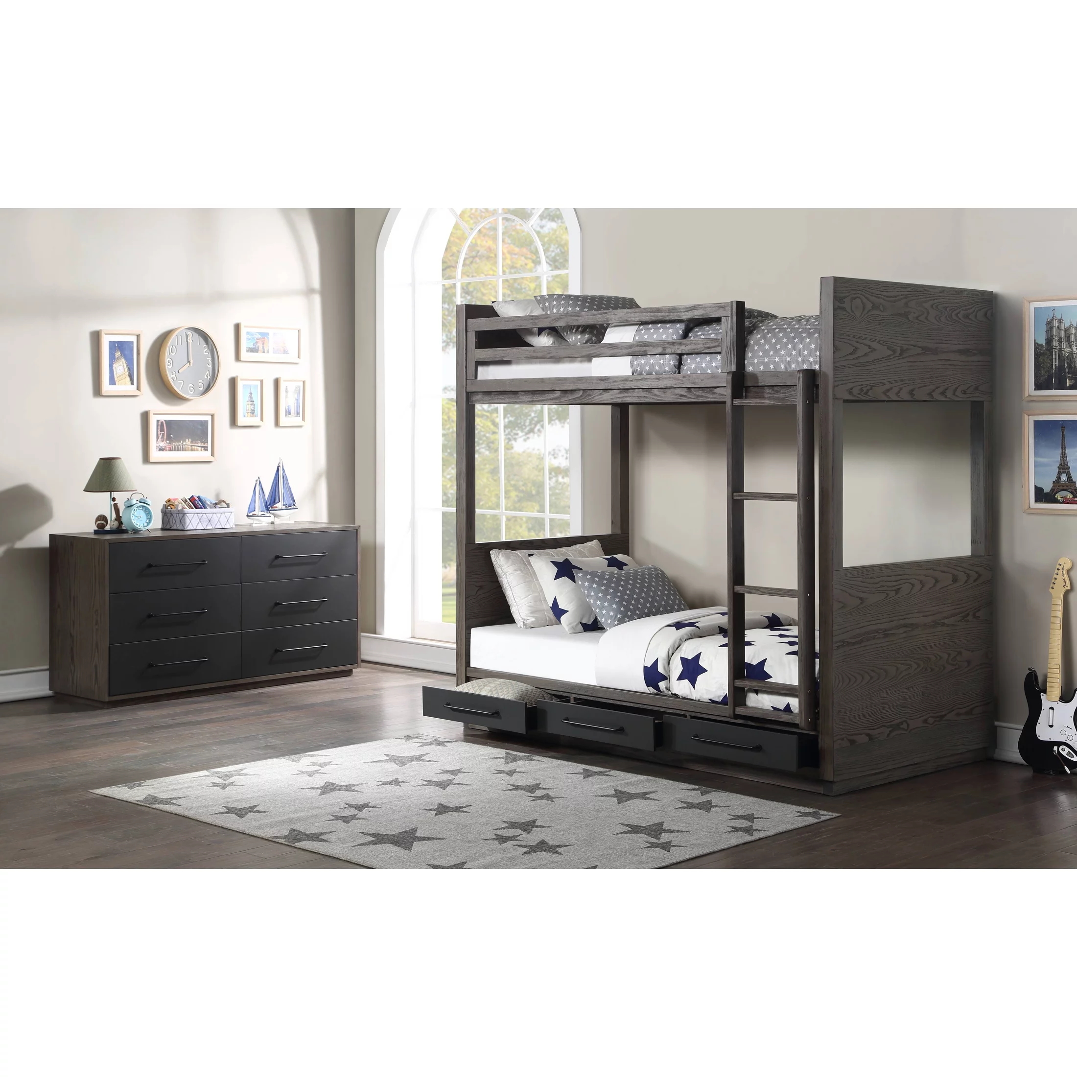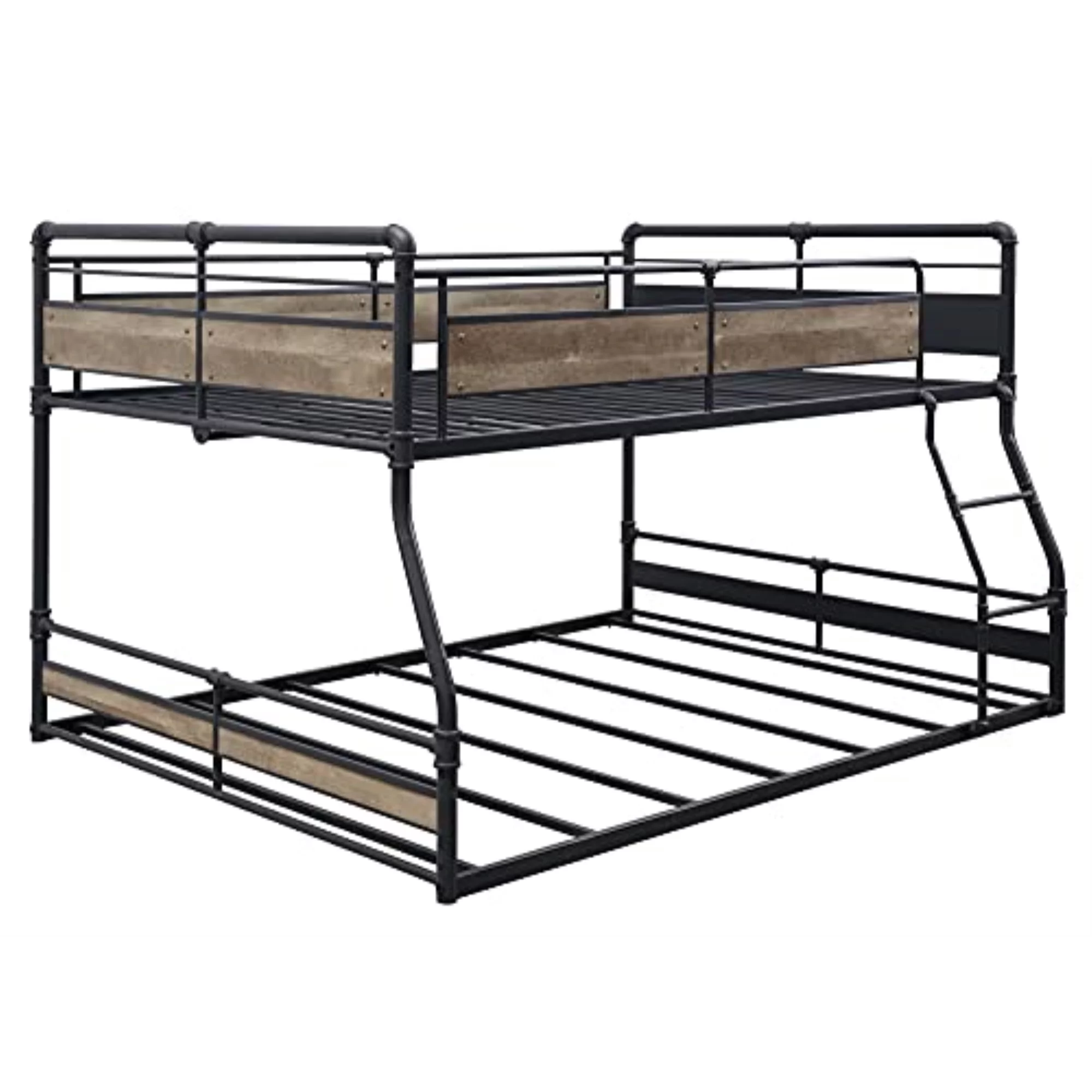 Miekor Furniture Cordelia Full/Queen Bunk Bed in Antique Oak, Sandy Black & Dark Bronze Hand-Brushed Finish
