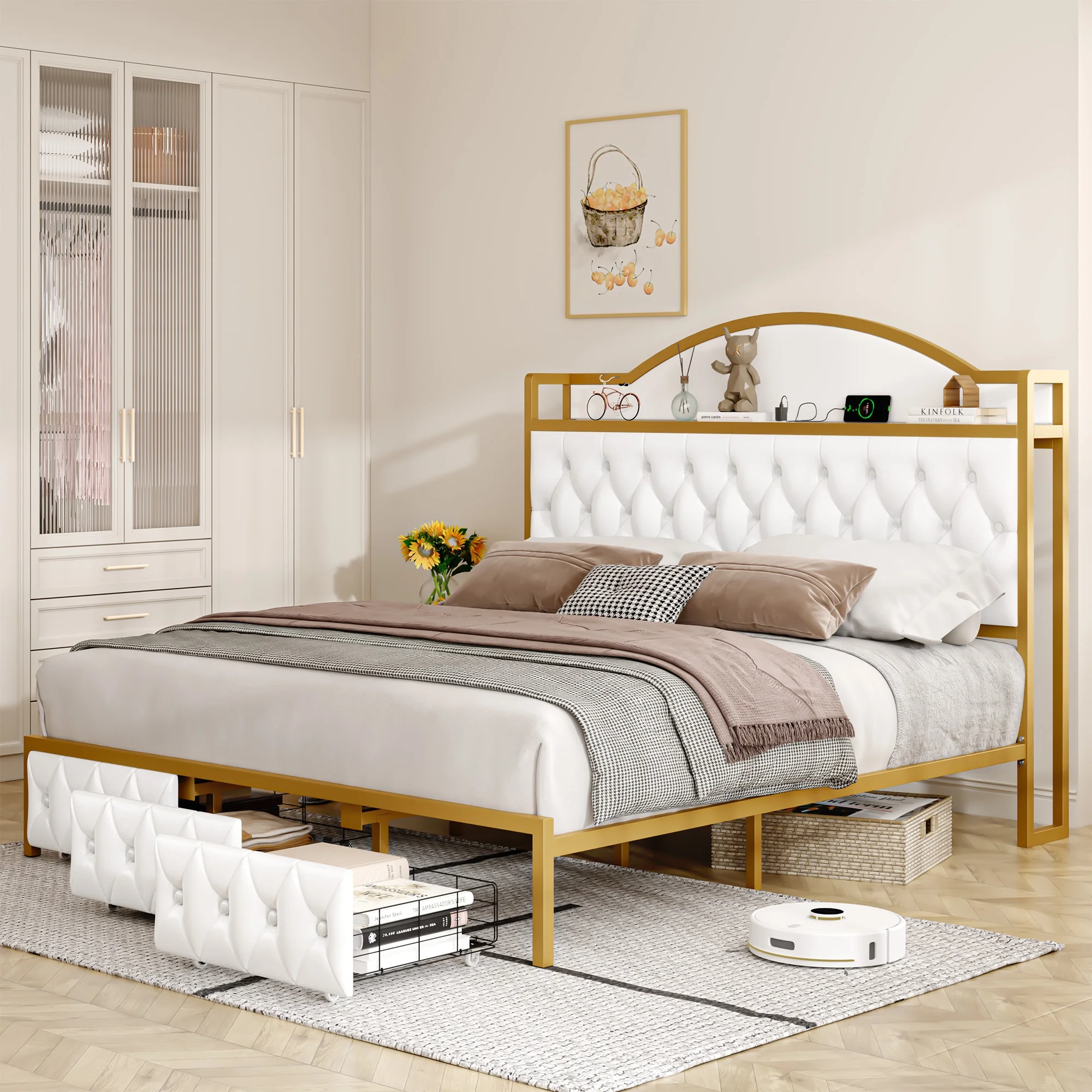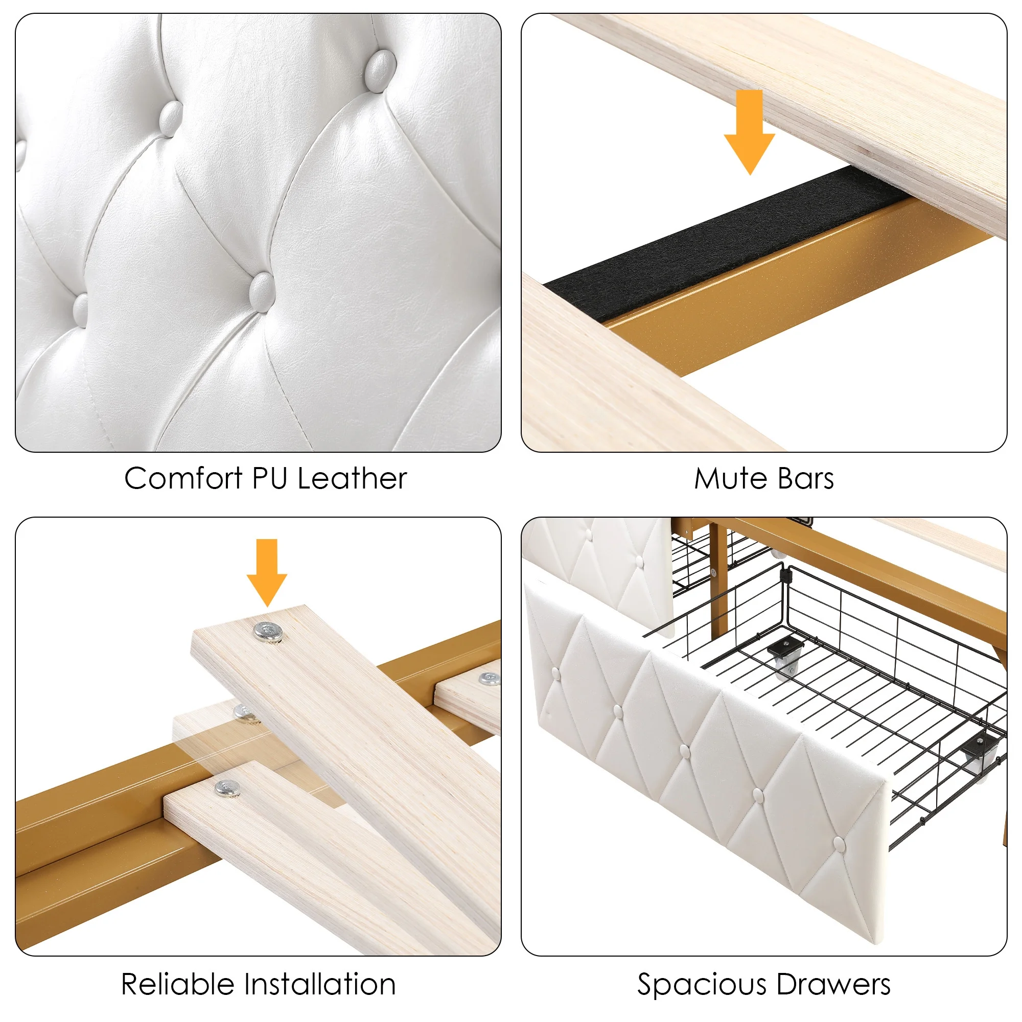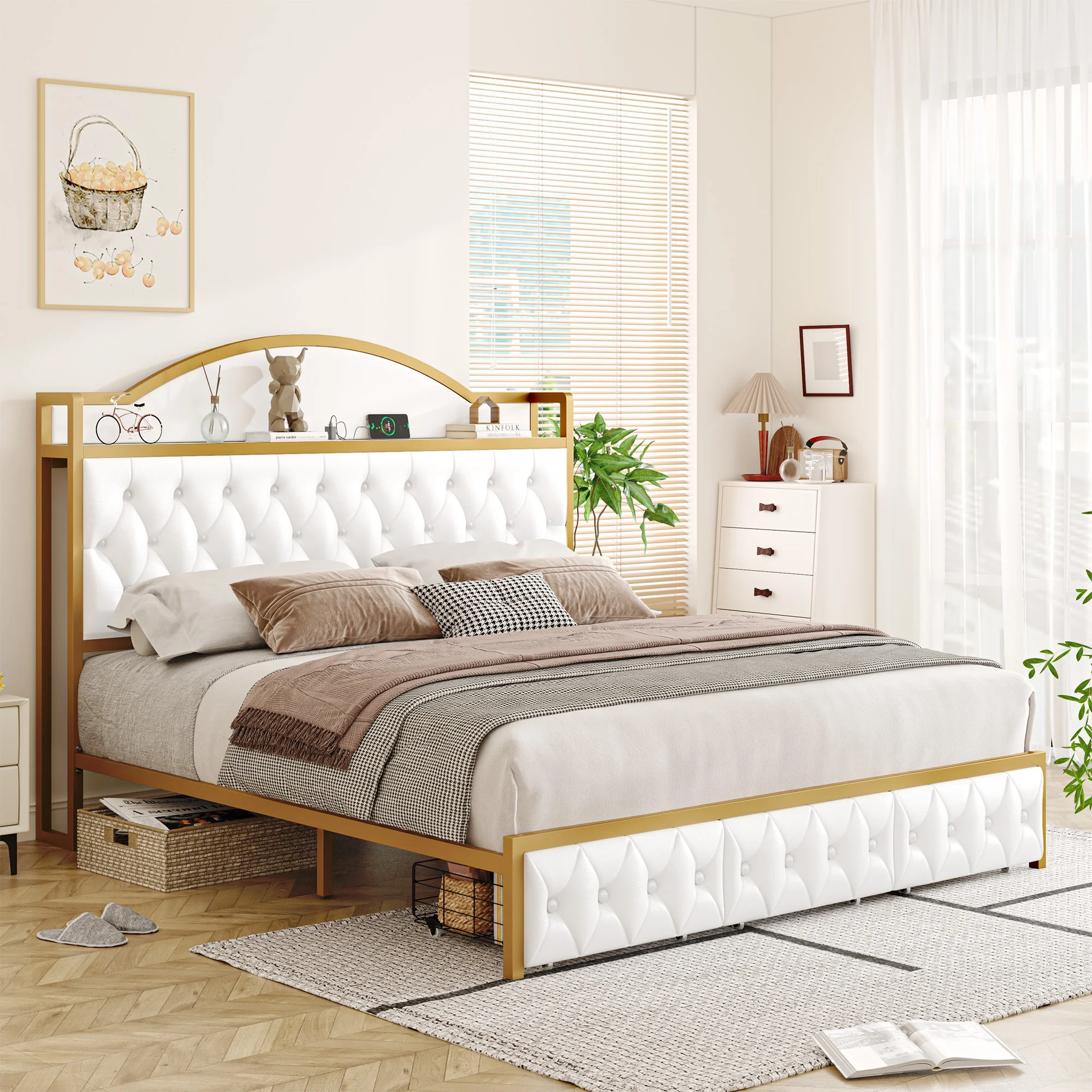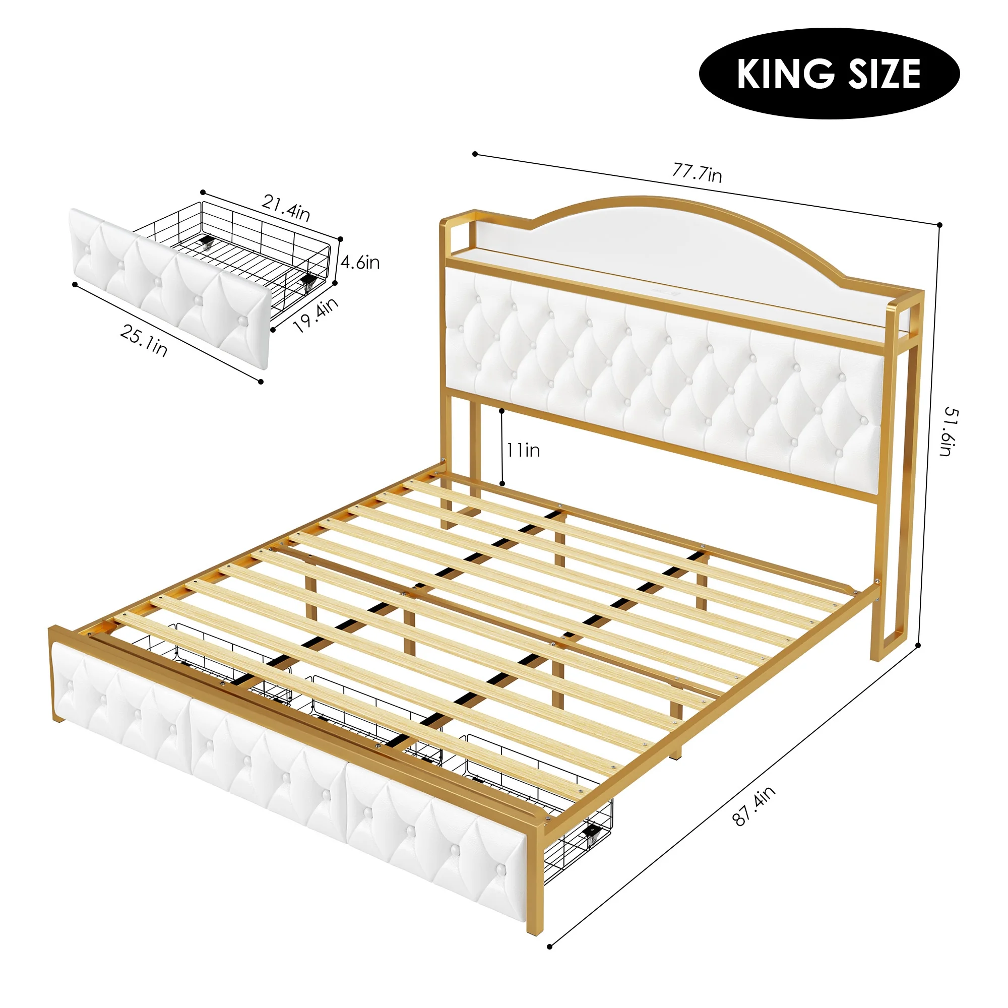 Homfa King Size Bed with Charging and 3 Storage Drawers, Modern PU Leather Upholstered Platform Bed, White and Gold