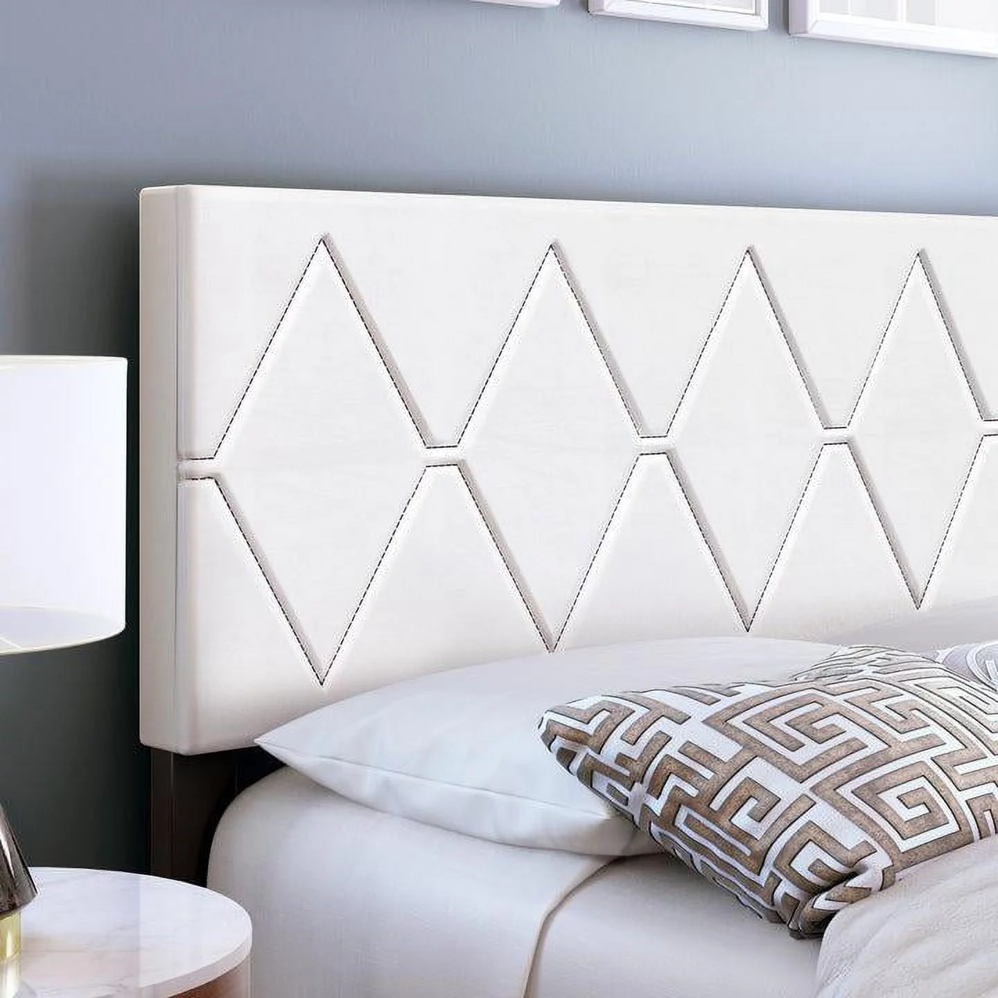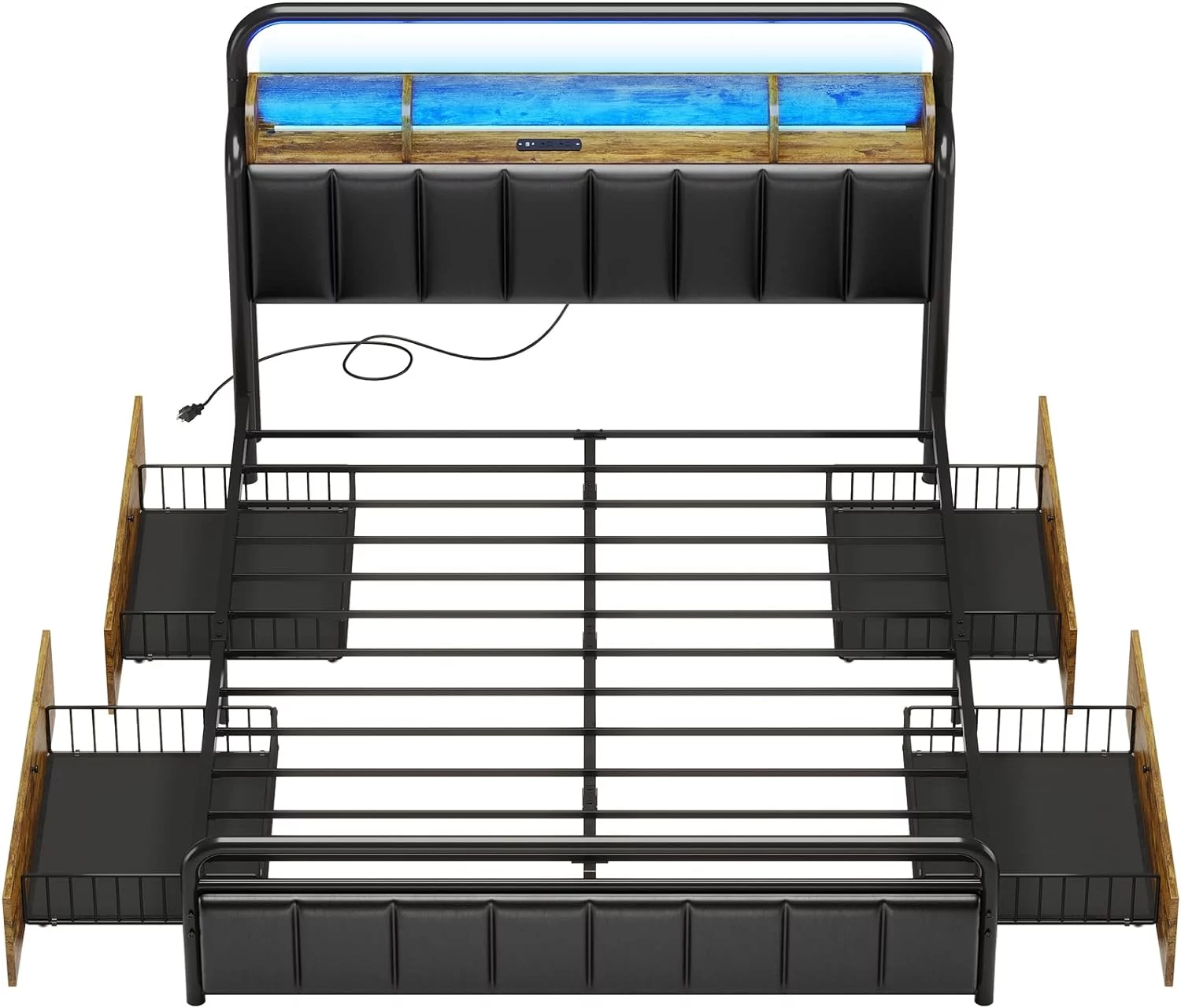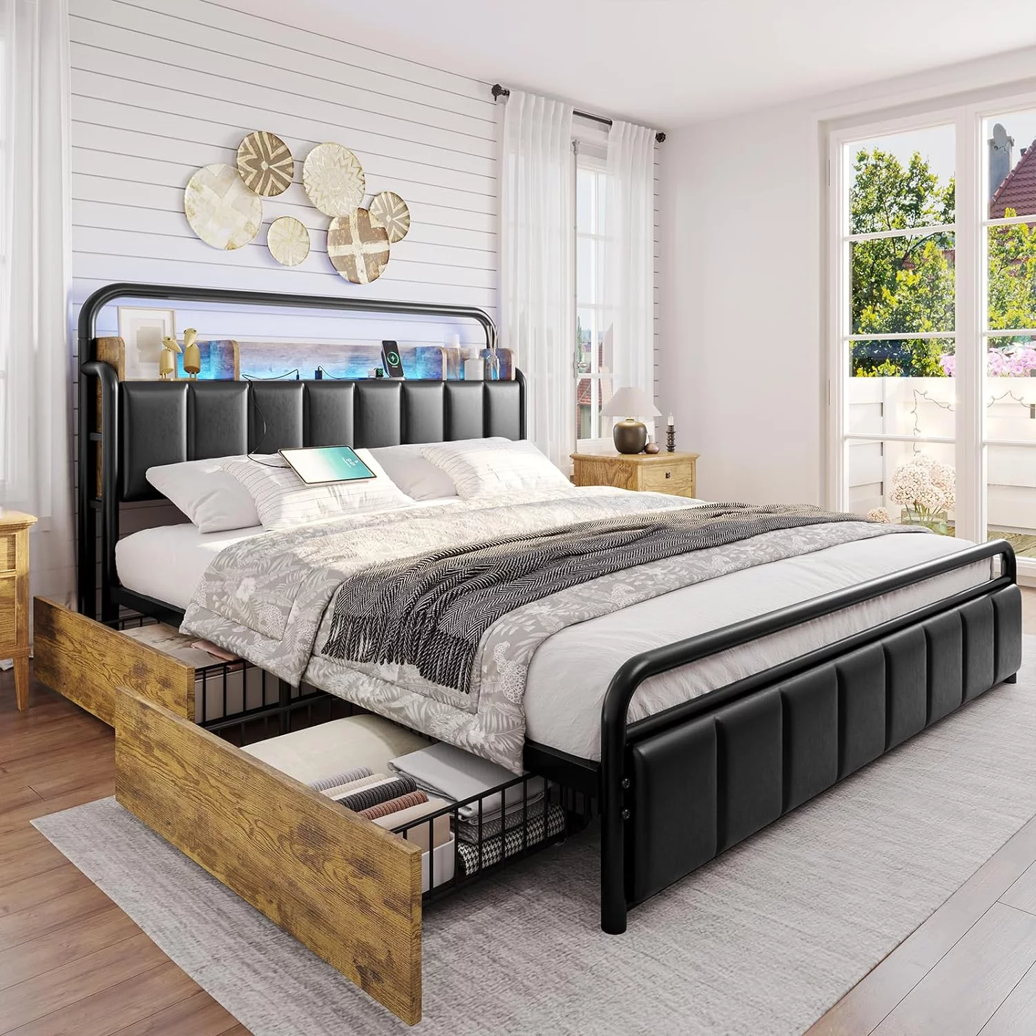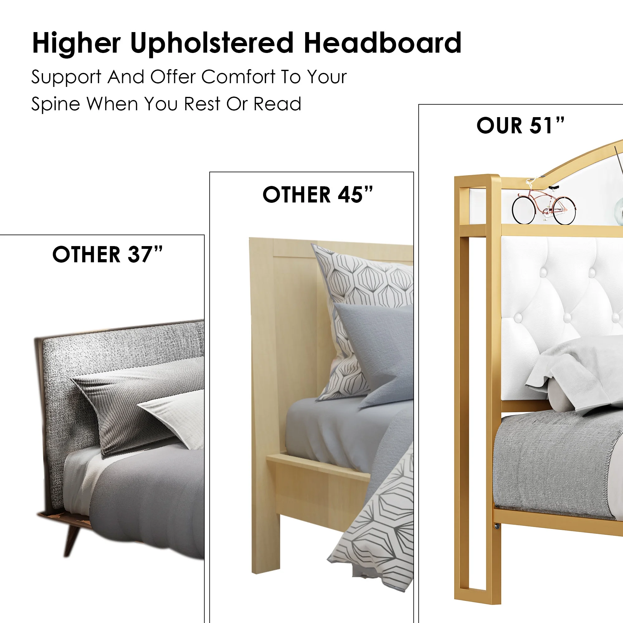 Homfa King Size Bed with Charging and 3 Storage Drawers, Modern PU Leather Upholstered Platform Bed, White and Gold