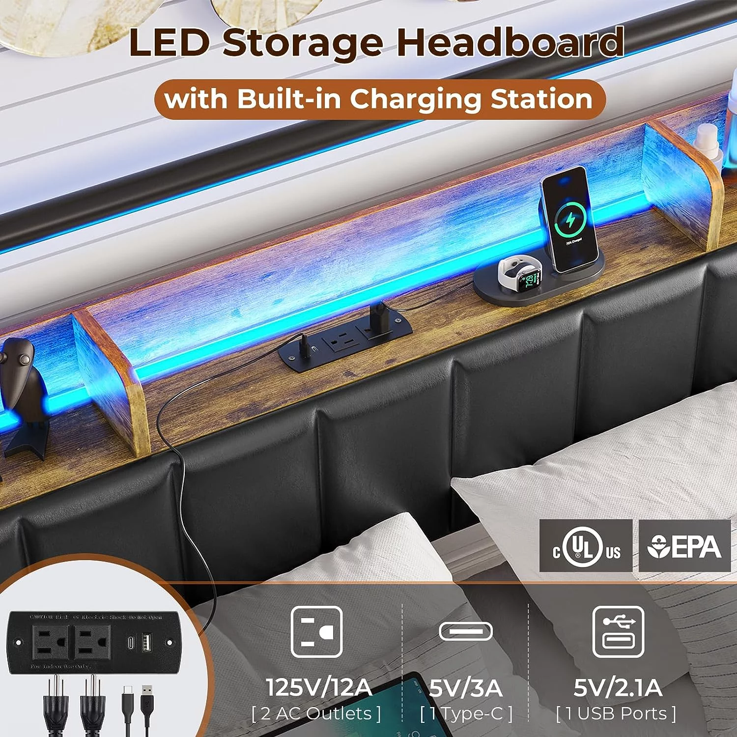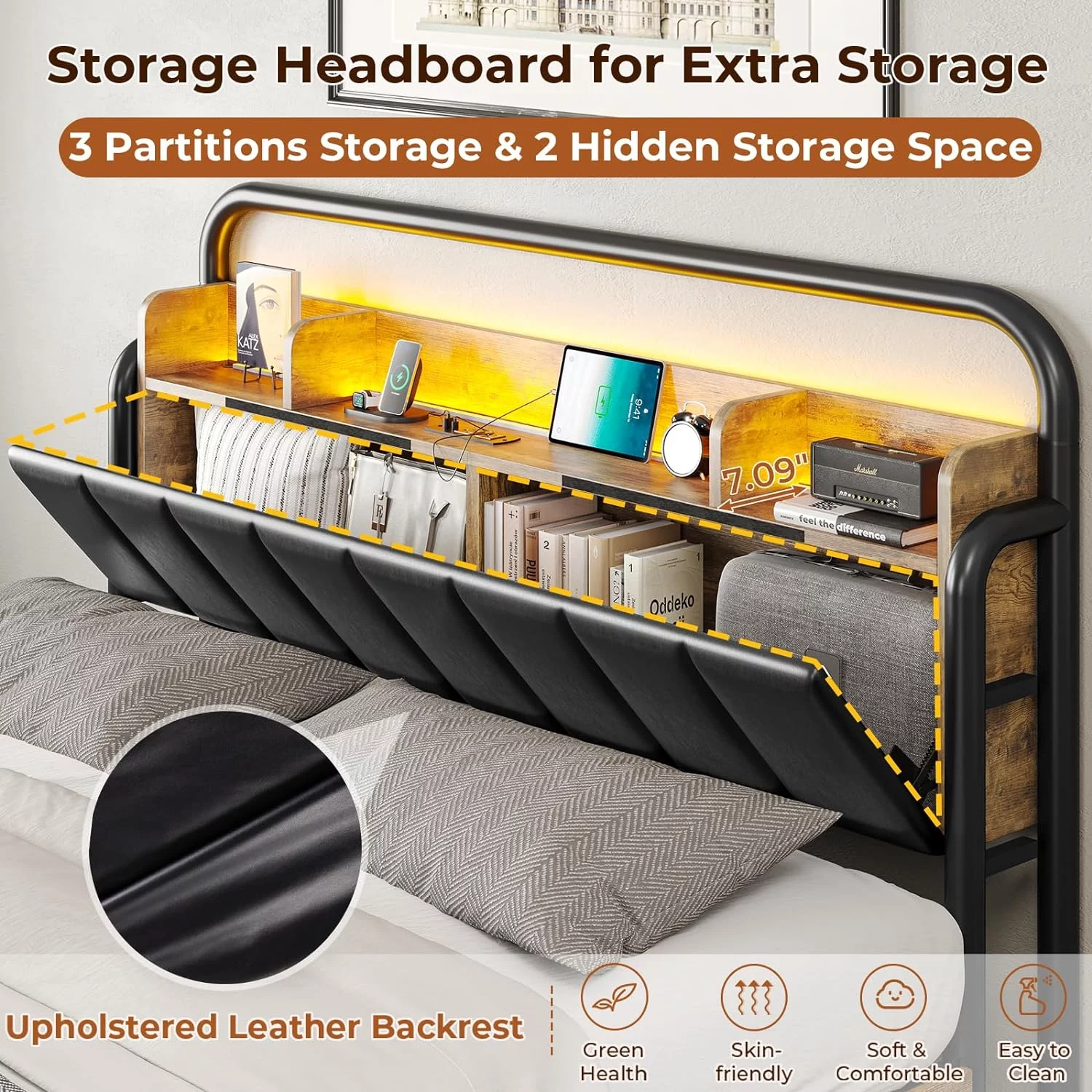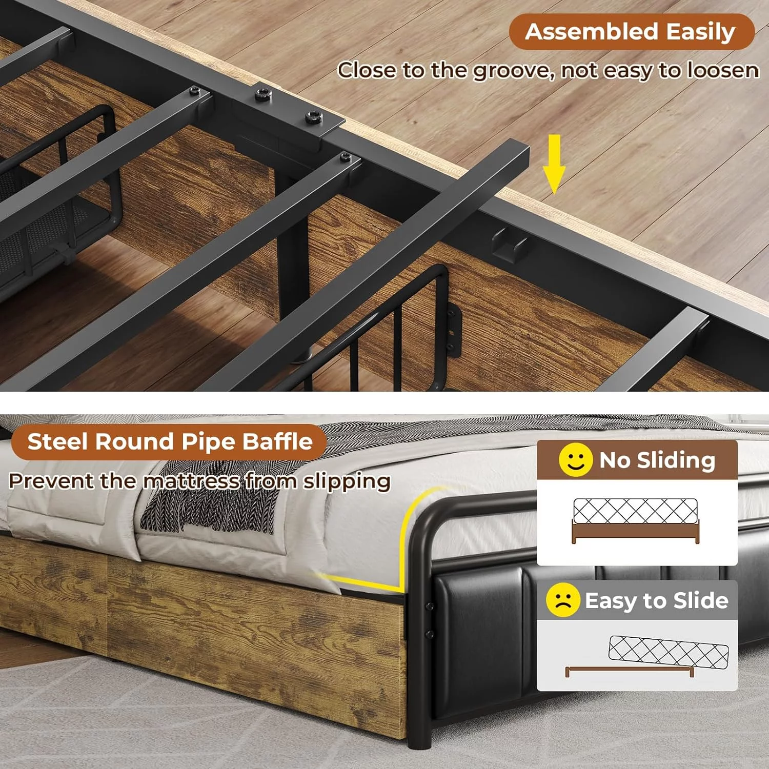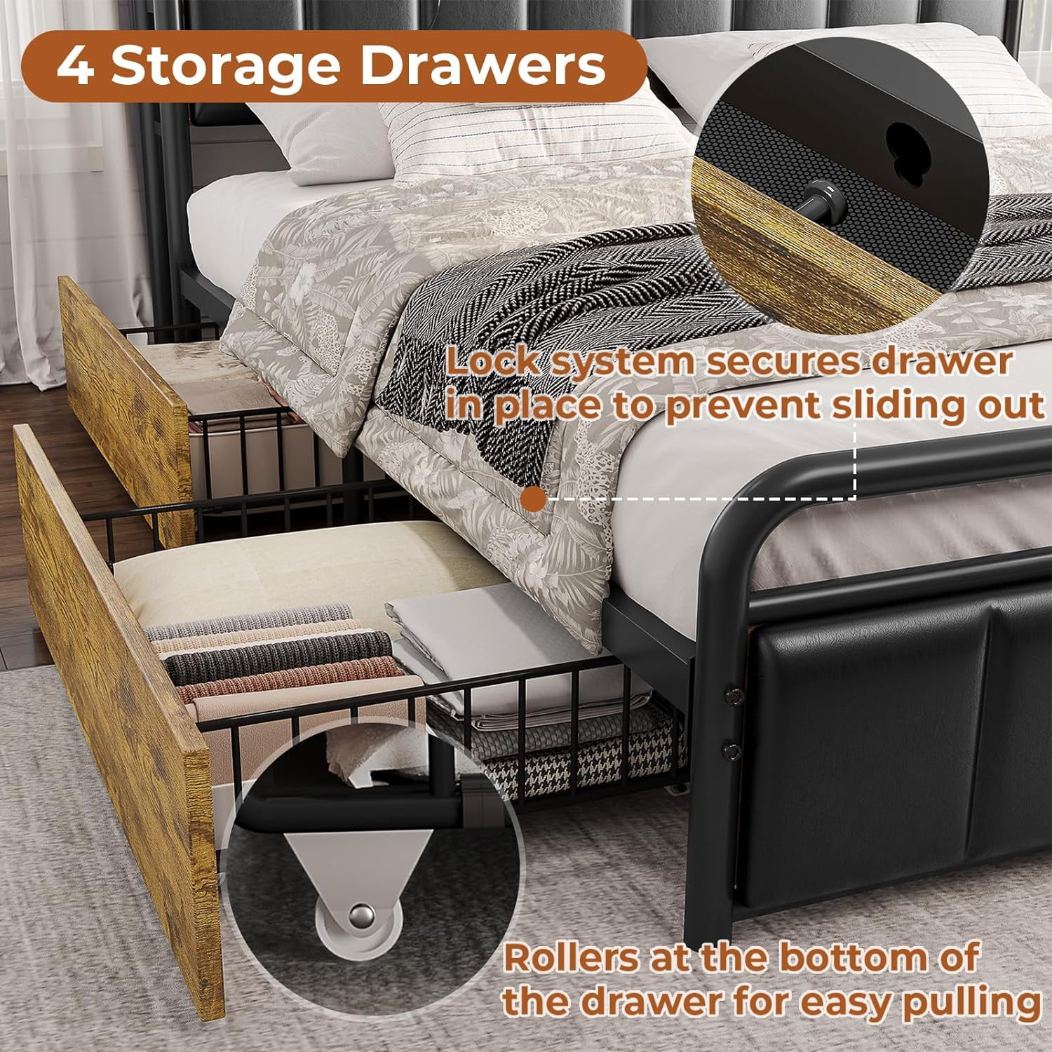 Modern Upholstered Queen Platform Bed Frame with Drawers, Button Tufted Headboard, PU Leather & Velvet, Orange/Brown