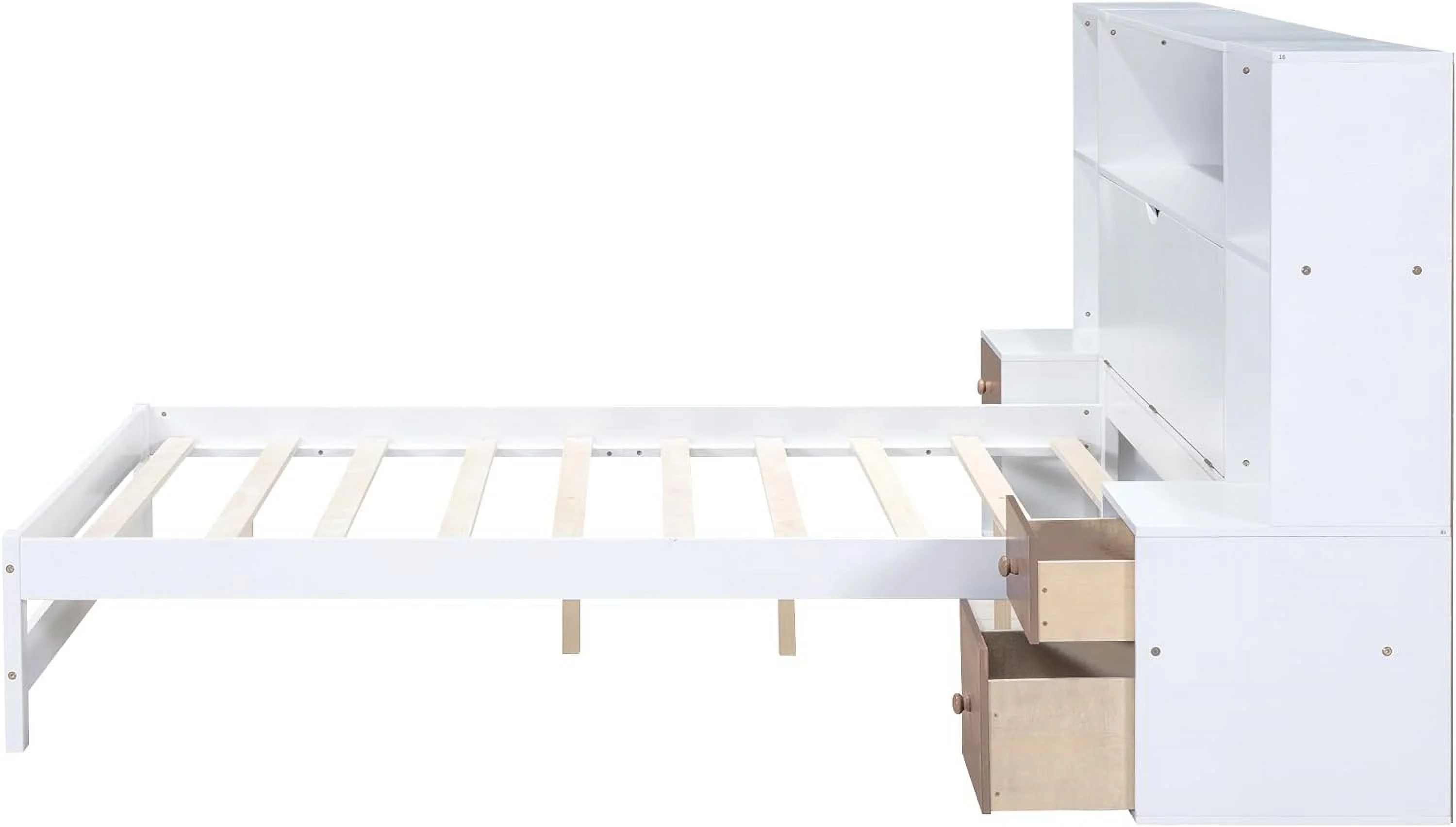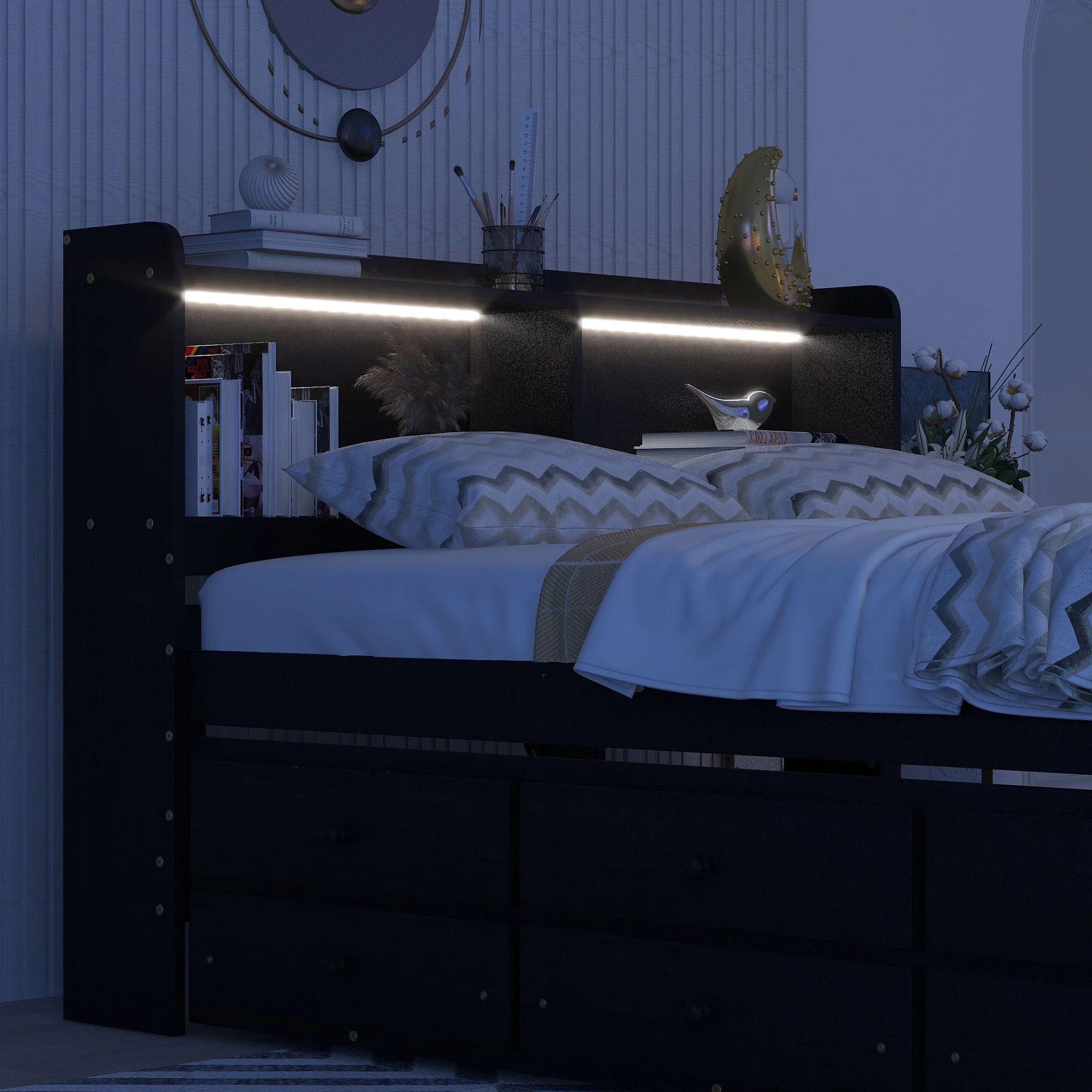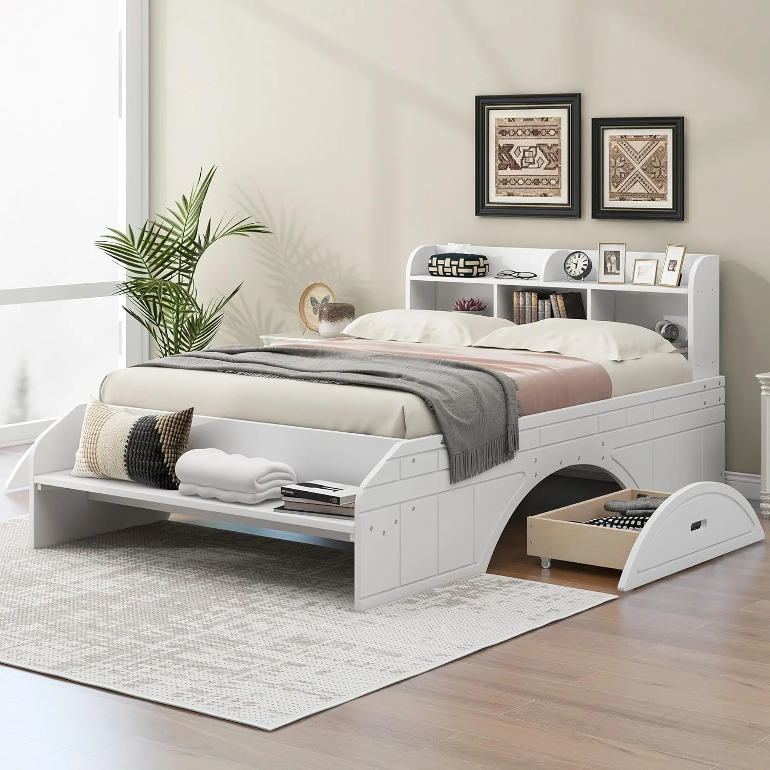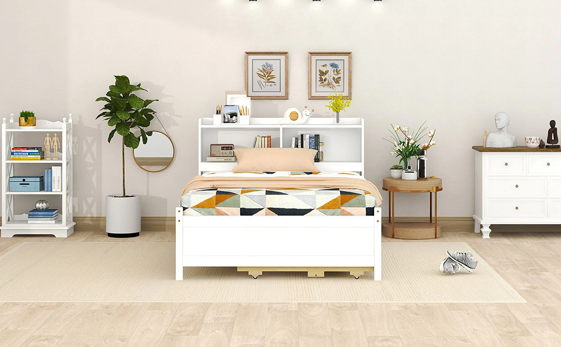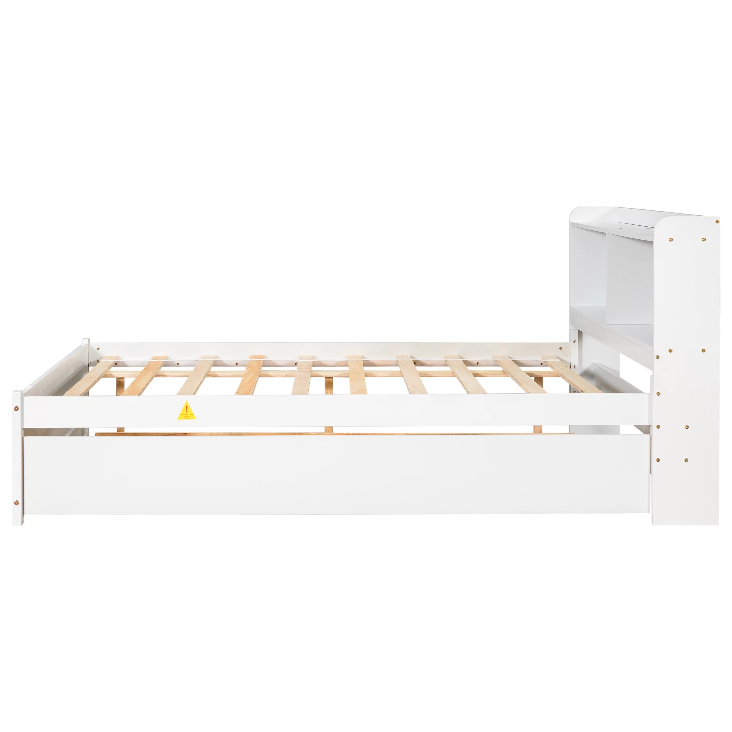 Full Size Bed with USB & Type-C Ports, Bookcase Headboard, Trundle & 3 Drawers, LED Light Strip, Easy Assembly,White