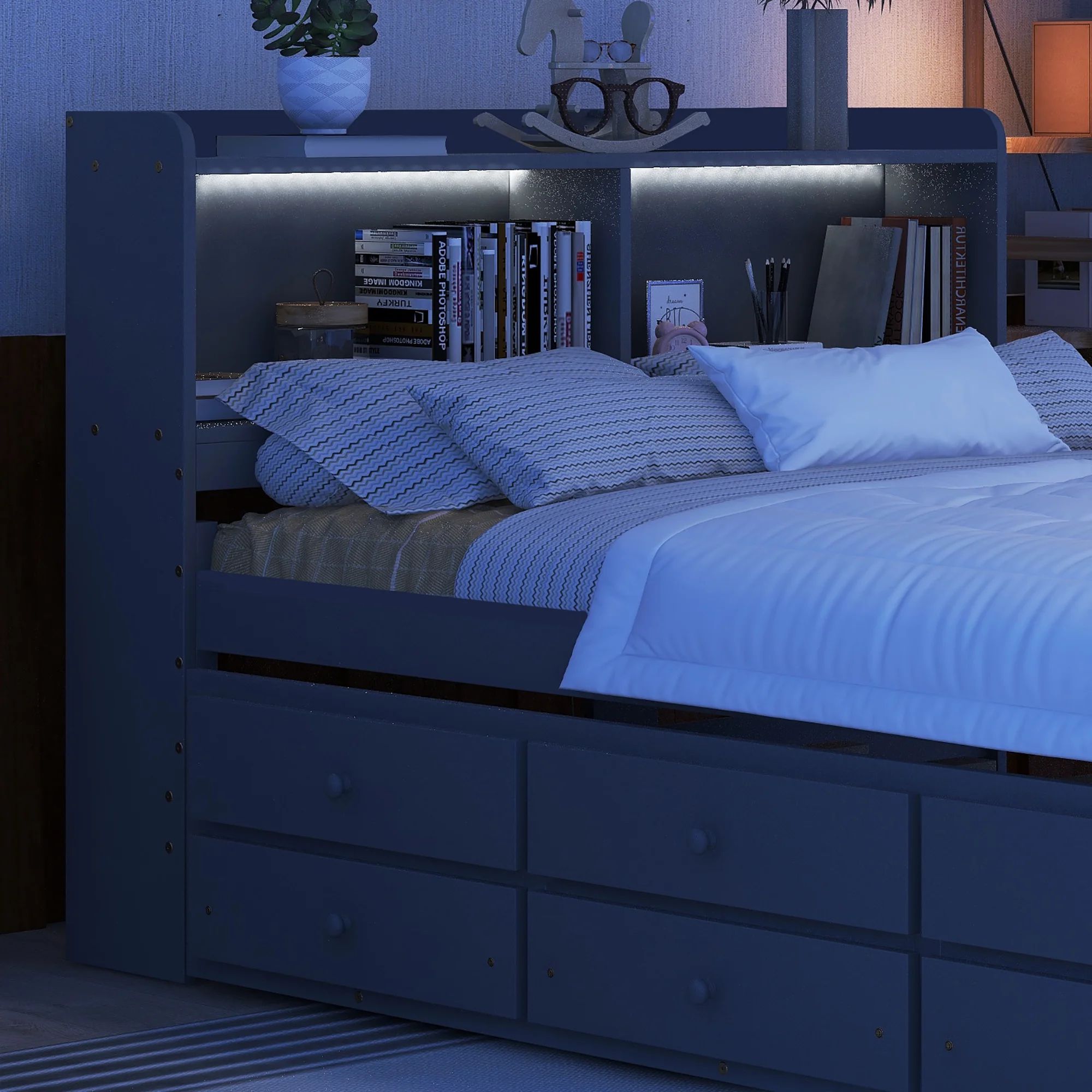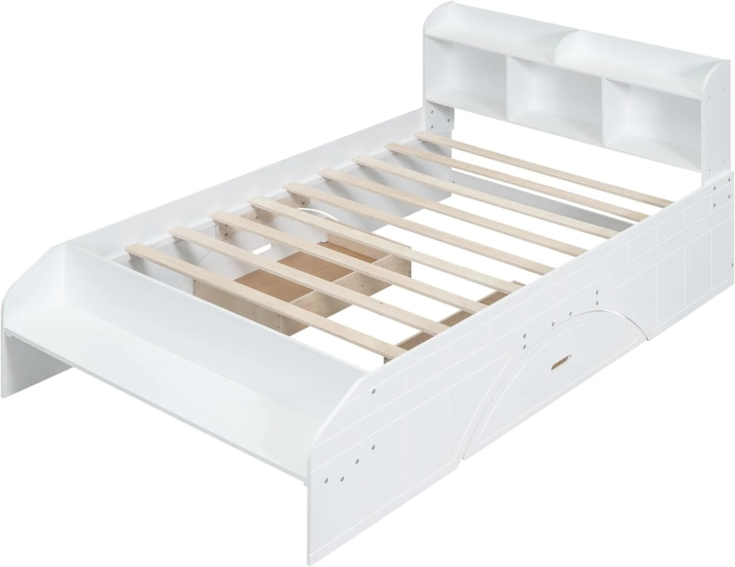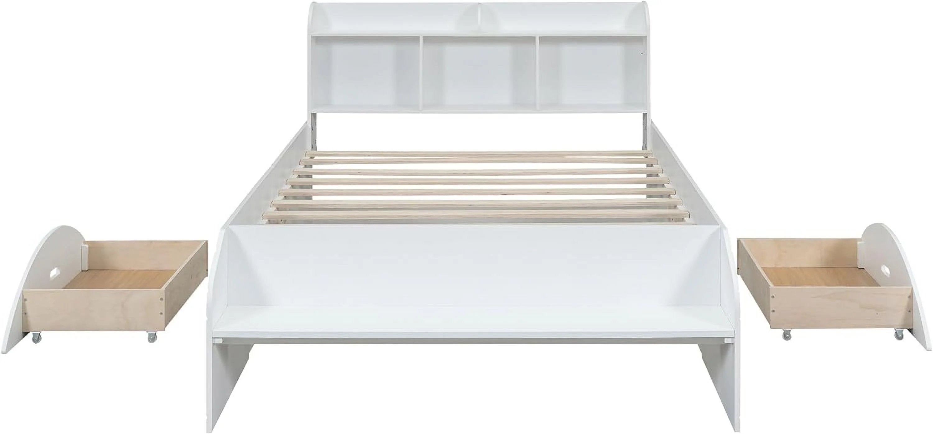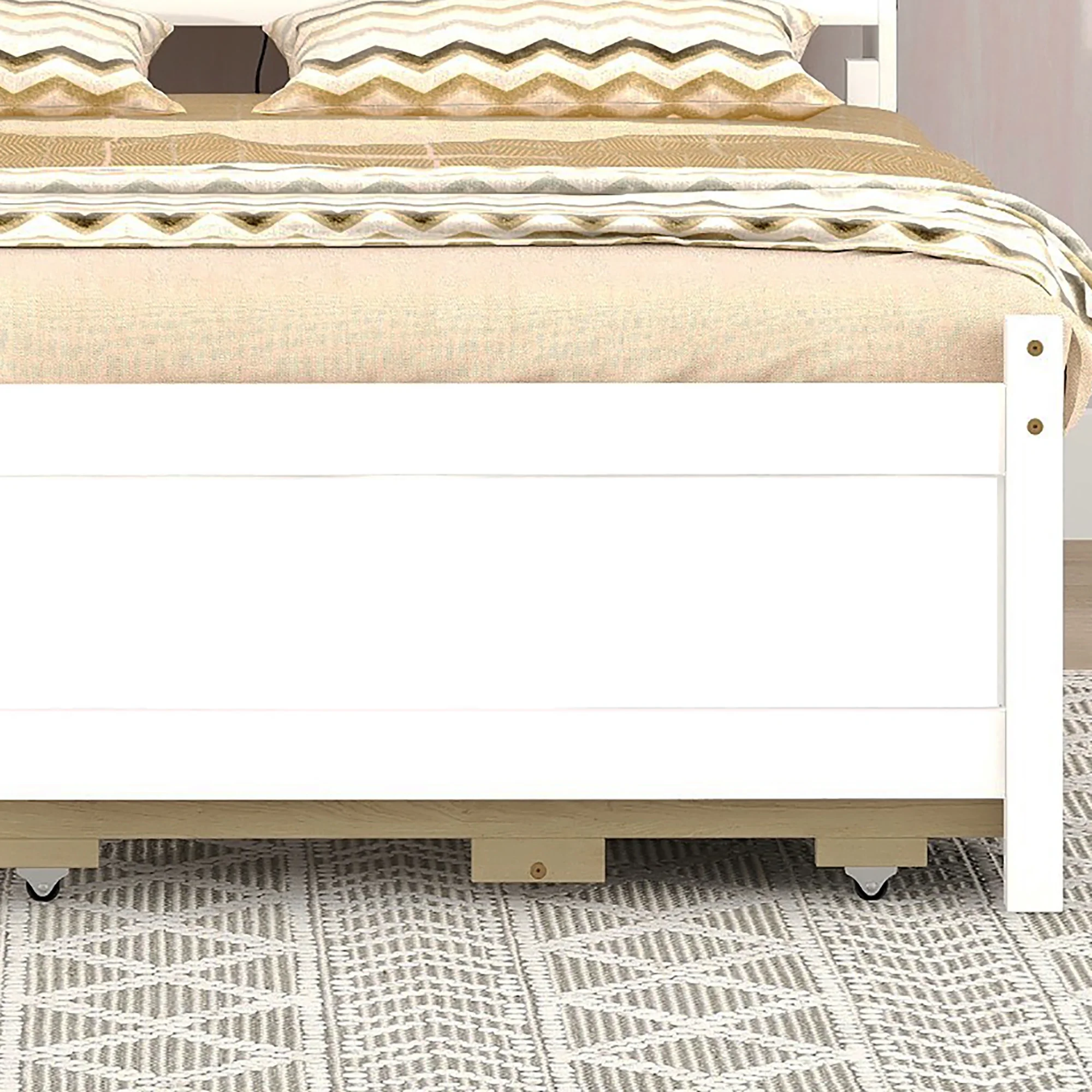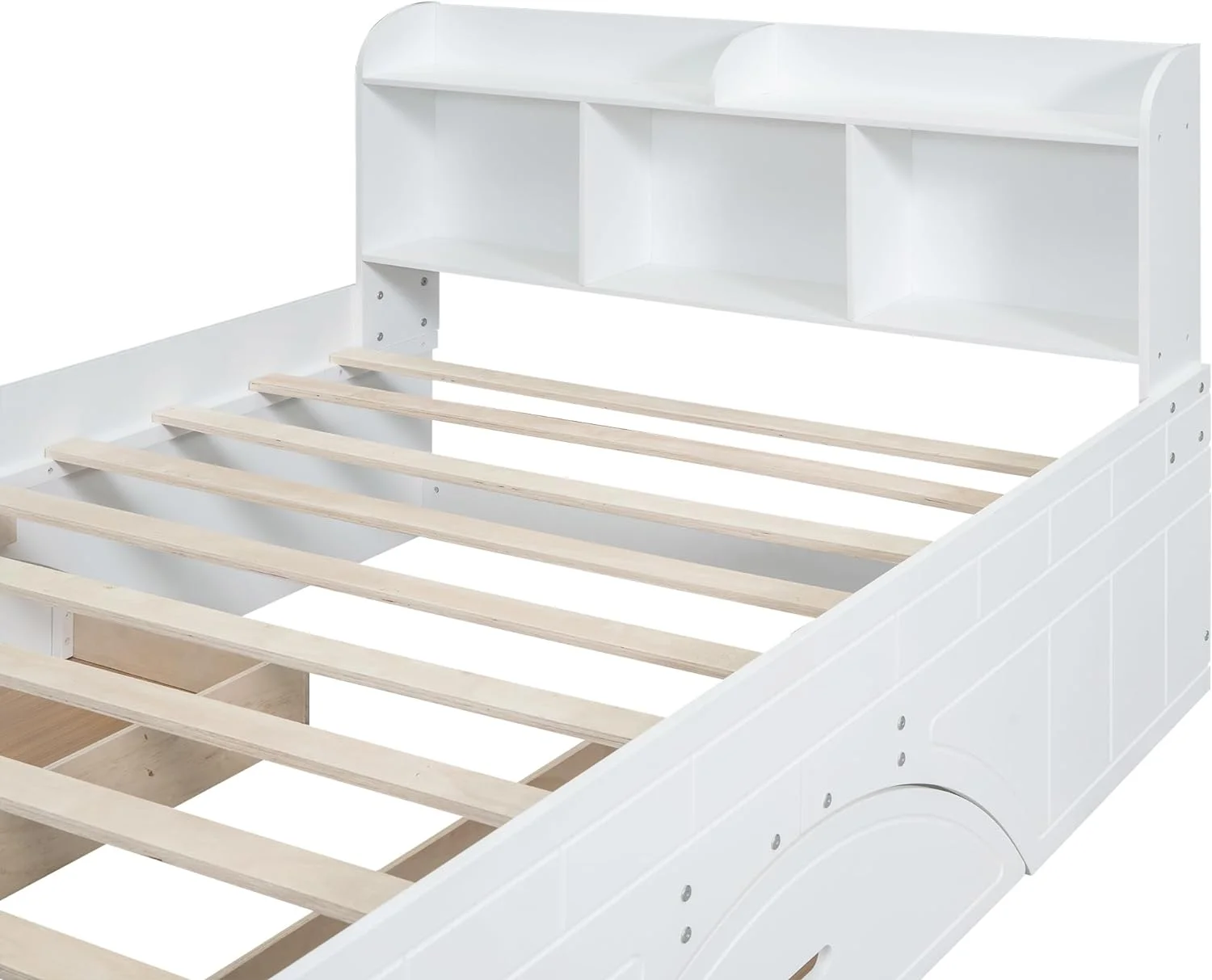 Full Size Bed with USB & Type-C Ports, Bookcase Headboard, Trundle & 3 Drawers, LED Light Strip, Easy Assembly,White