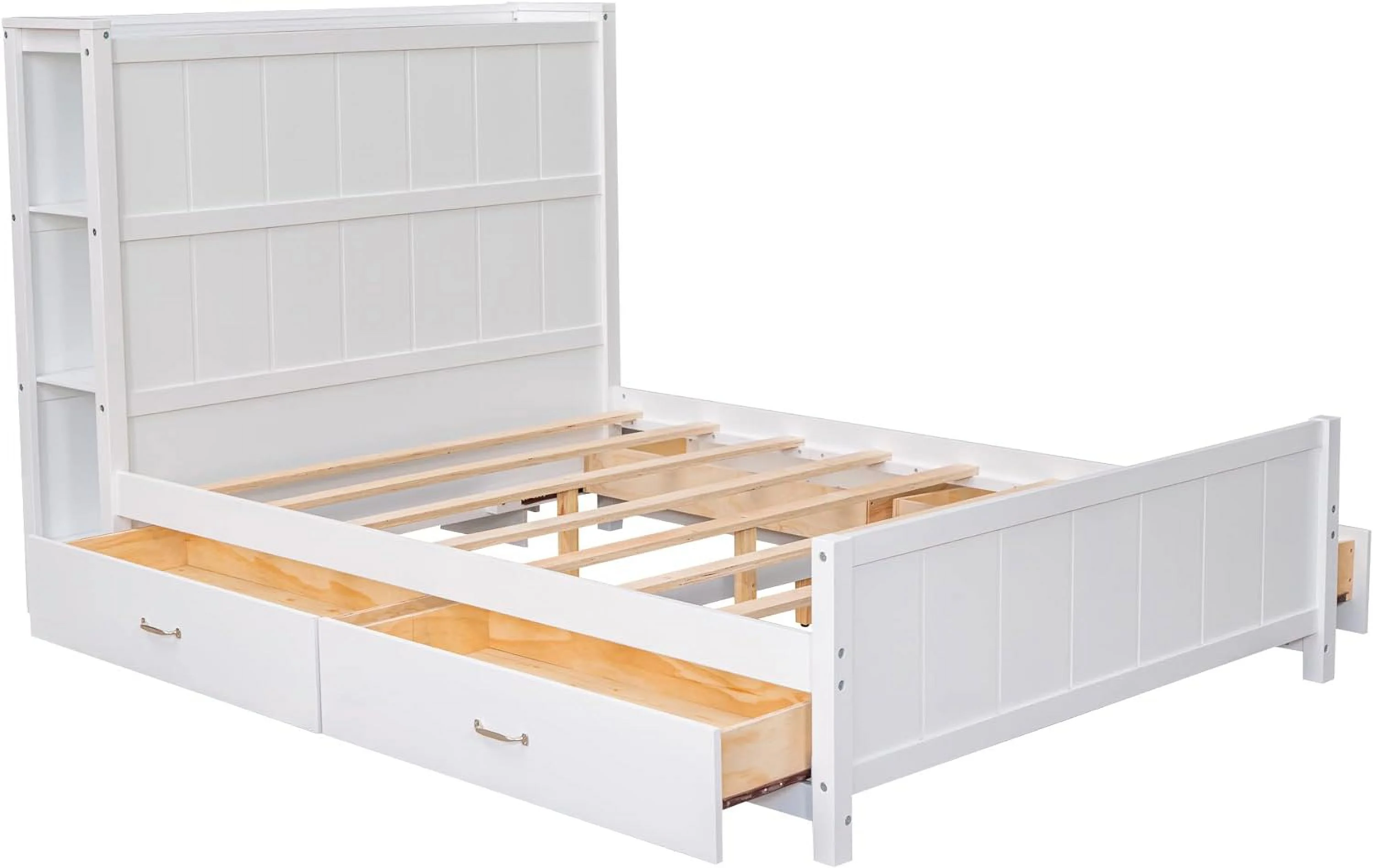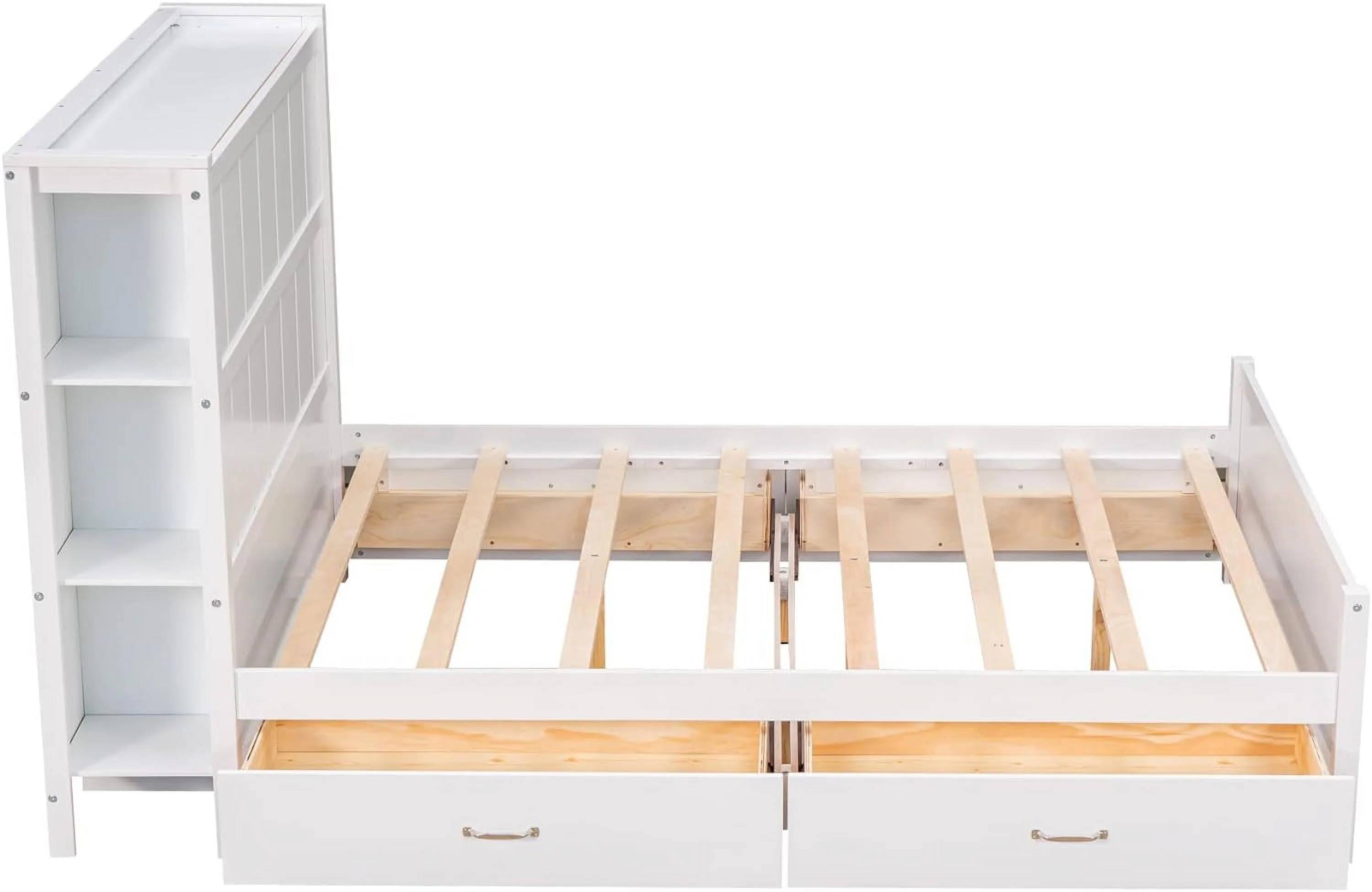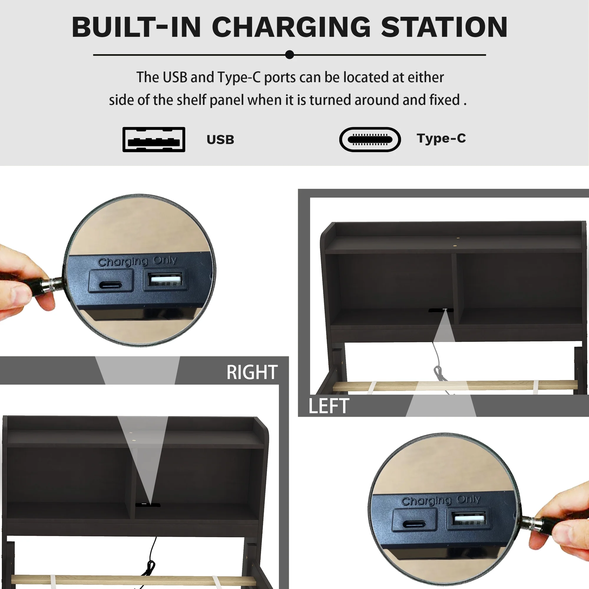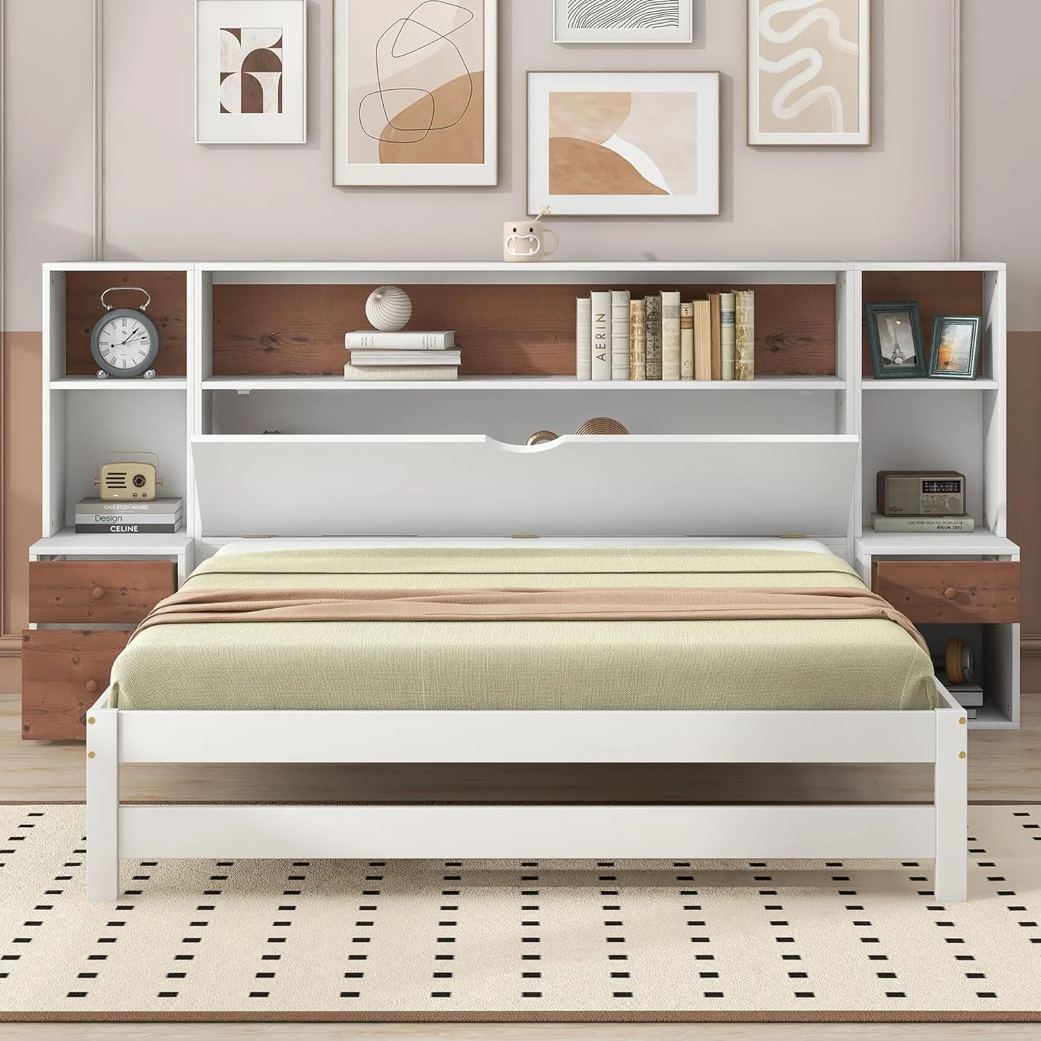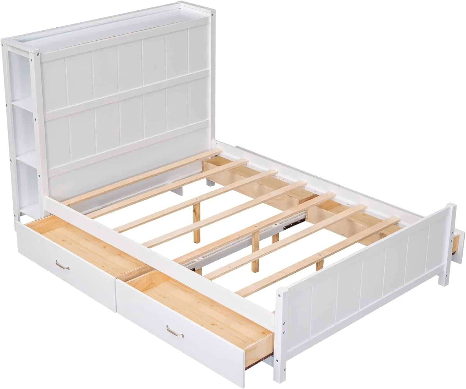 Full Size Bed with USB & Type-C Ports, Bookcase Headboard, Trundle & 3 Drawers, LED Light Strip, Easy Assembly,White