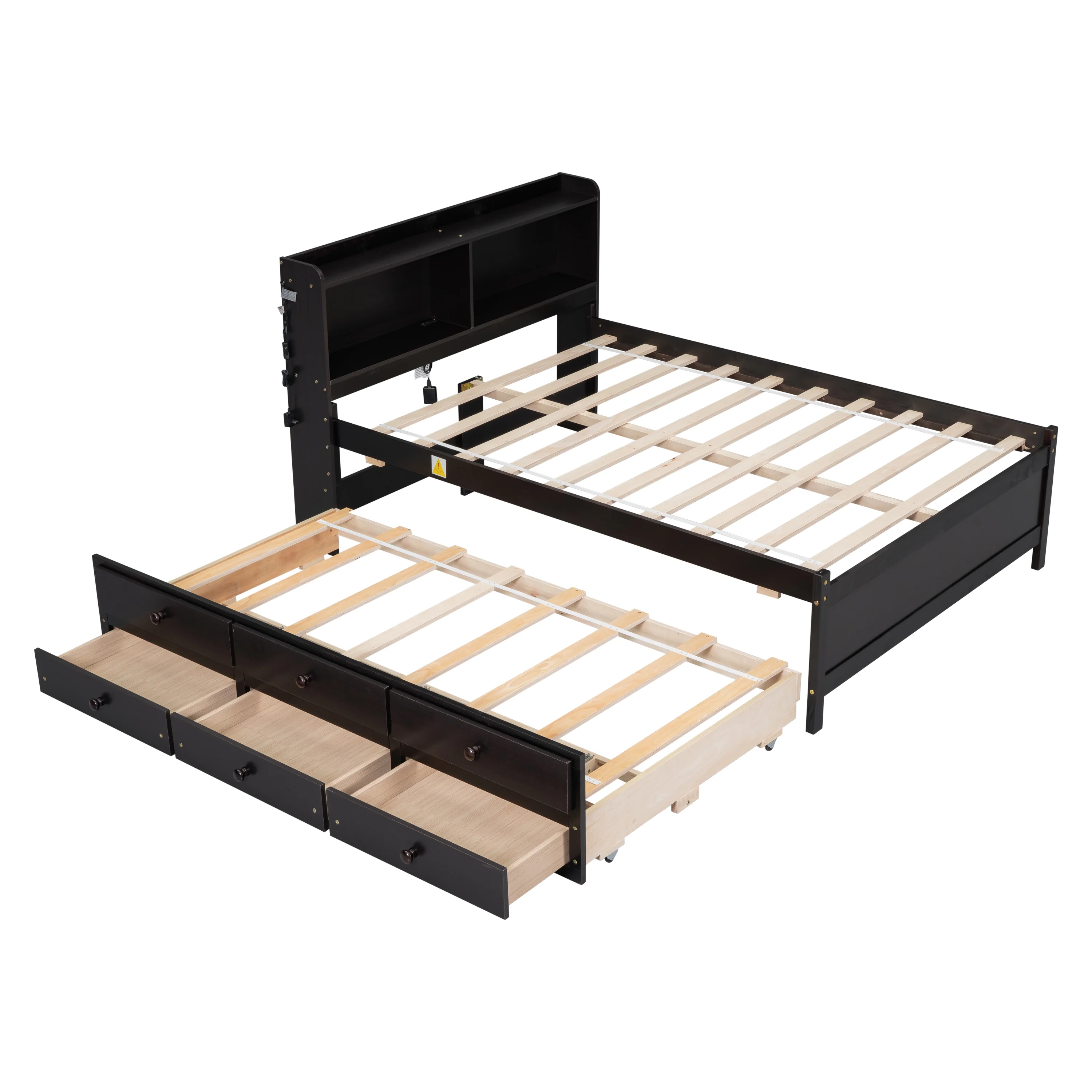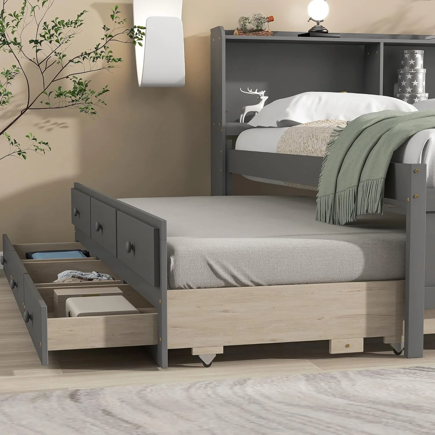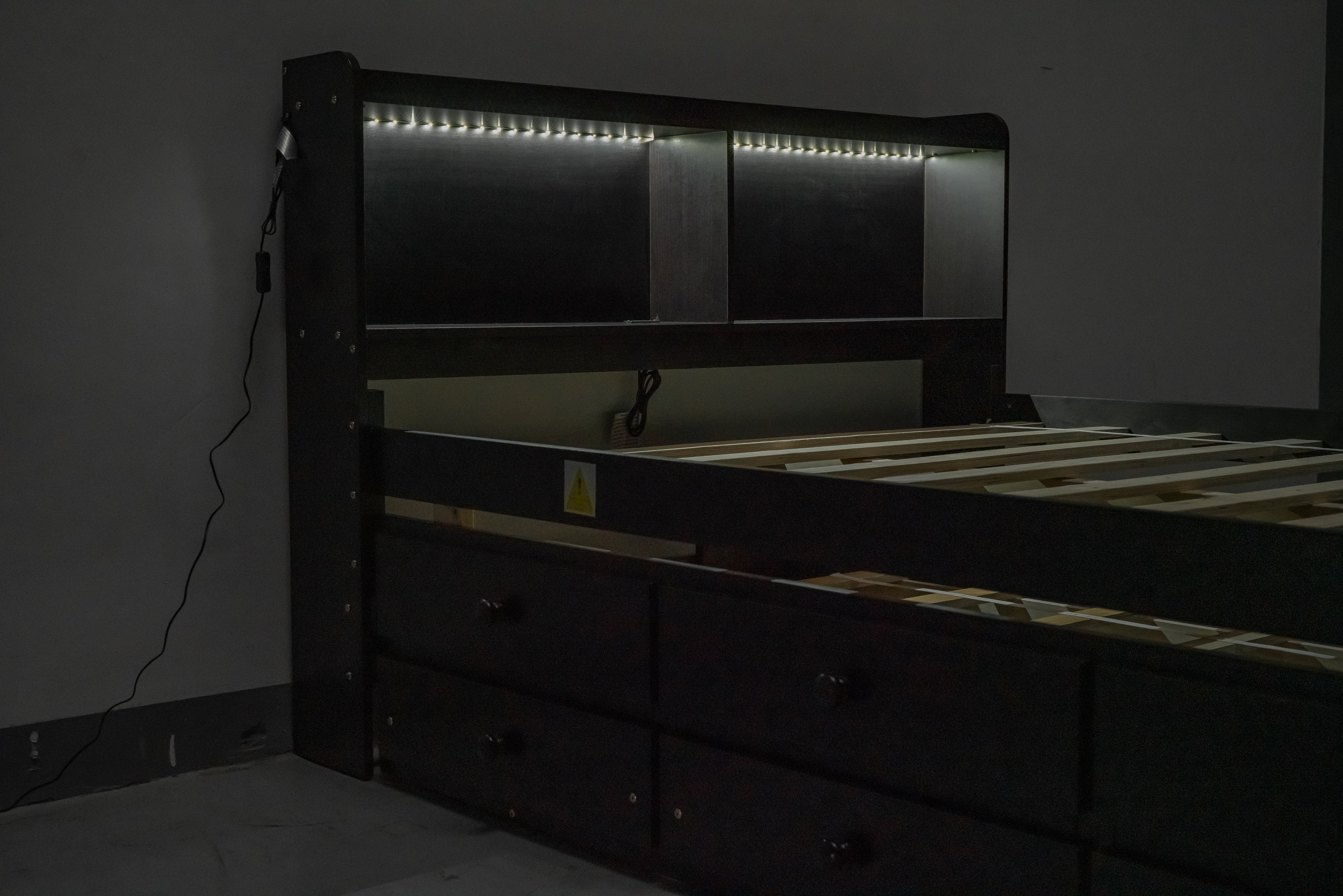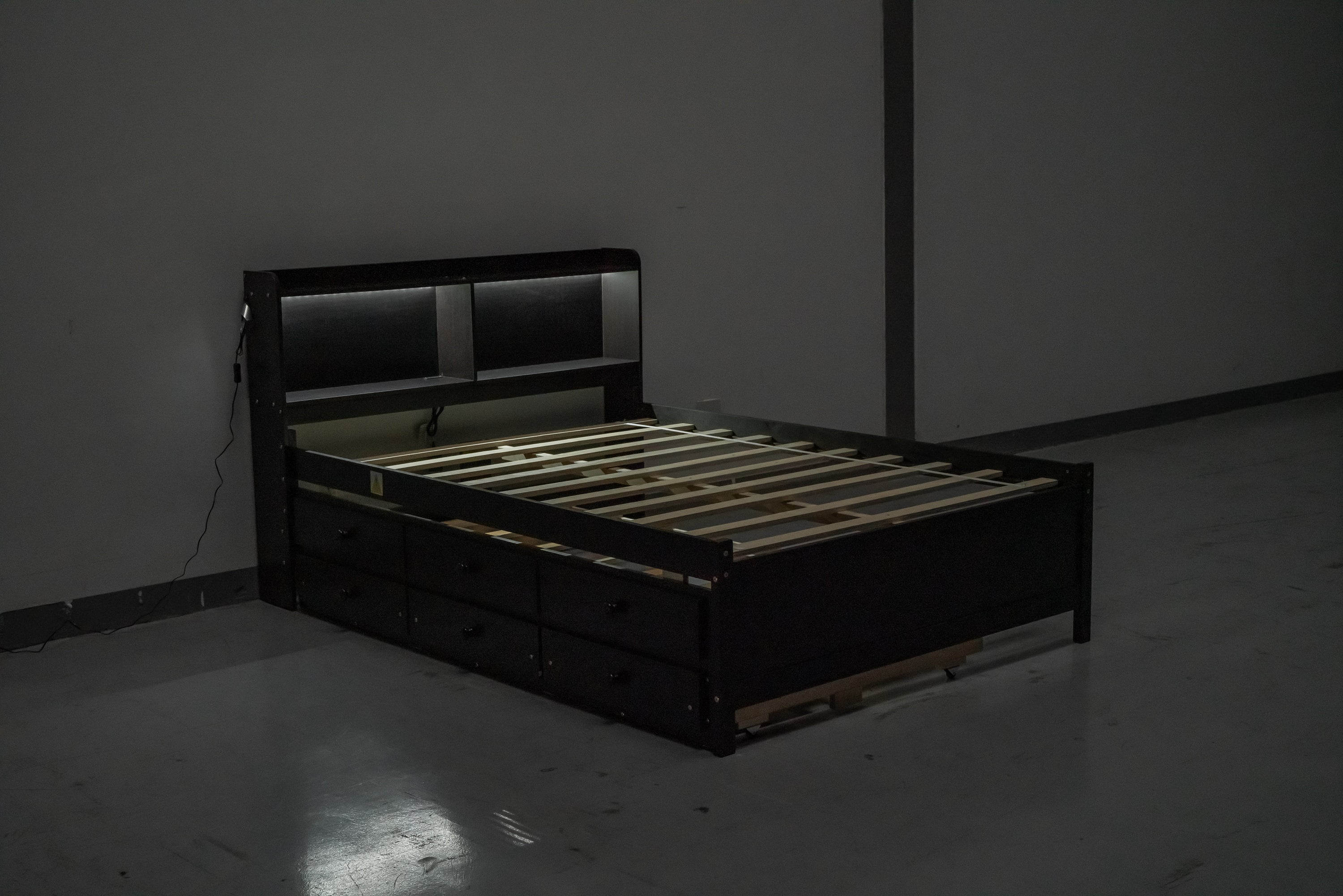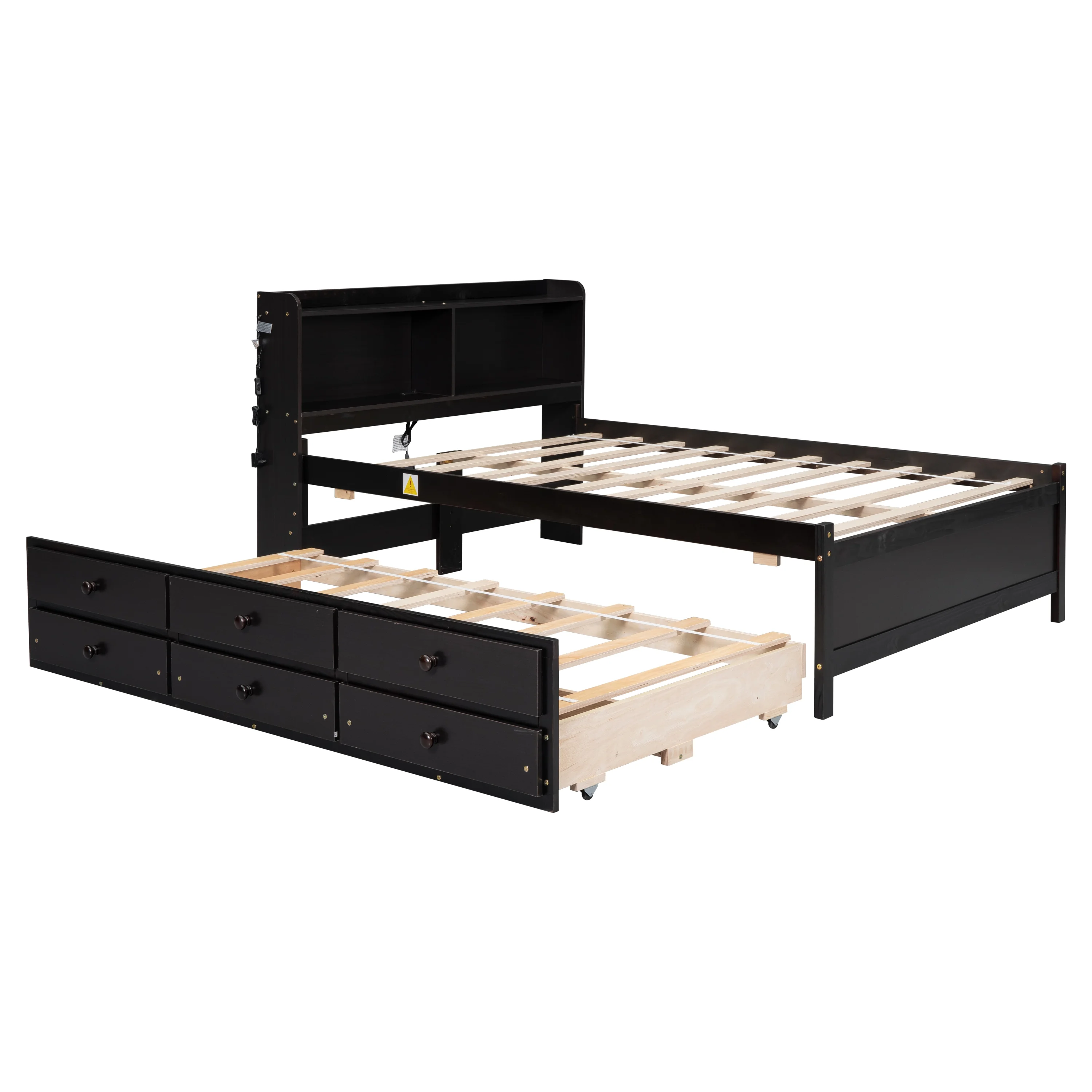 Full Size Bed with USB & Type-C Ports, Bookcase Headboard, Trundle & 3 Drawers, LED Light Strip, Easy Assembly,White