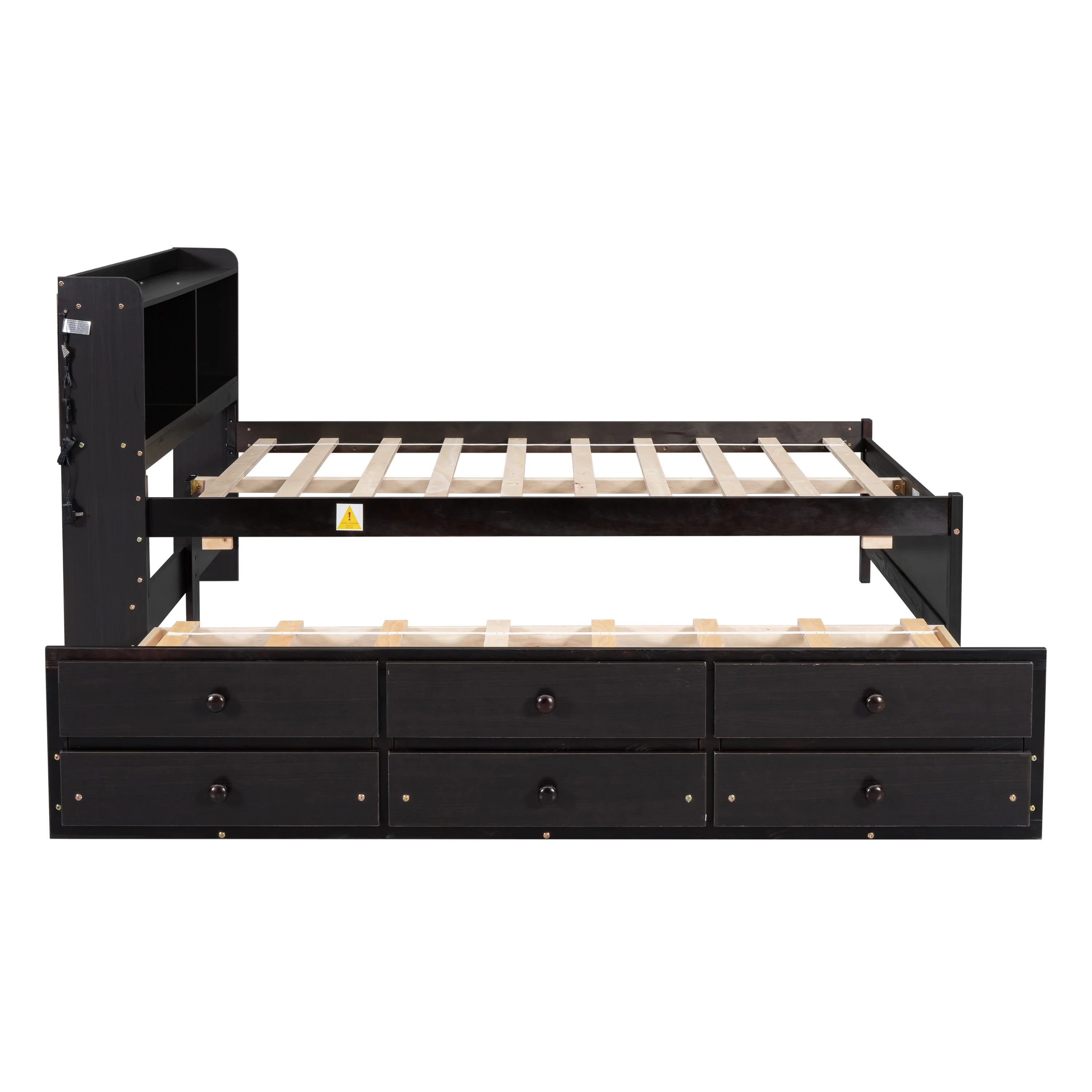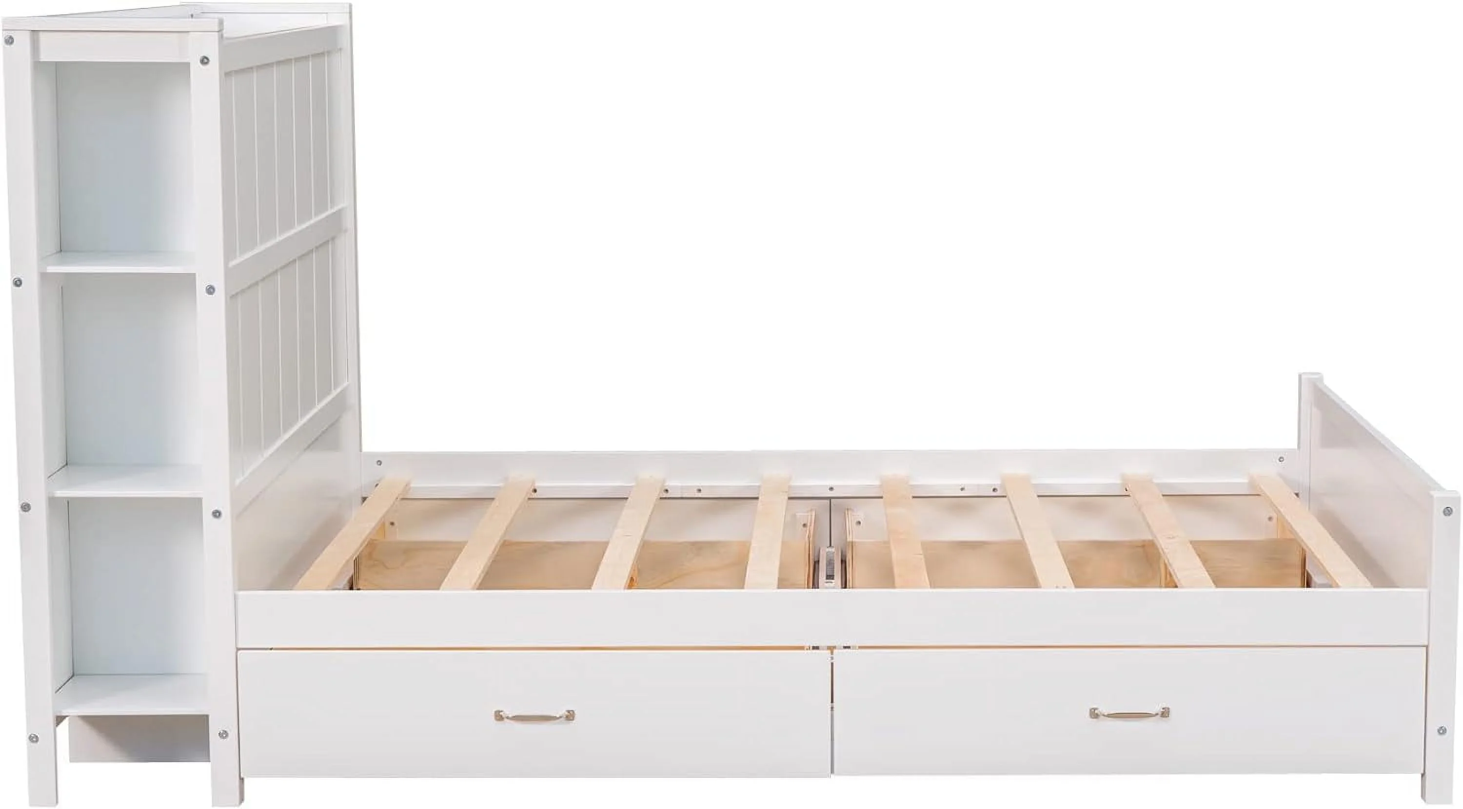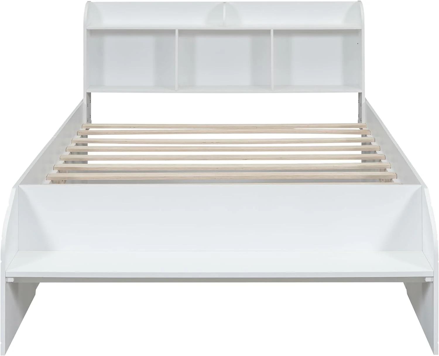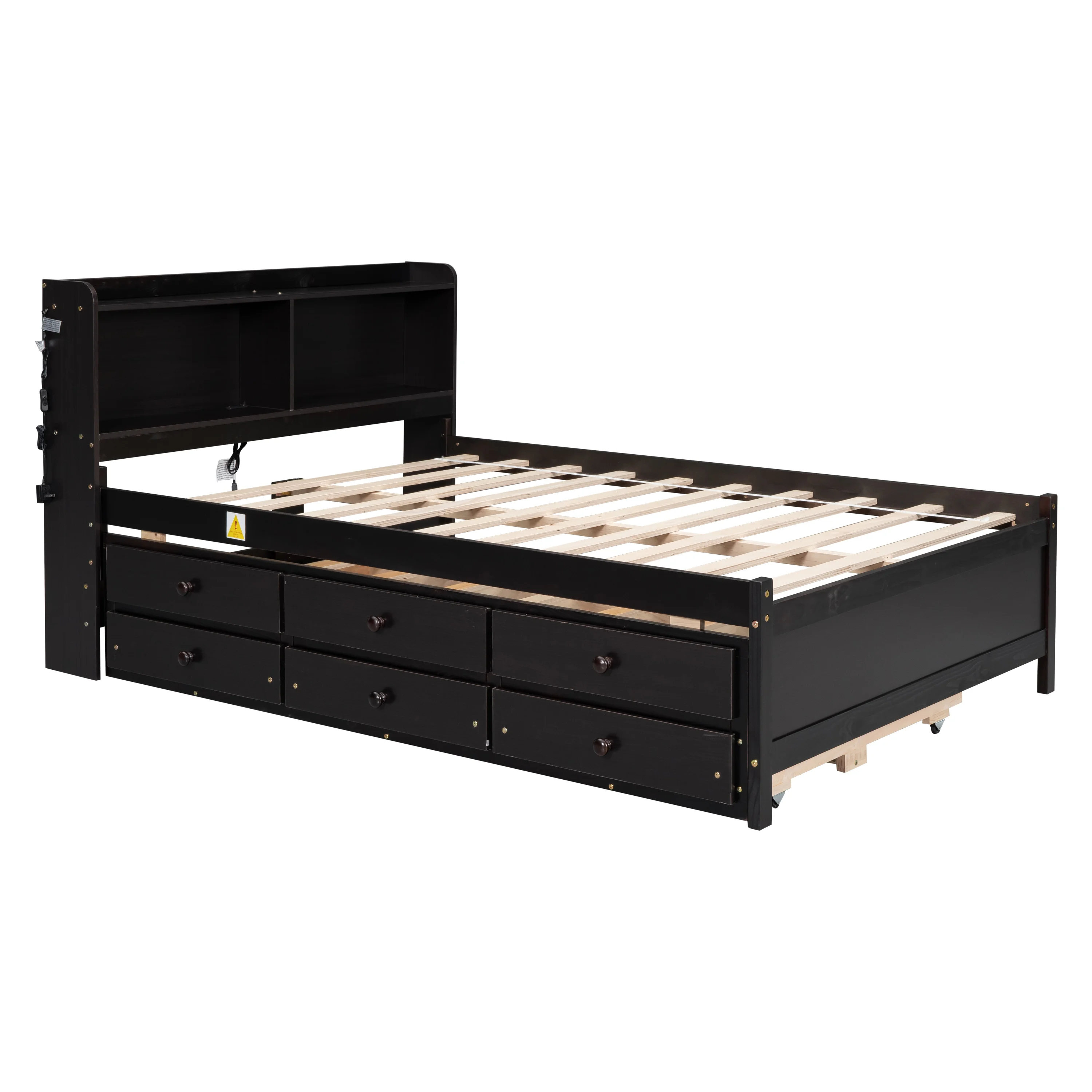 Full Size Bed with USB & Type-C Ports, Bookcase Headboard, Trundle & 3 Drawers, LED Light Strip, Easy Assembly,White