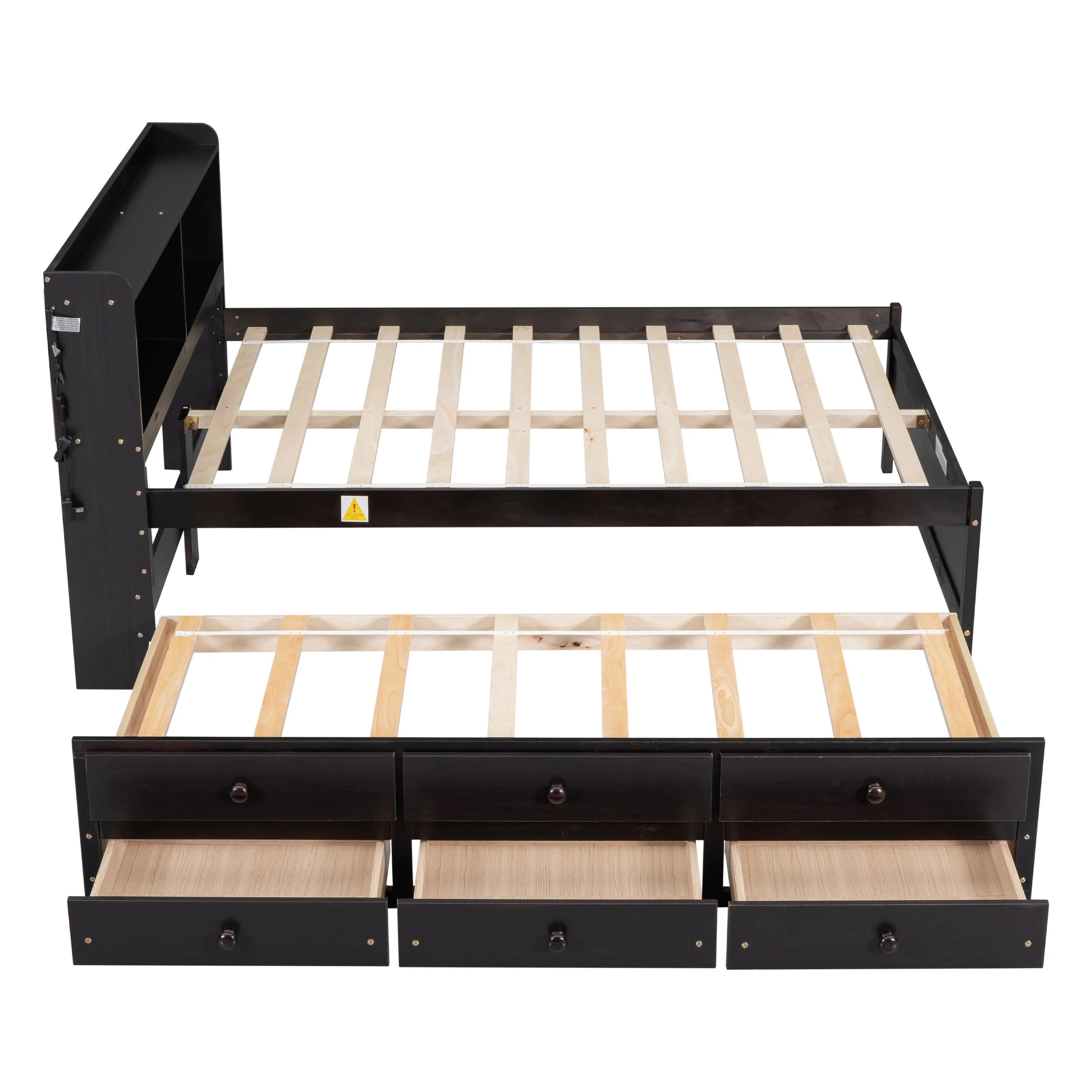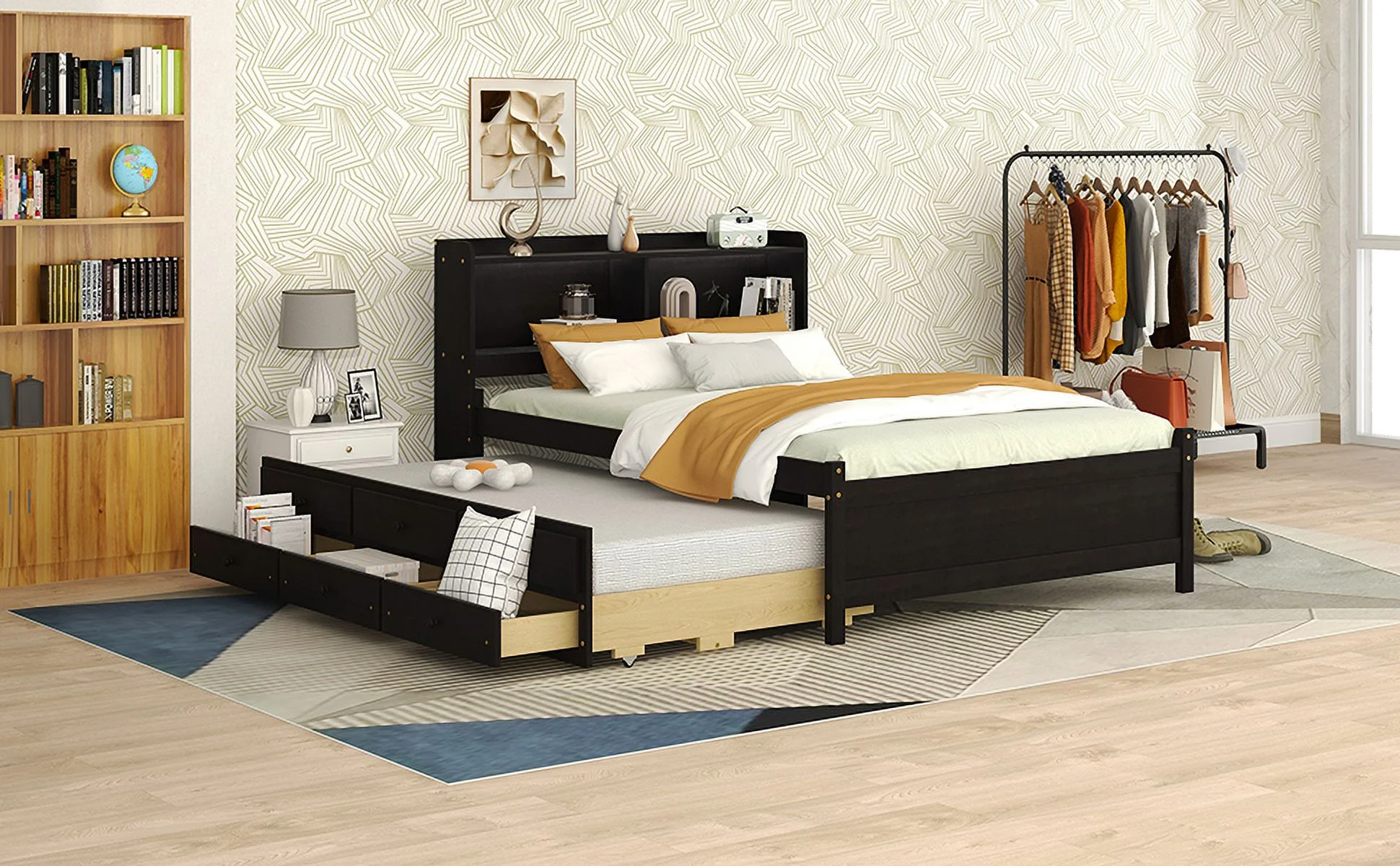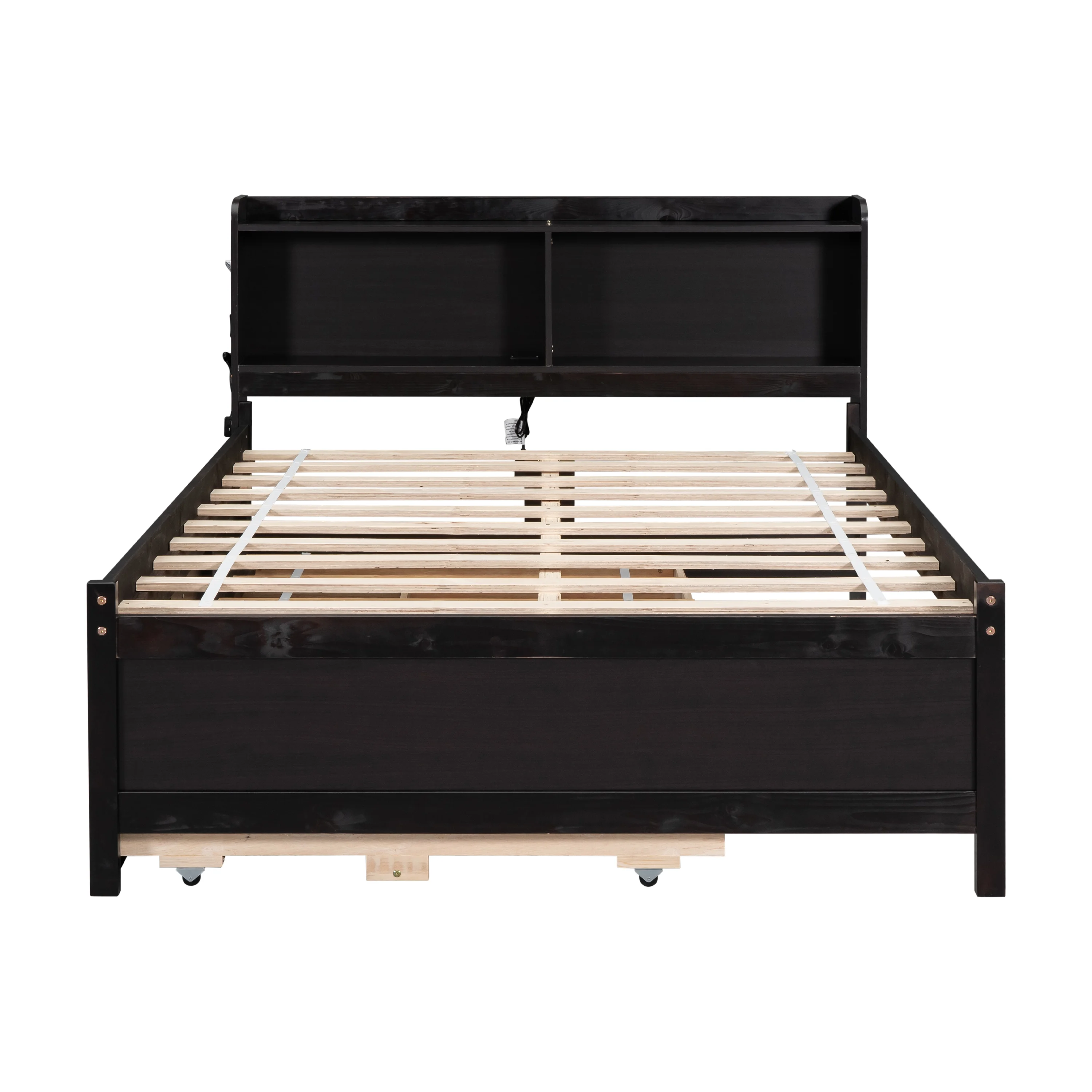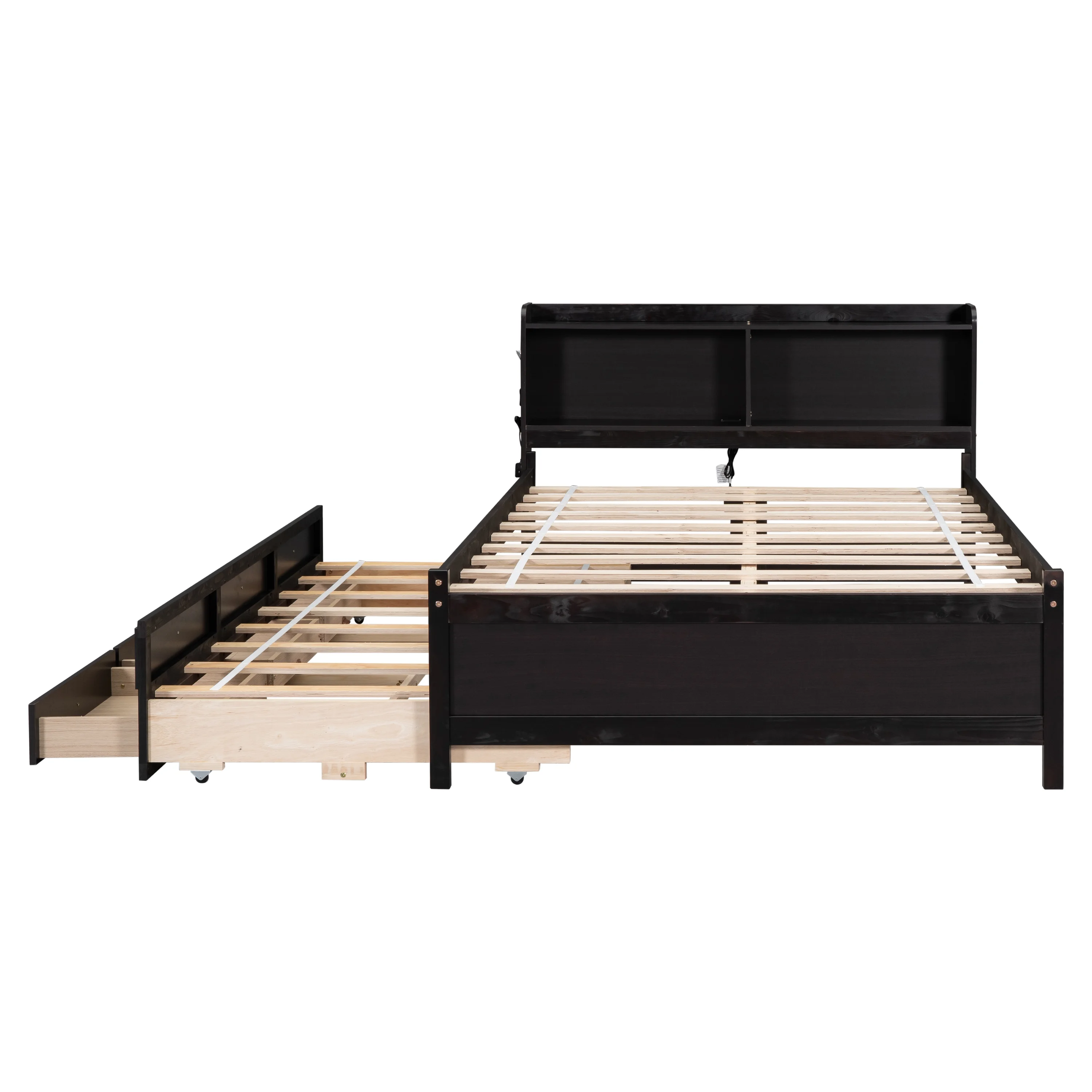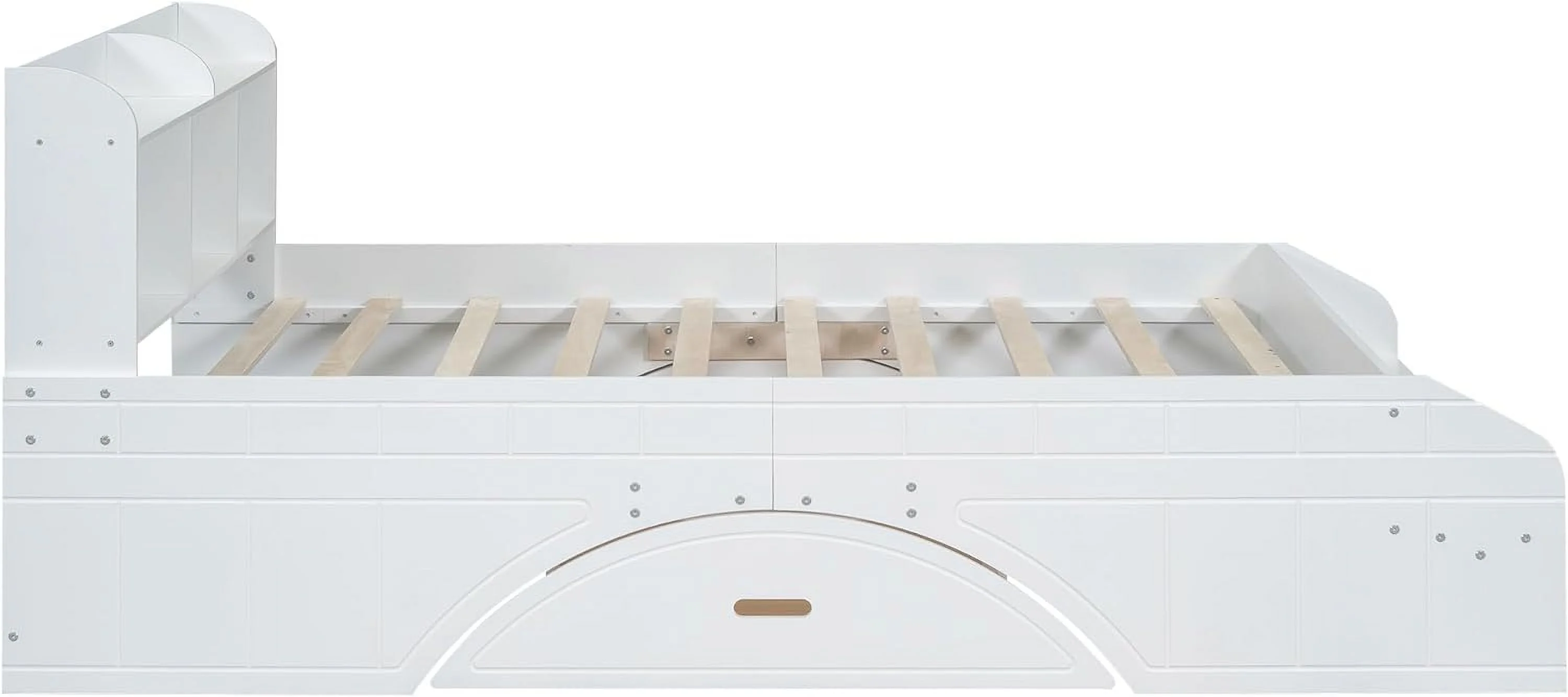 Full Size Bed with USB & Type-C Ports, Bookcase Headboard, Trundle & 3 Drawers, LED Light Strip, Easy Assembly,White