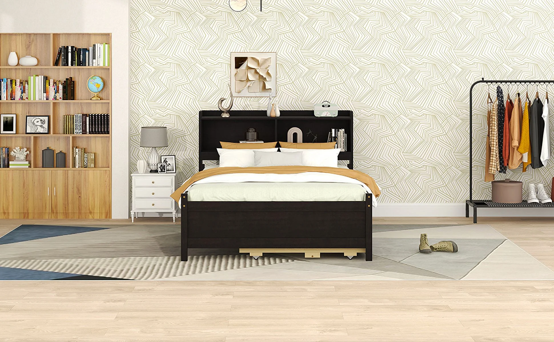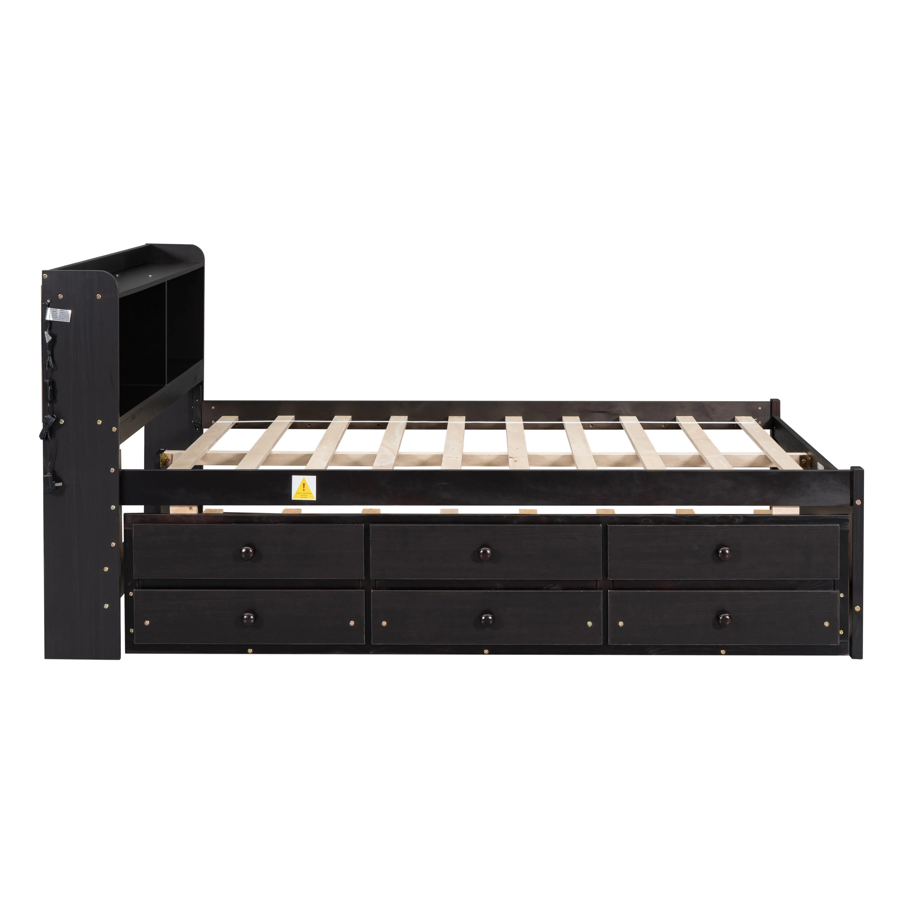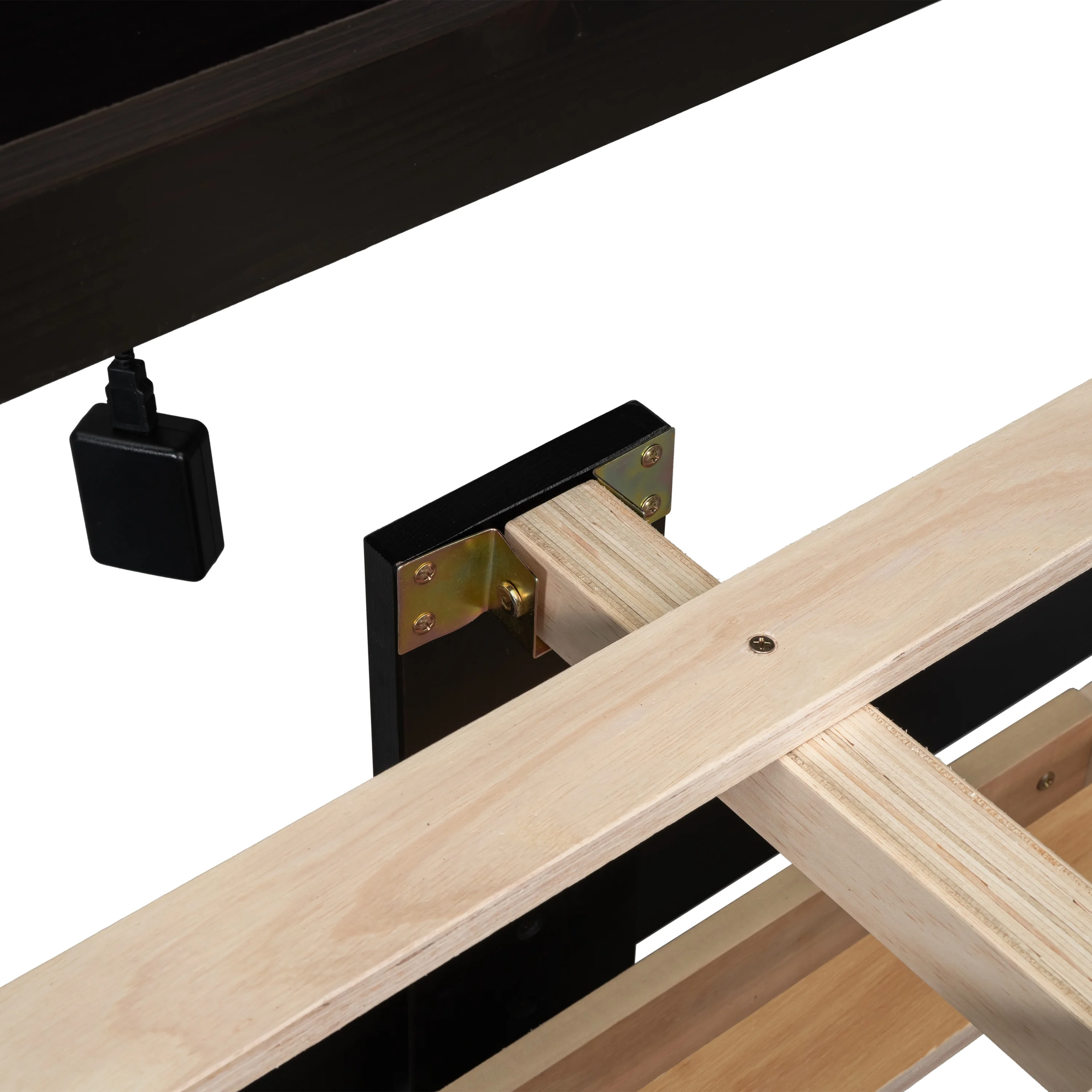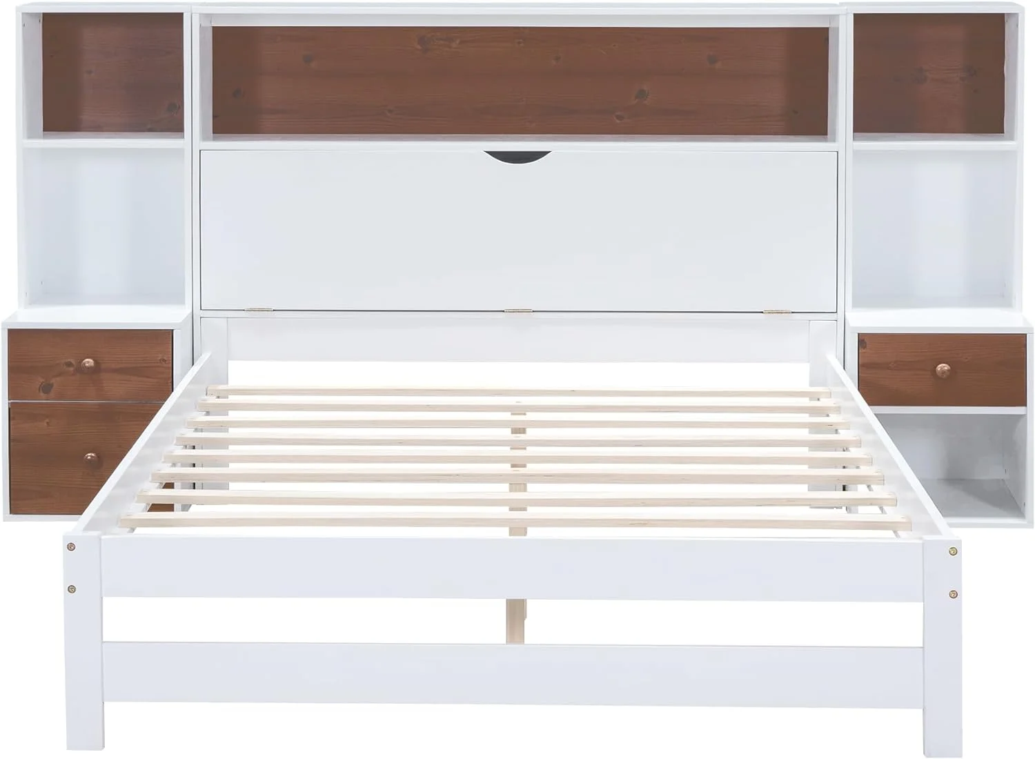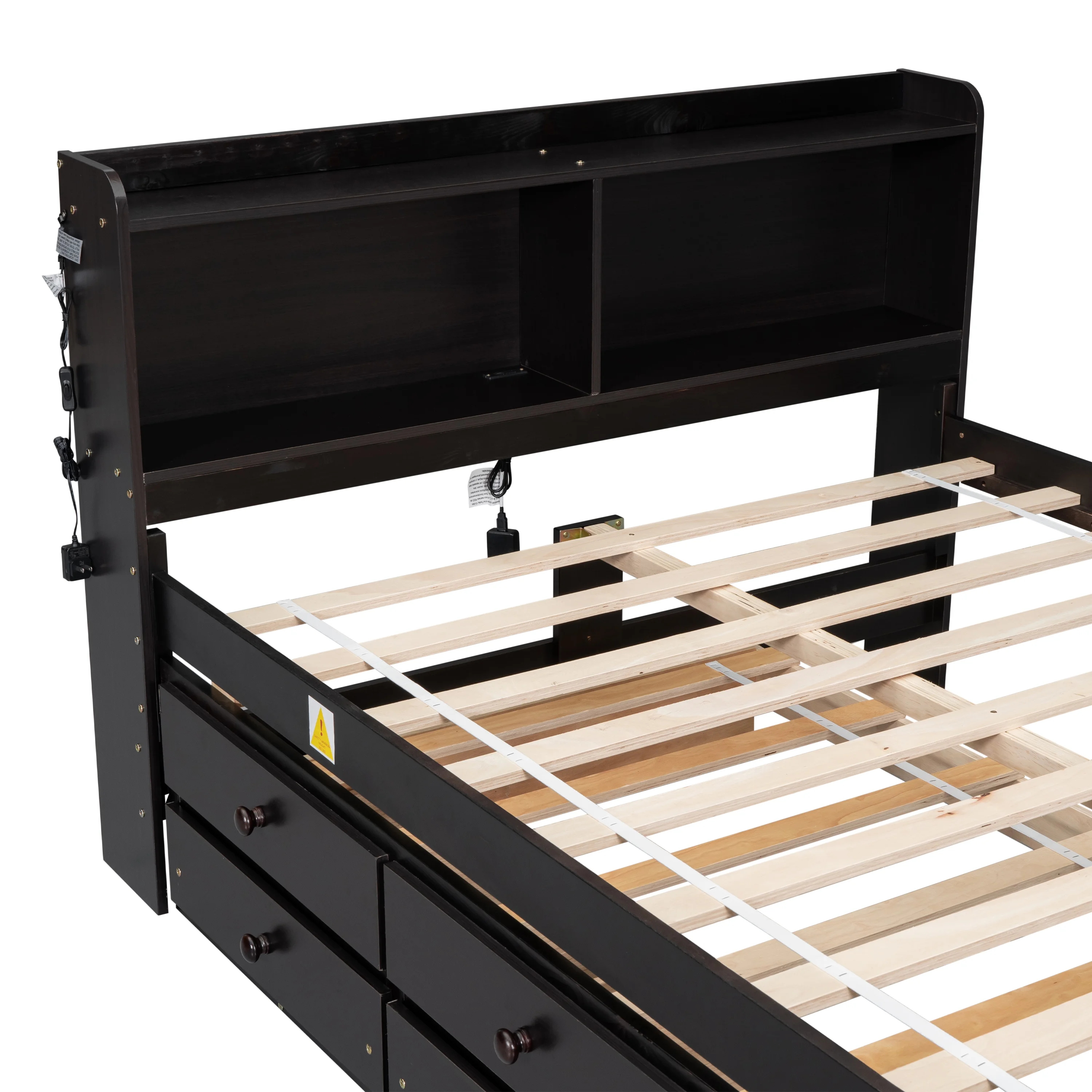 Full Size Bed with USB & Type-C Ports, Bookcase Headboard, Trundle & 3 Drawers, LED Light Strip, Easy Assembly,White