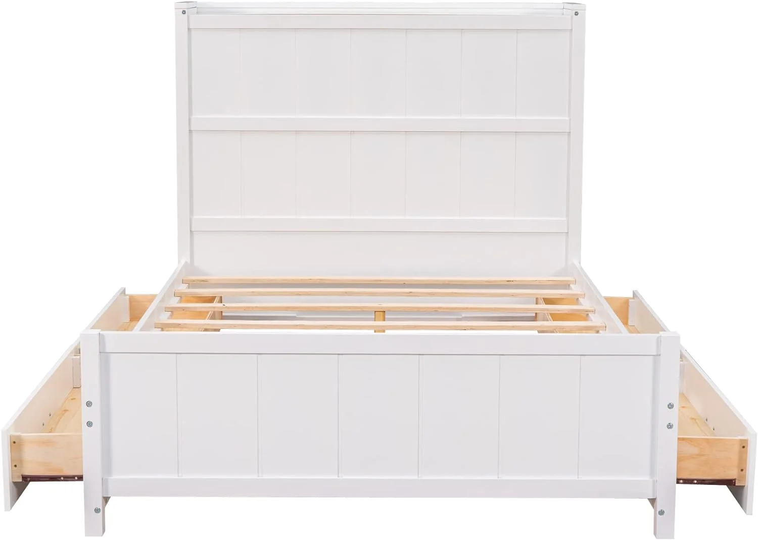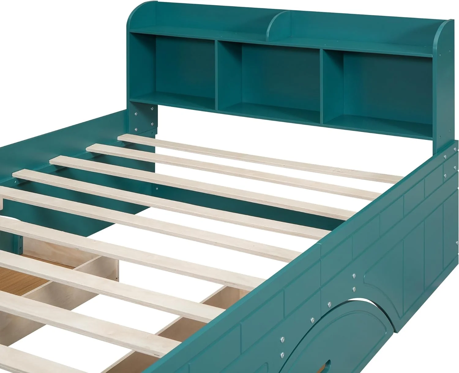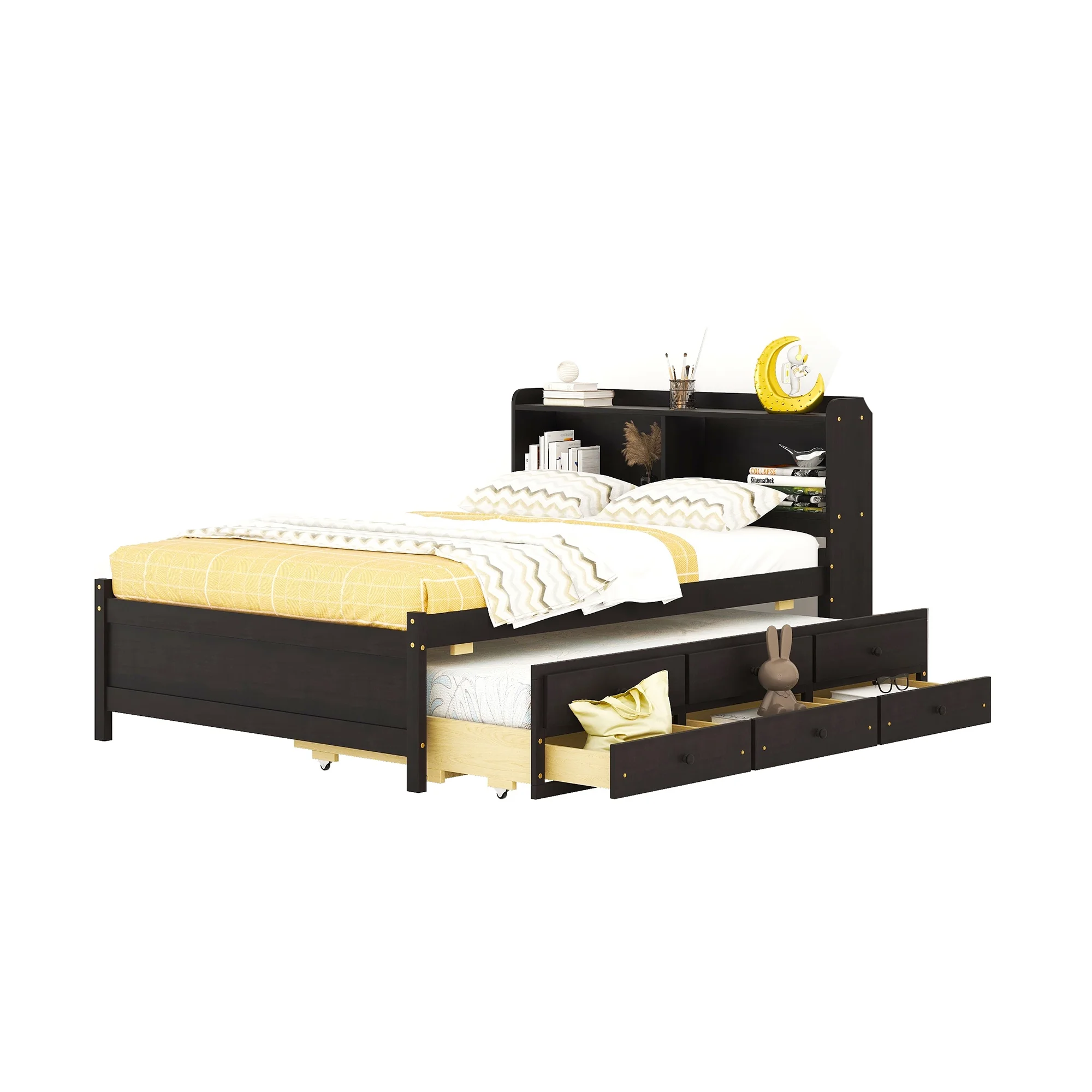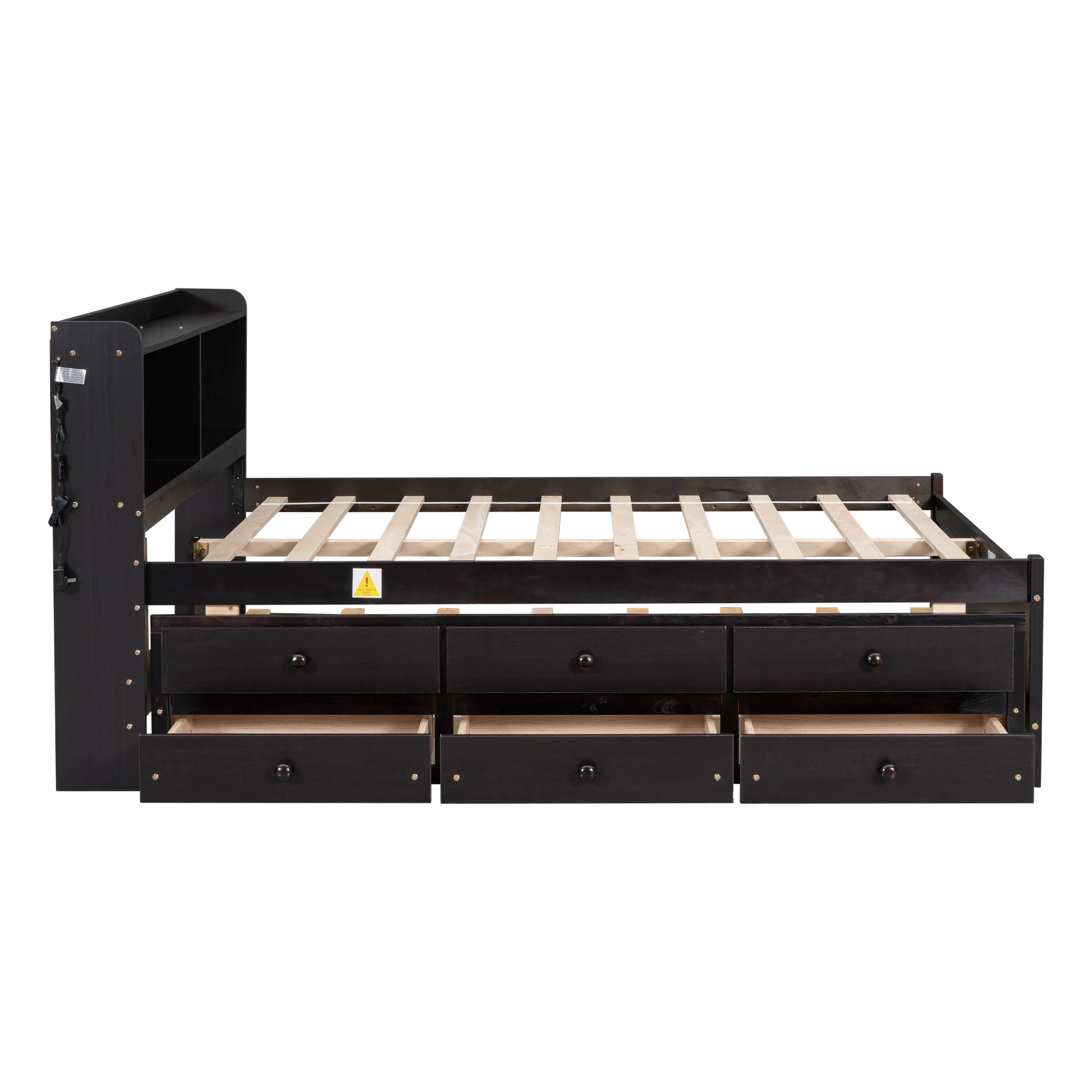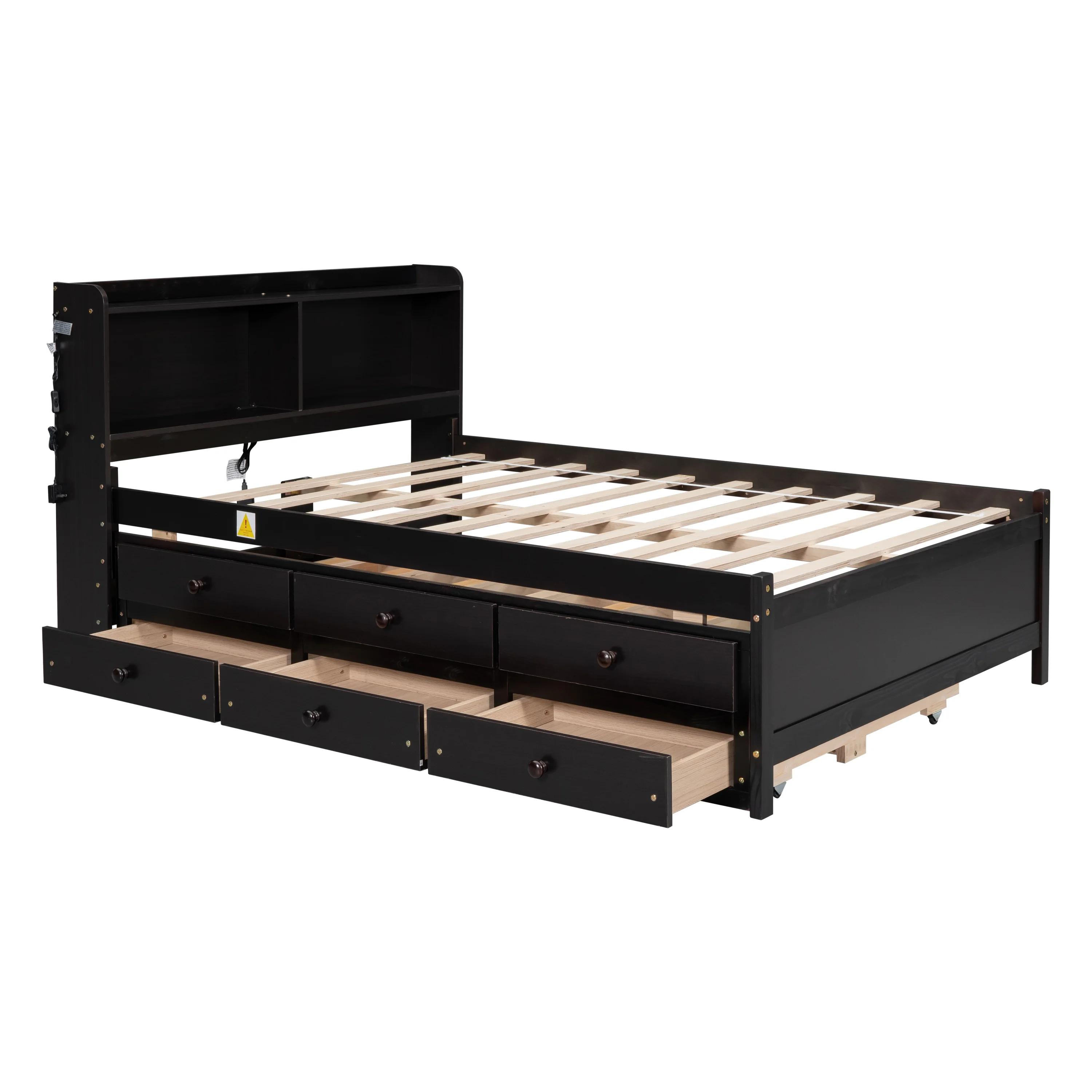 Full Size Bed with USB & Type-C Ports, Bookcase Headboard, Trundle & 3 Drawers, LED Light Strip, Easy Assembly,White