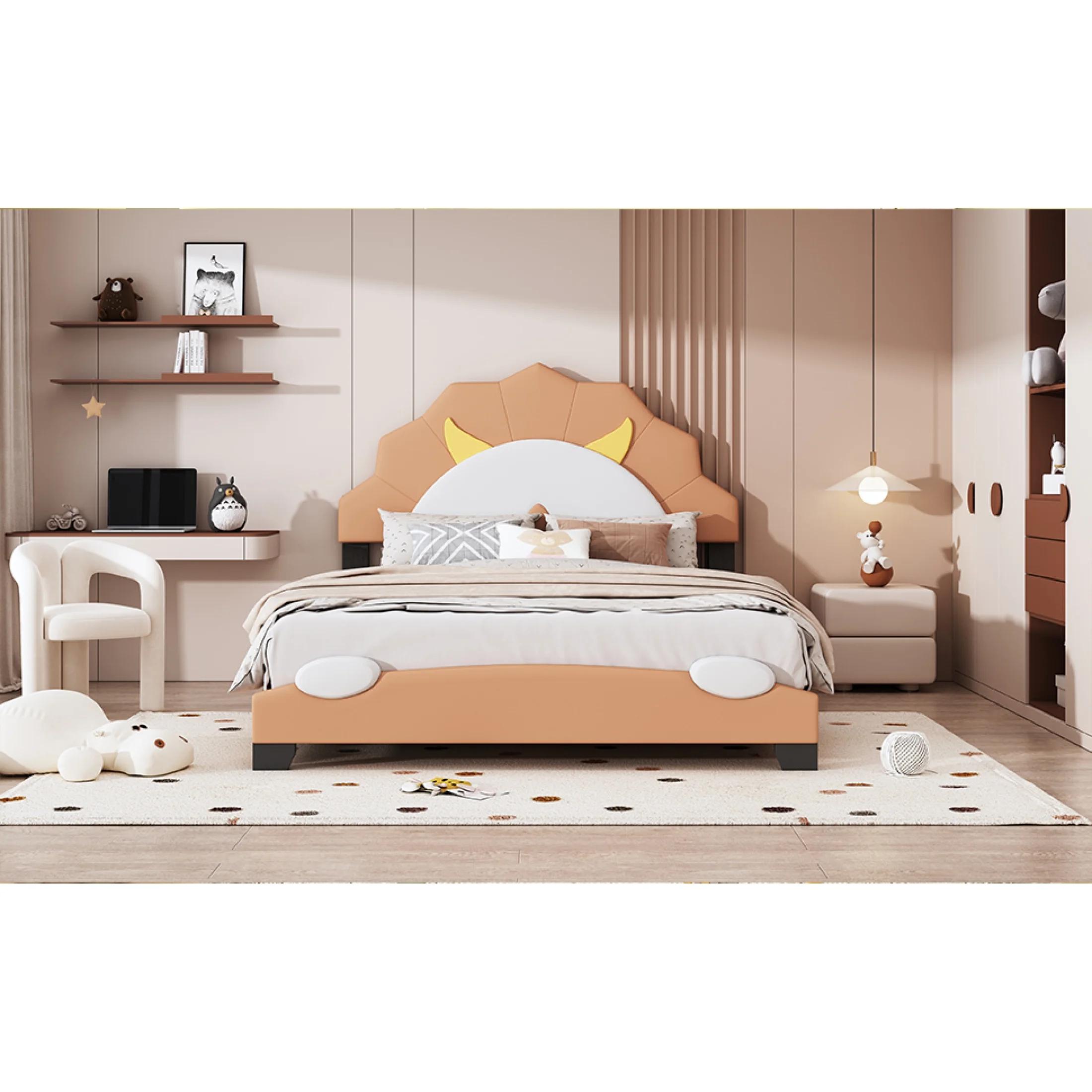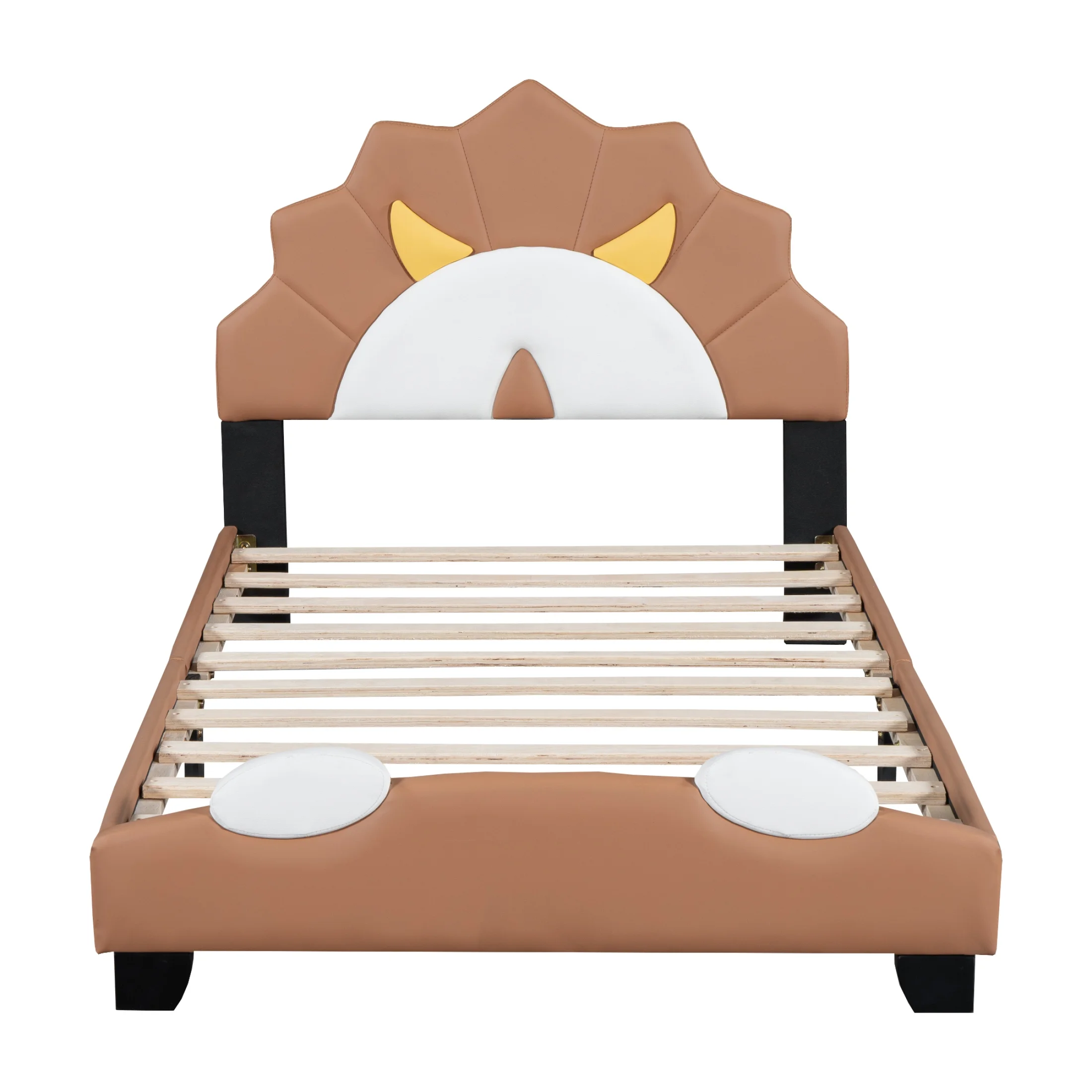 Twin Size Upholstered Leather Platform Bed with Lion-Shaped Headboard, Brown
