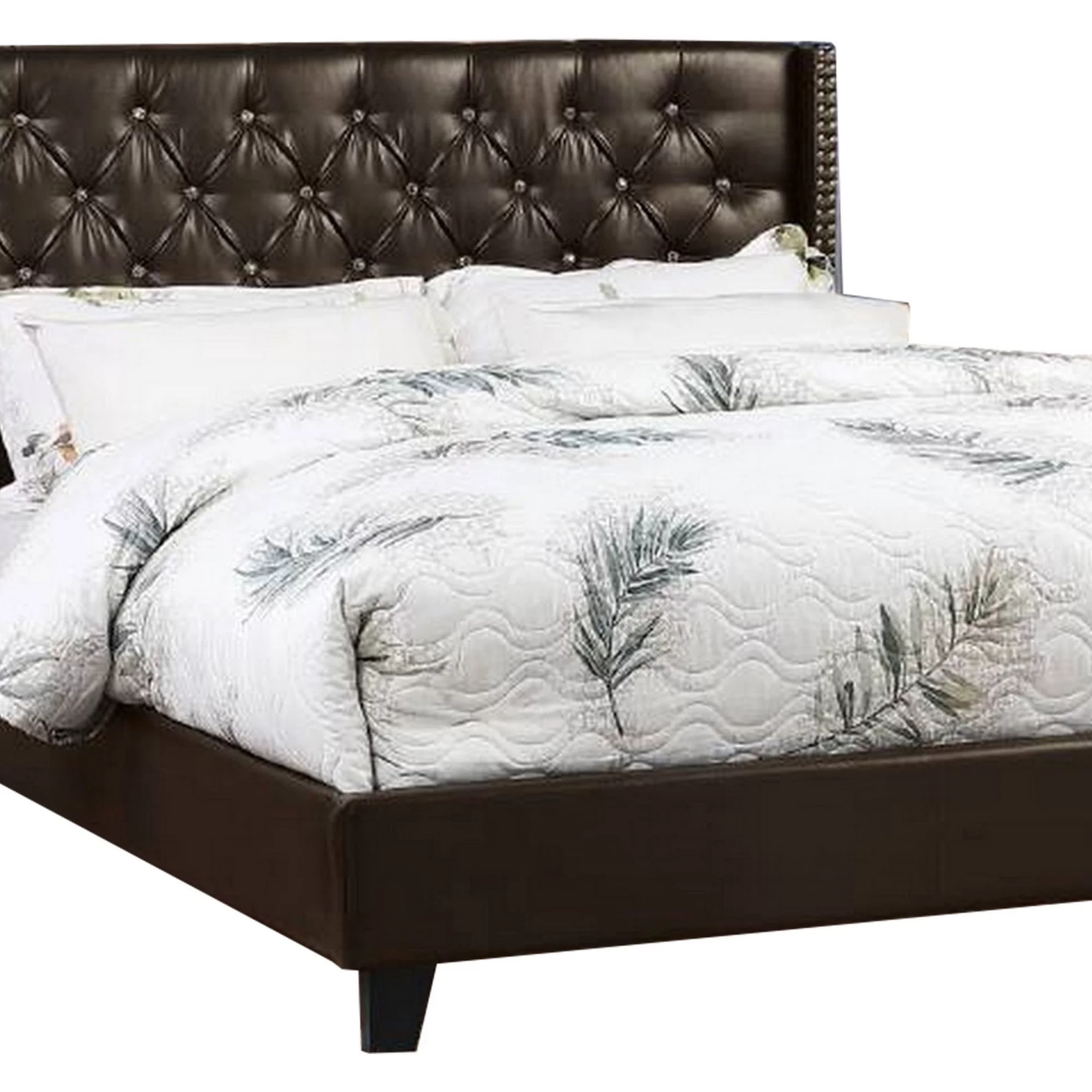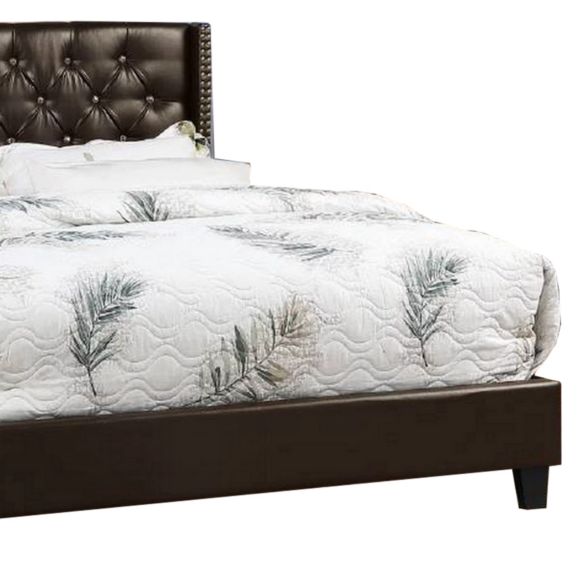 Benjara BM300220 Asu Wood Bed with Nailhead Trim, Faux Leather Upholstered, Brown - Queen Size