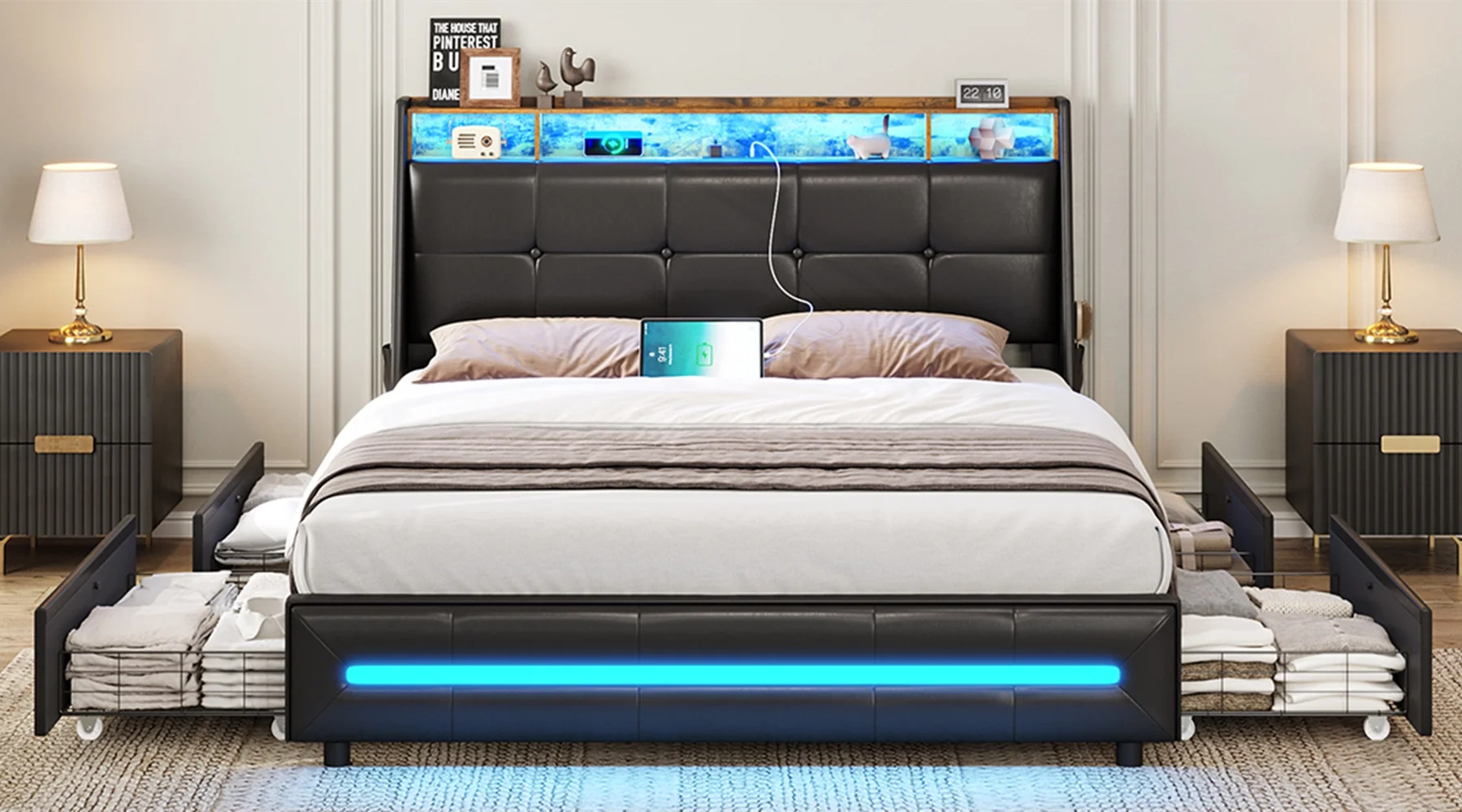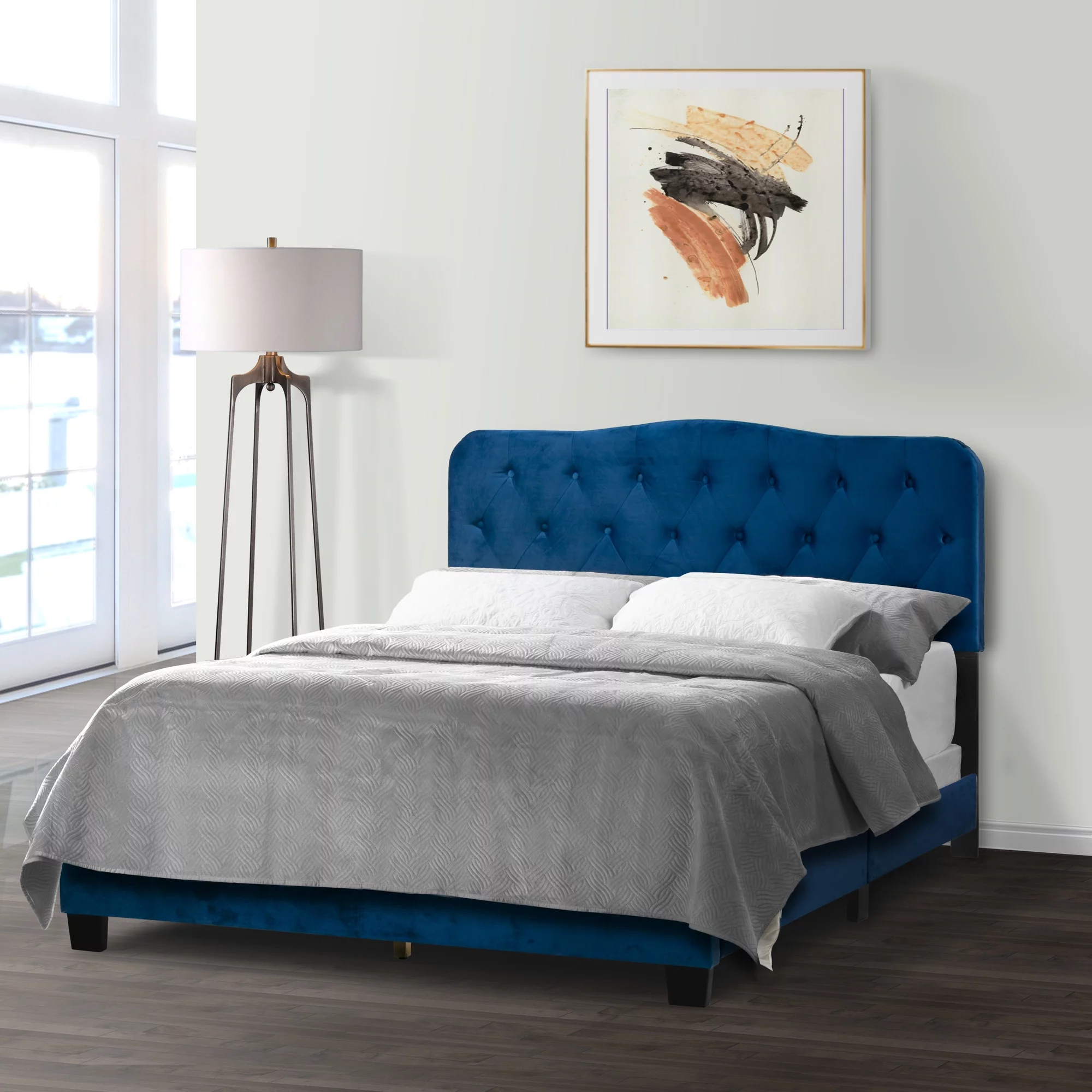 Glamour Home Arin Queen Bed with Button Tufting and Nail Head Trim in Blue