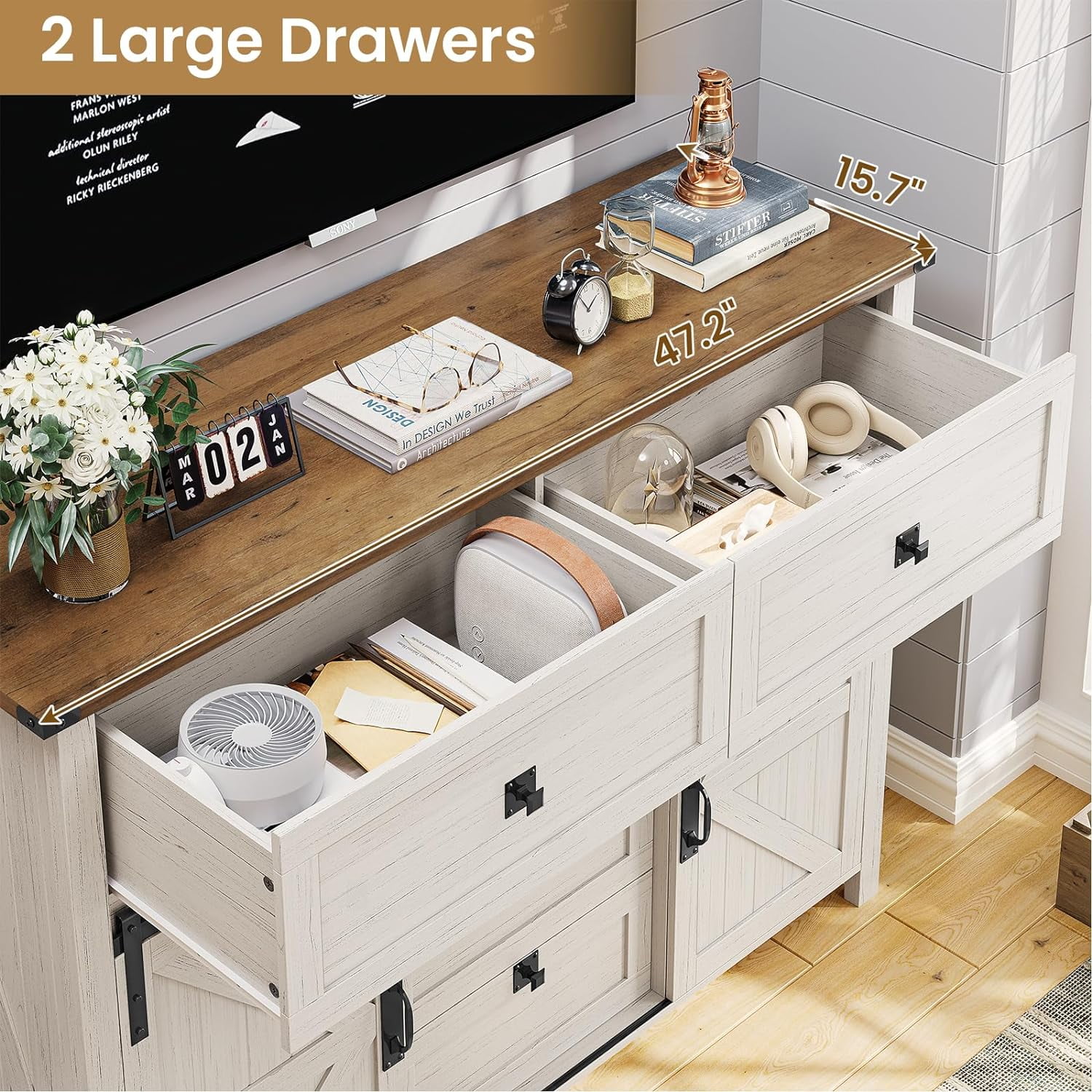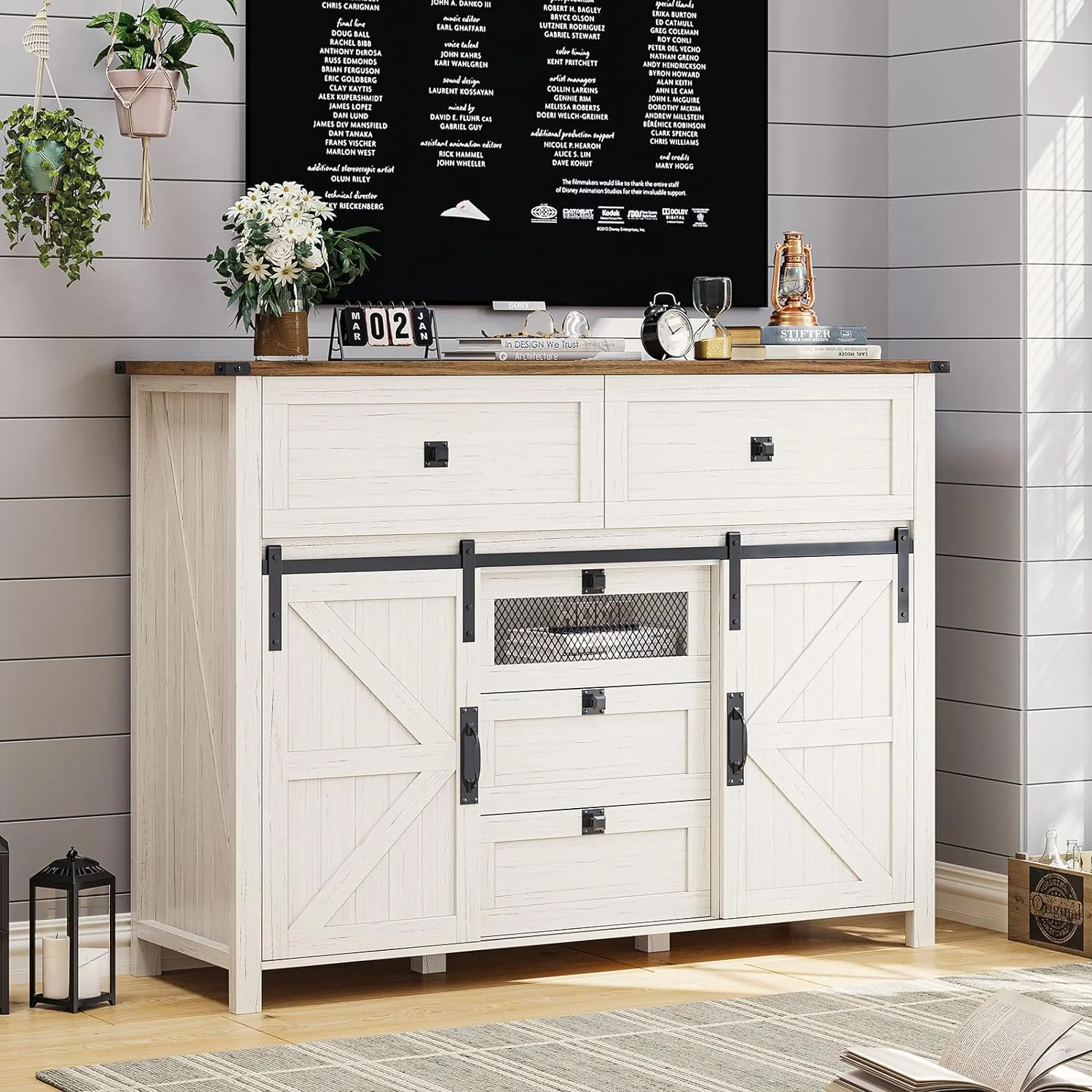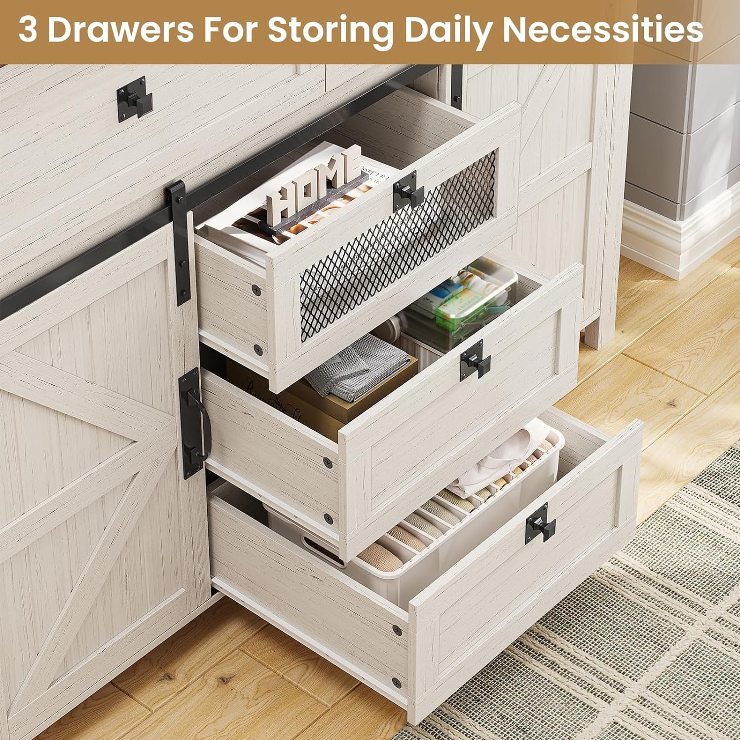 Afuhokles Dressers for Bedroom with 5 Drawers and Sliding Barn Doors, Farmhouse Wood Large Capacity Chest of Drawers
