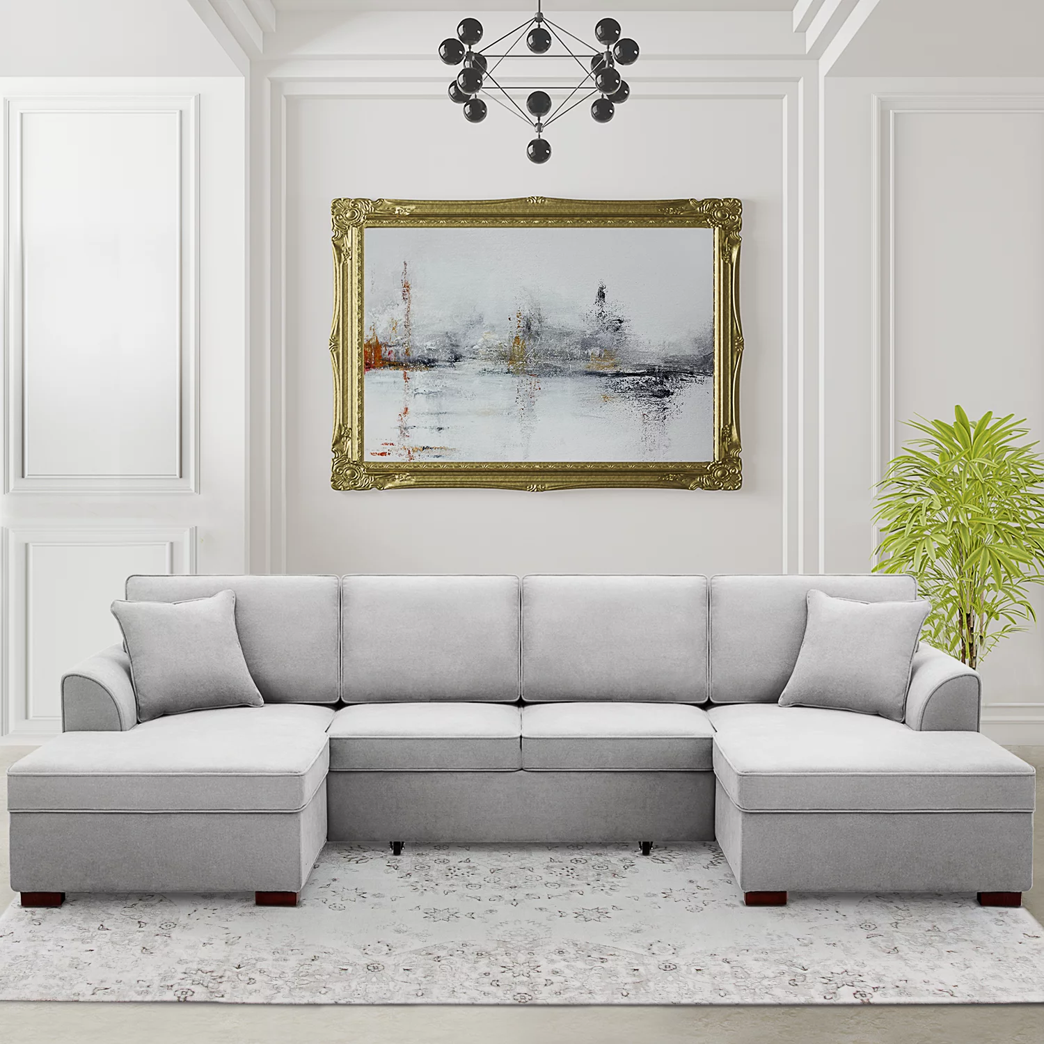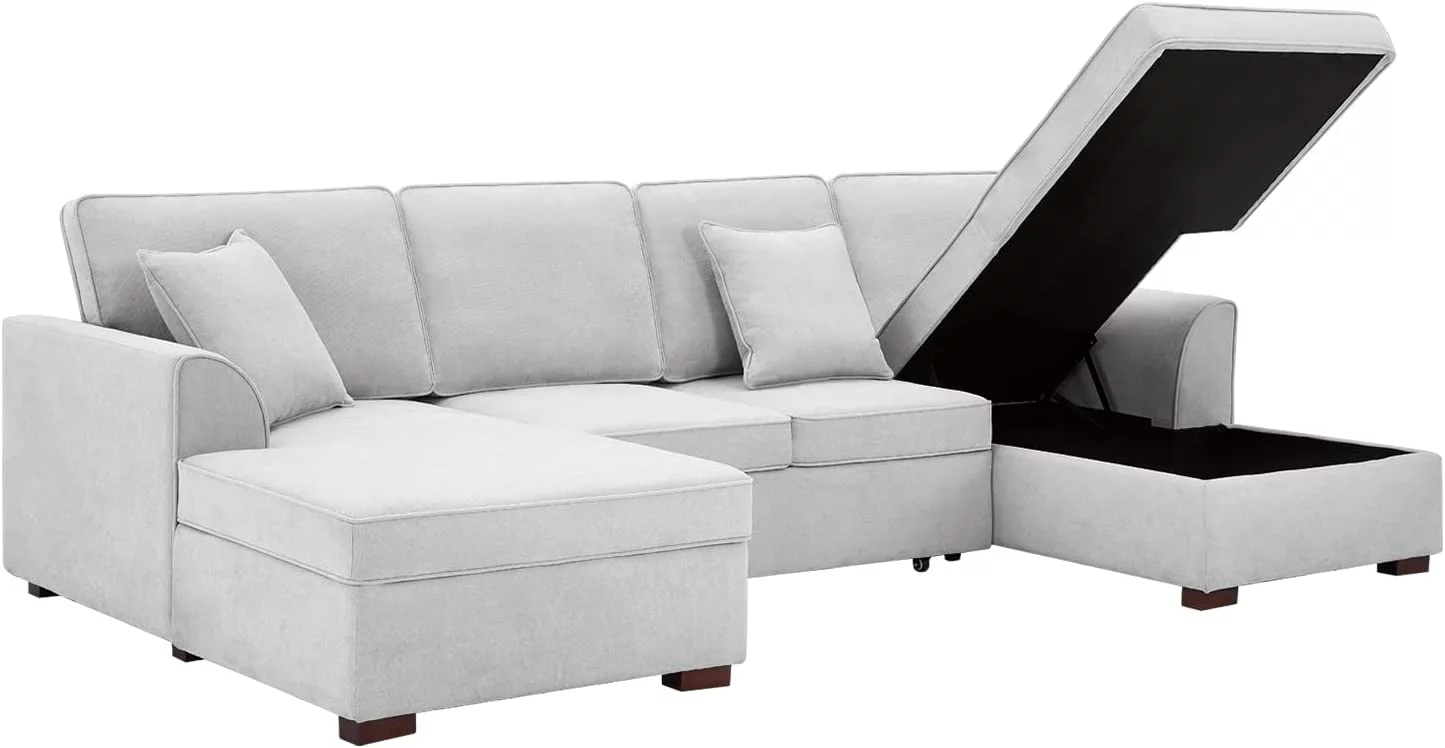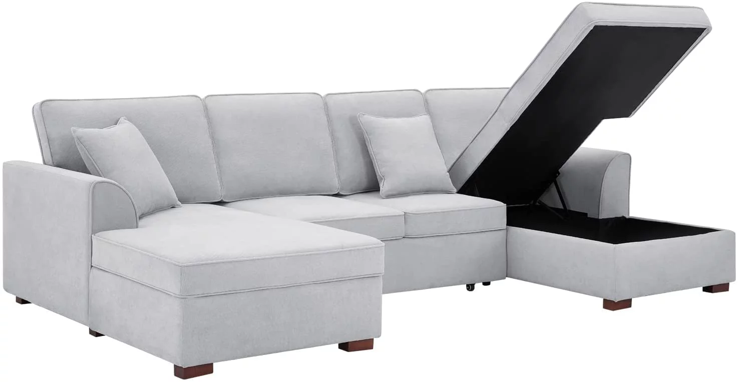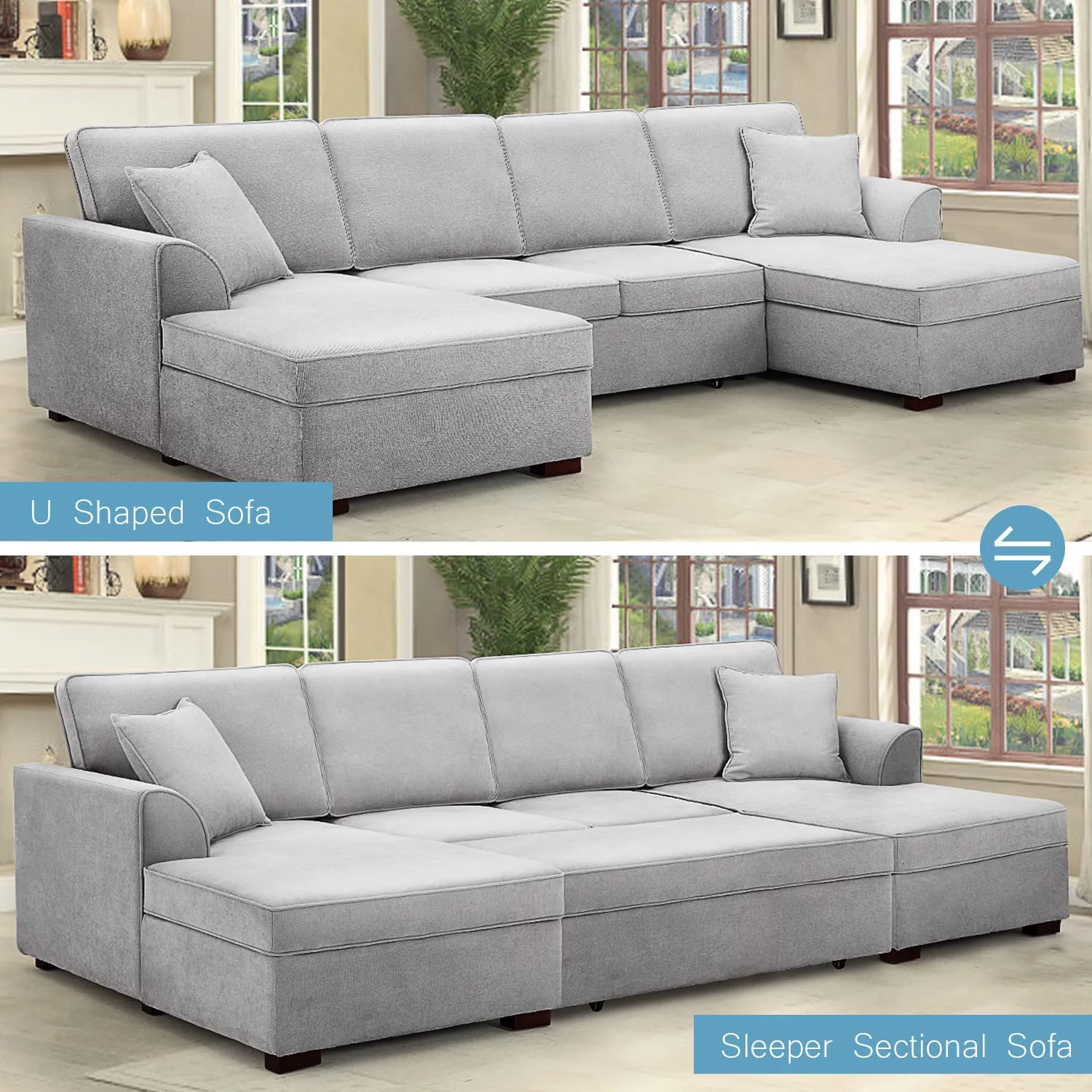 Hommow U-Shaped Sectional Sofa with Pull-Out Bed, Upholstered Modular Couch with Storage, Gray