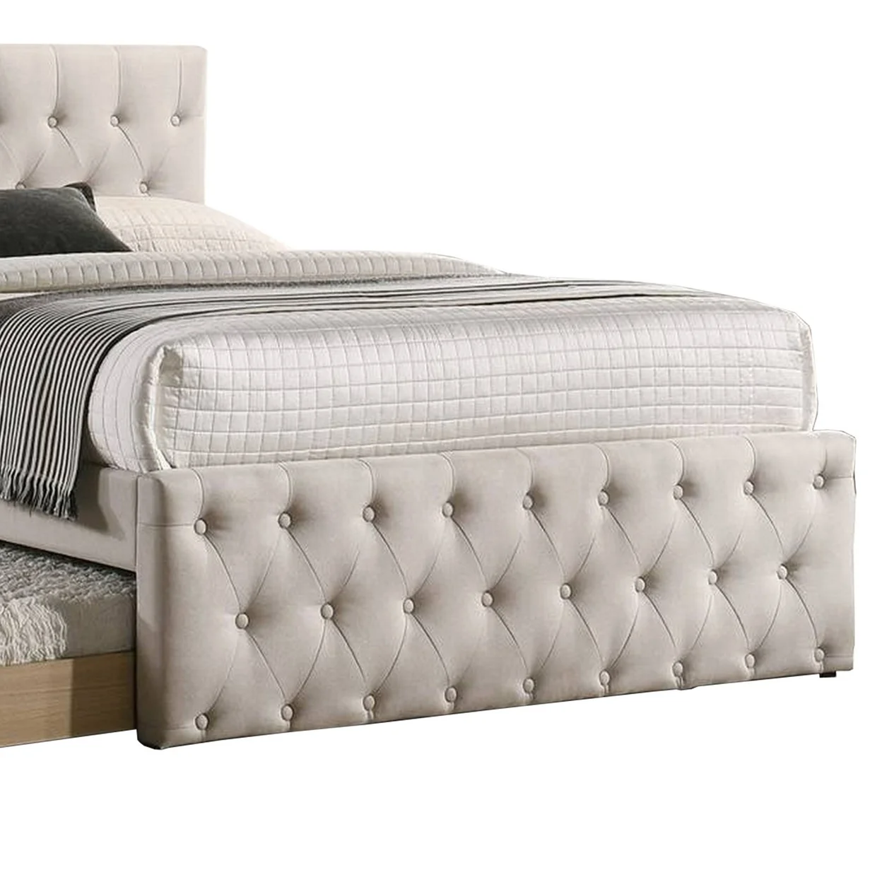 Nek Wood Twin Size Upholstered Bed with Trundle Tufted Taupe Burlap Frame- Saltoro Sherpi