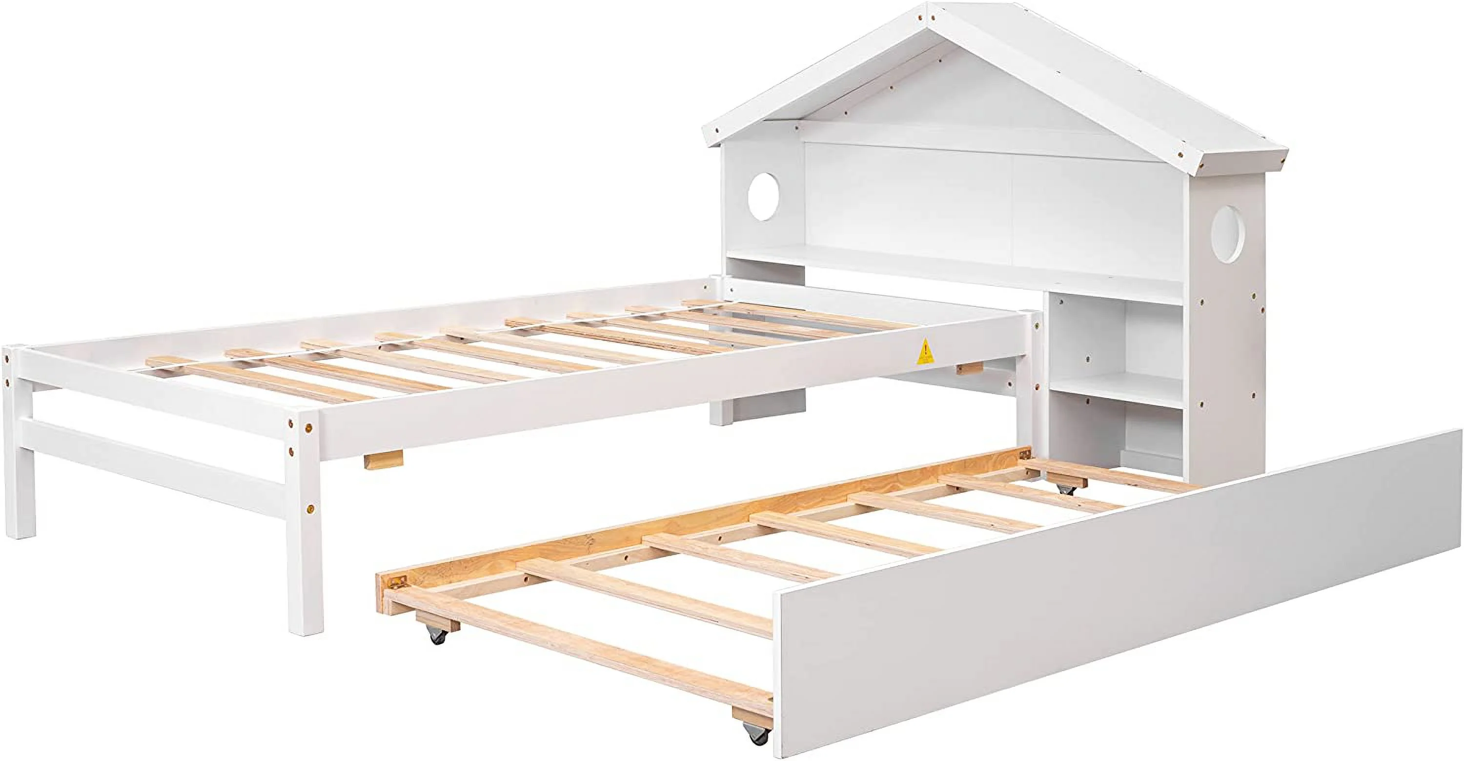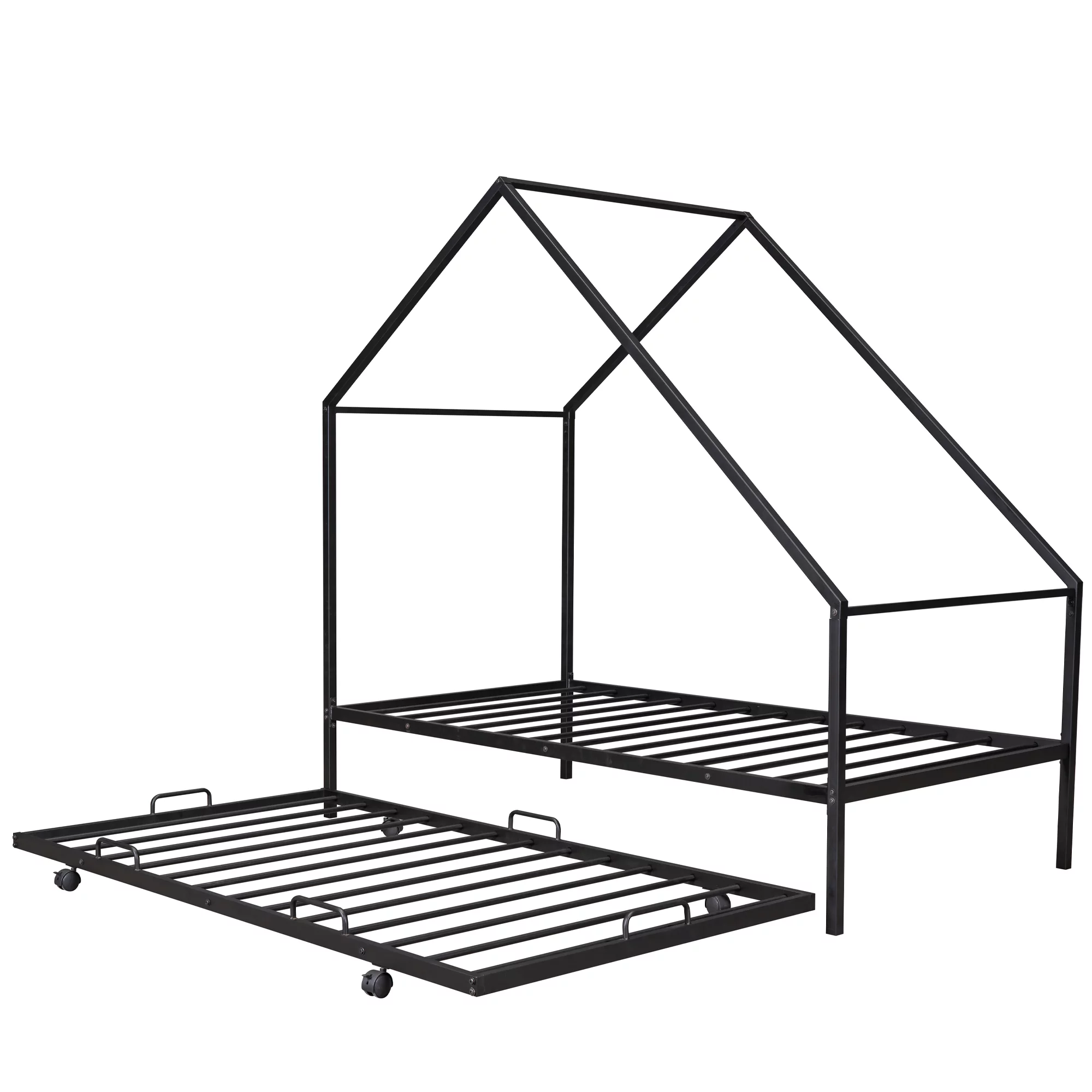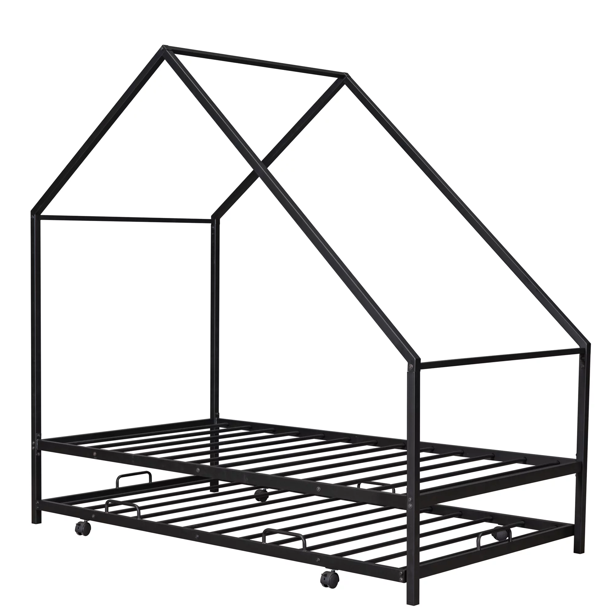 Gewnee Metal House Bed With Trundle,Kids Twin Size House Shaped Platform Bed Frame,Black