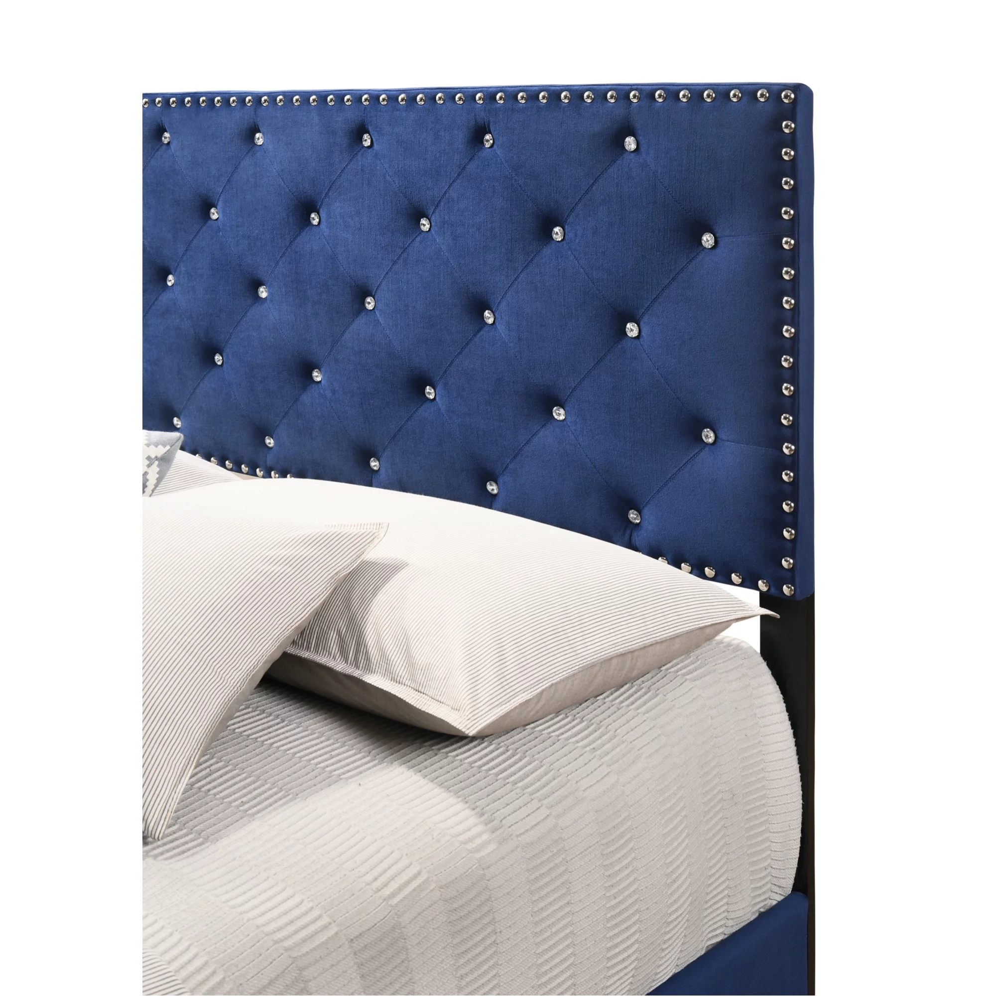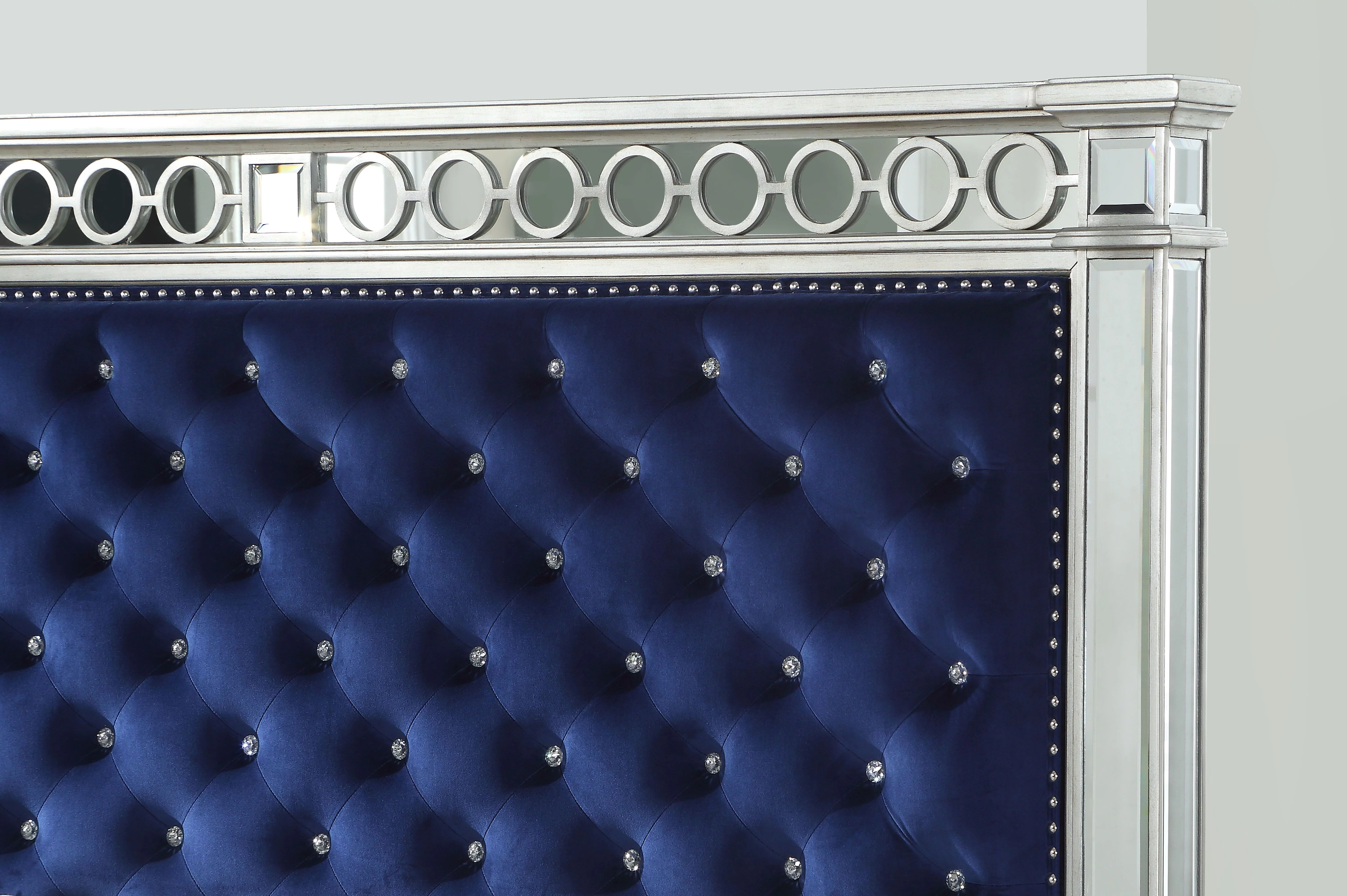 ACME Varian California King Tufted Panel Bed in Blue Velvet and Mirrored