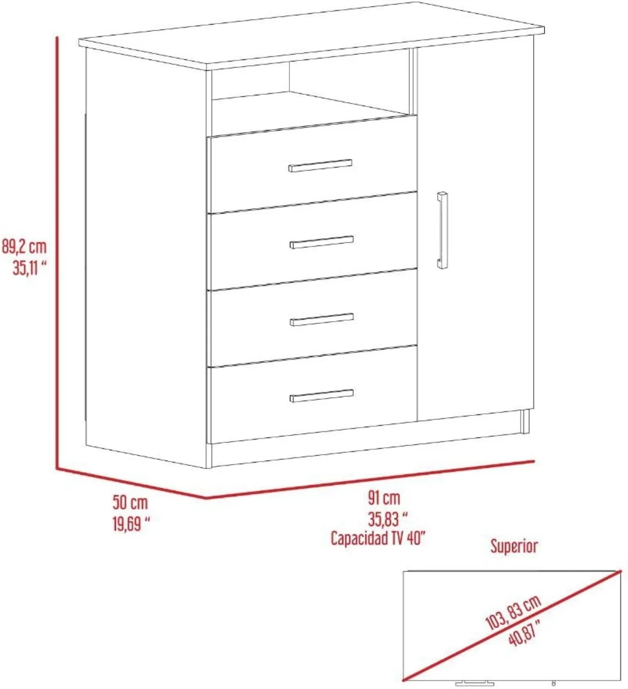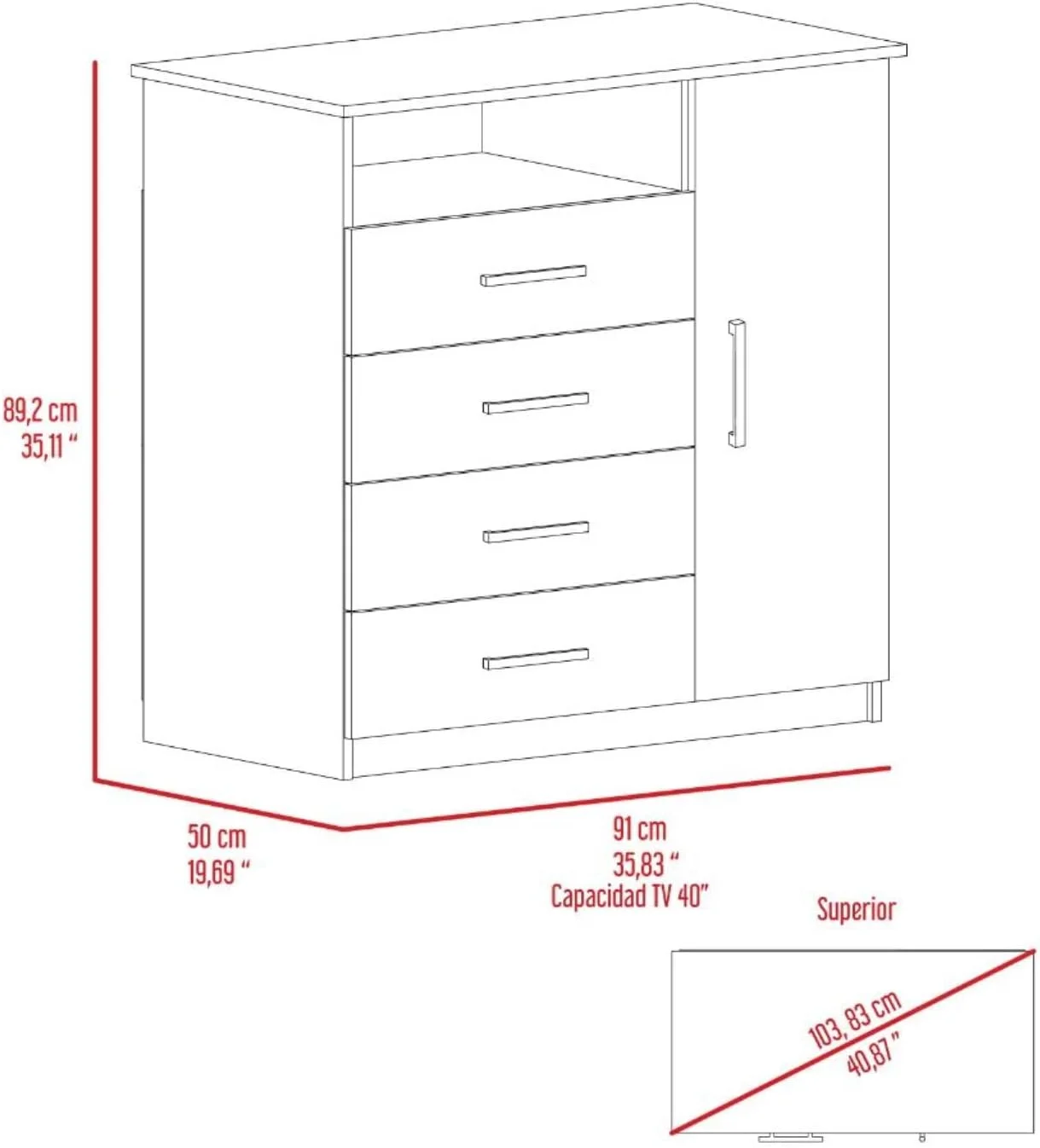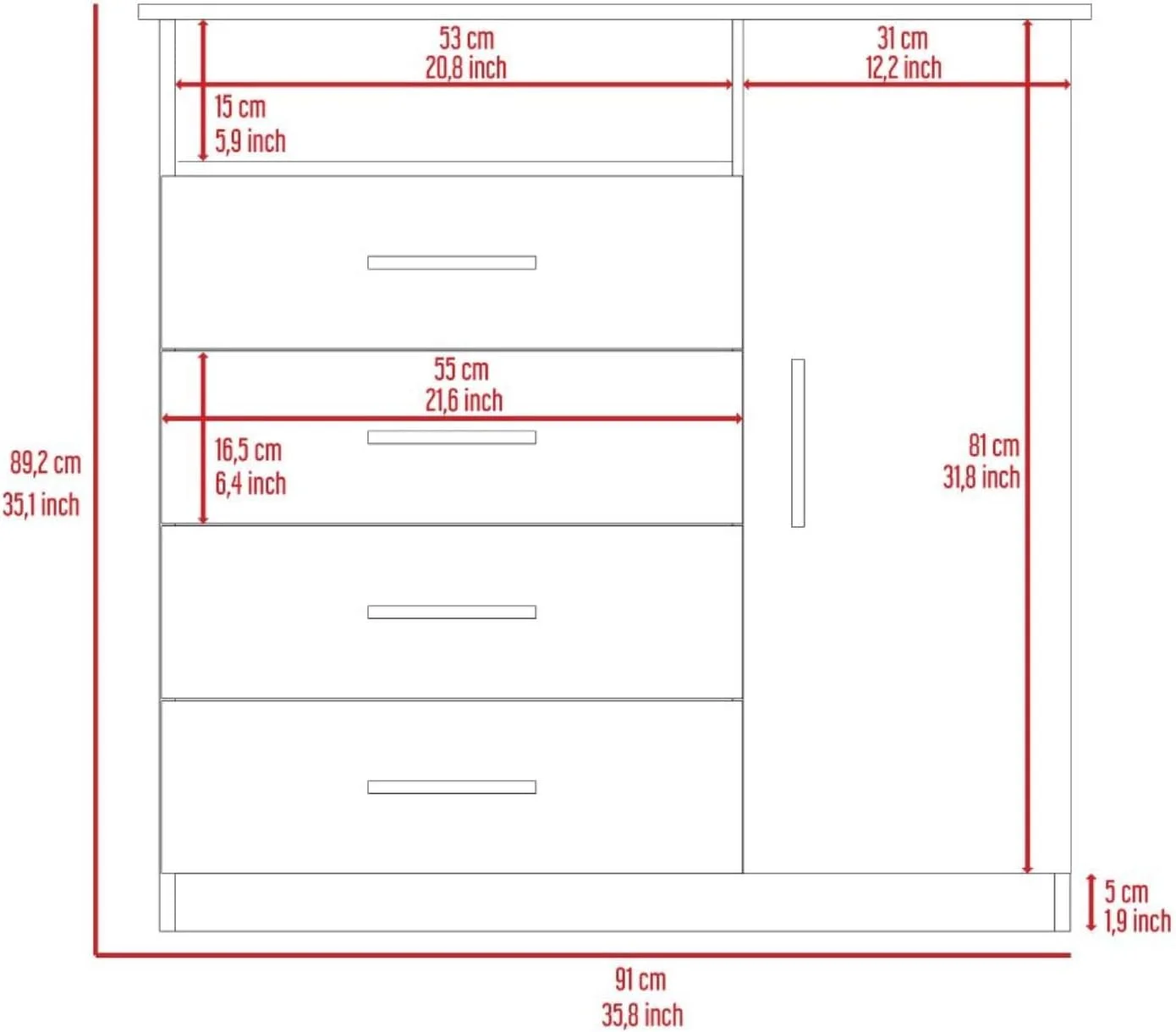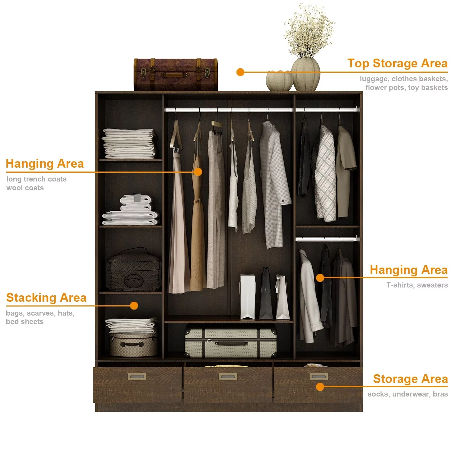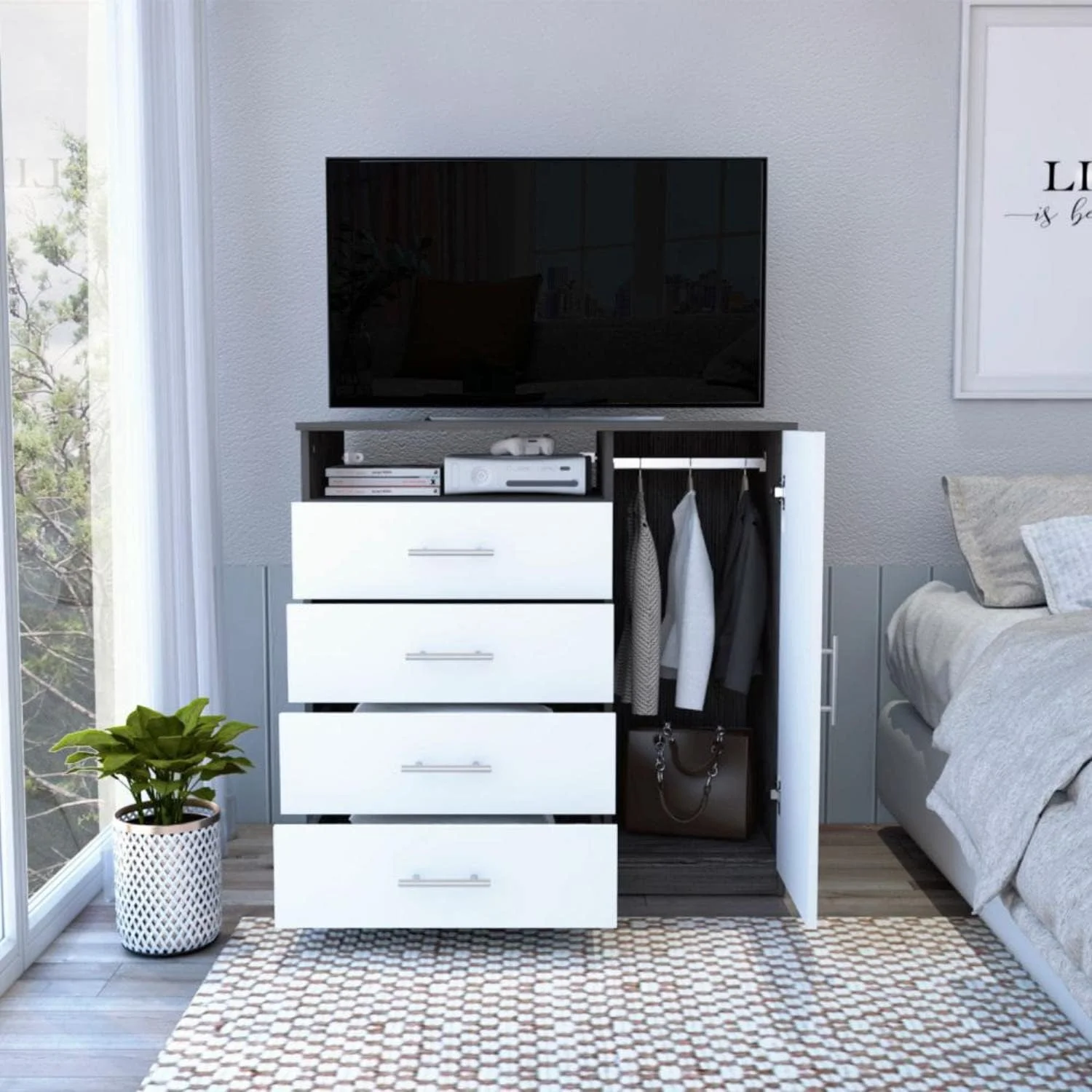 Rioja Dresser With 4 Drawers, Cabinet, Hanging Rod, And Open Shelf, Smokey Oak/White