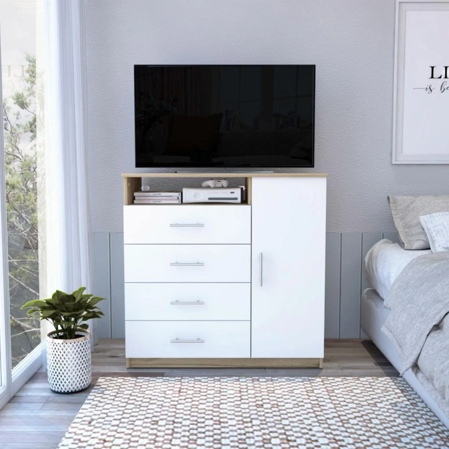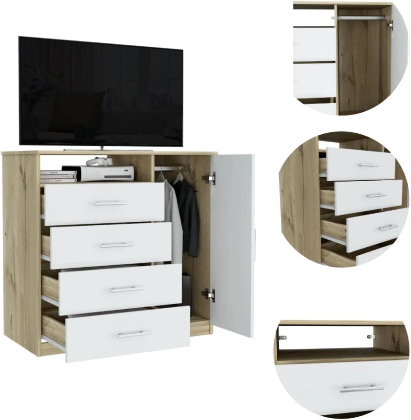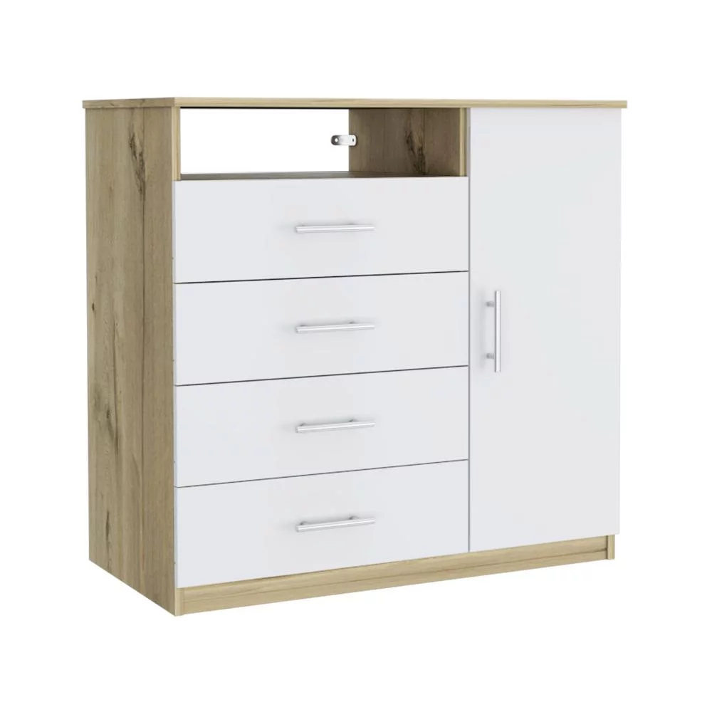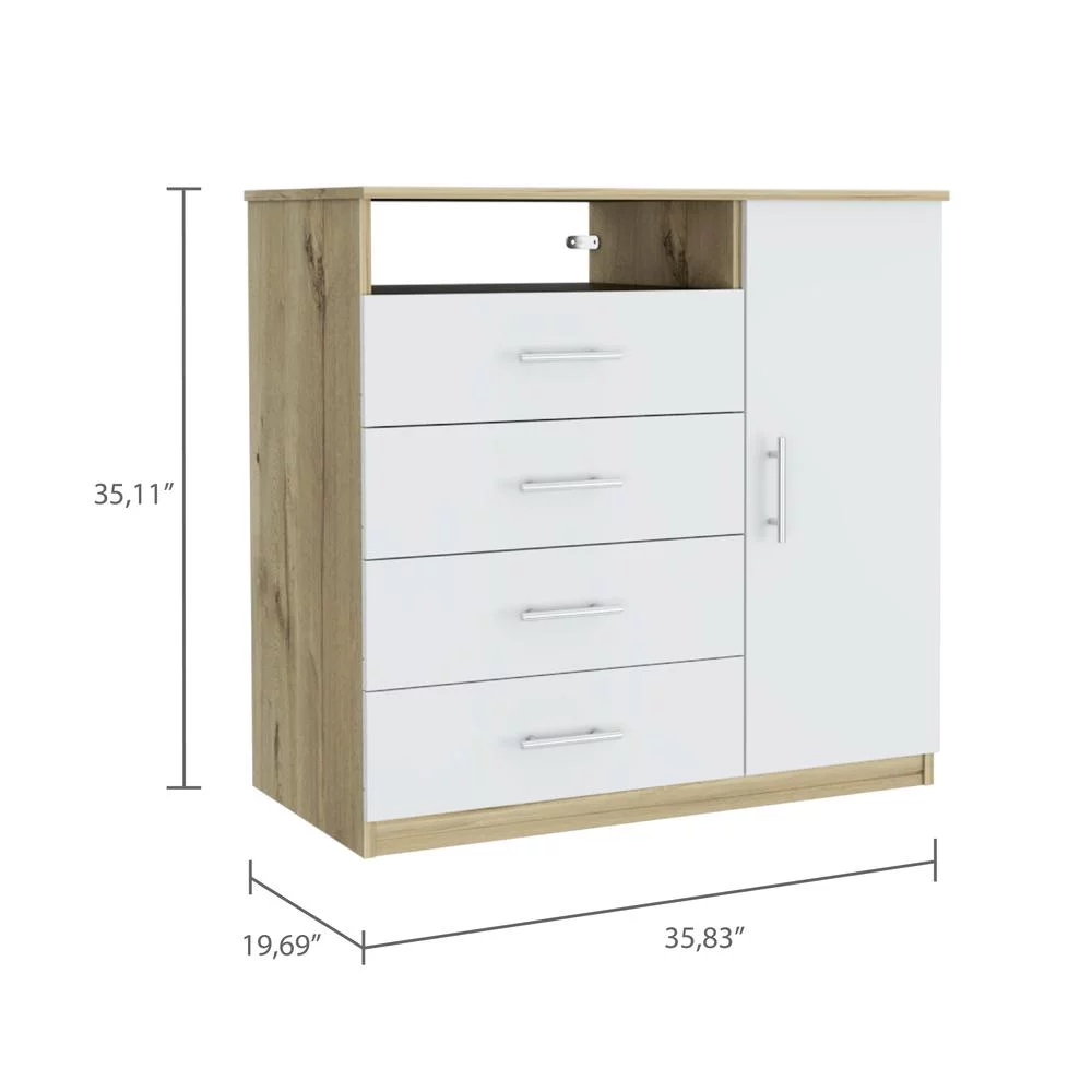 Depot E-Shop Rioja Dresser With 4 Drawers, Cabinet, Hanging Rod, And Open Shelf, Light Oak/ White