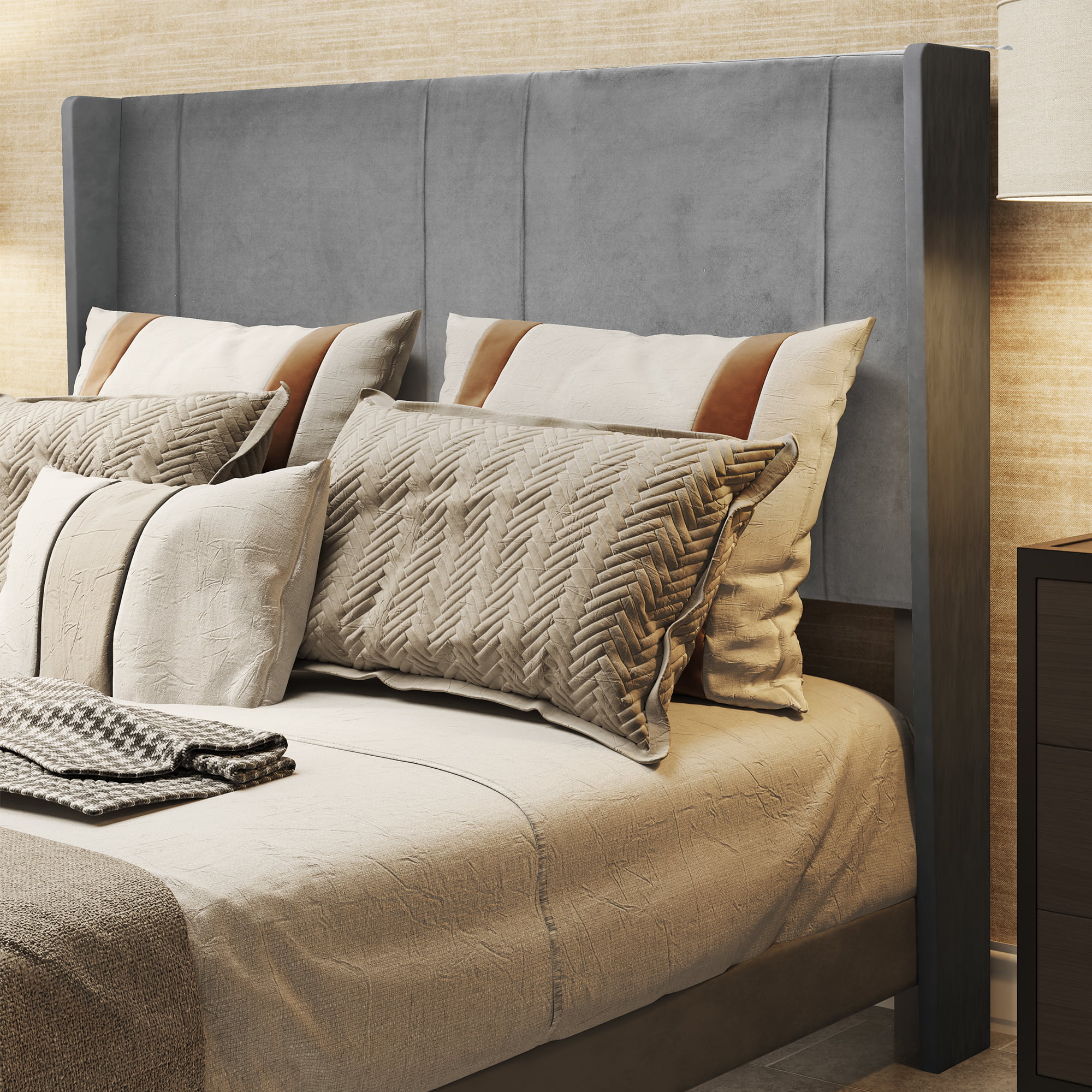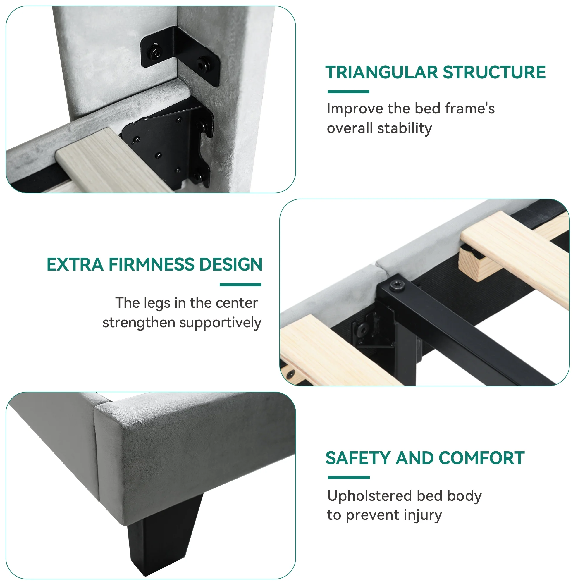 Dextrus Upholstered Wingback Platform Bed with Gray Velvet Headboard, No Box Spring Needed, Queen