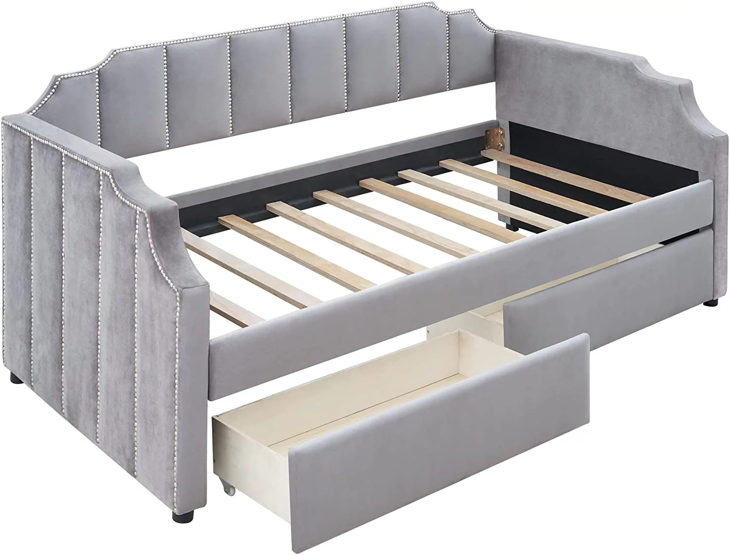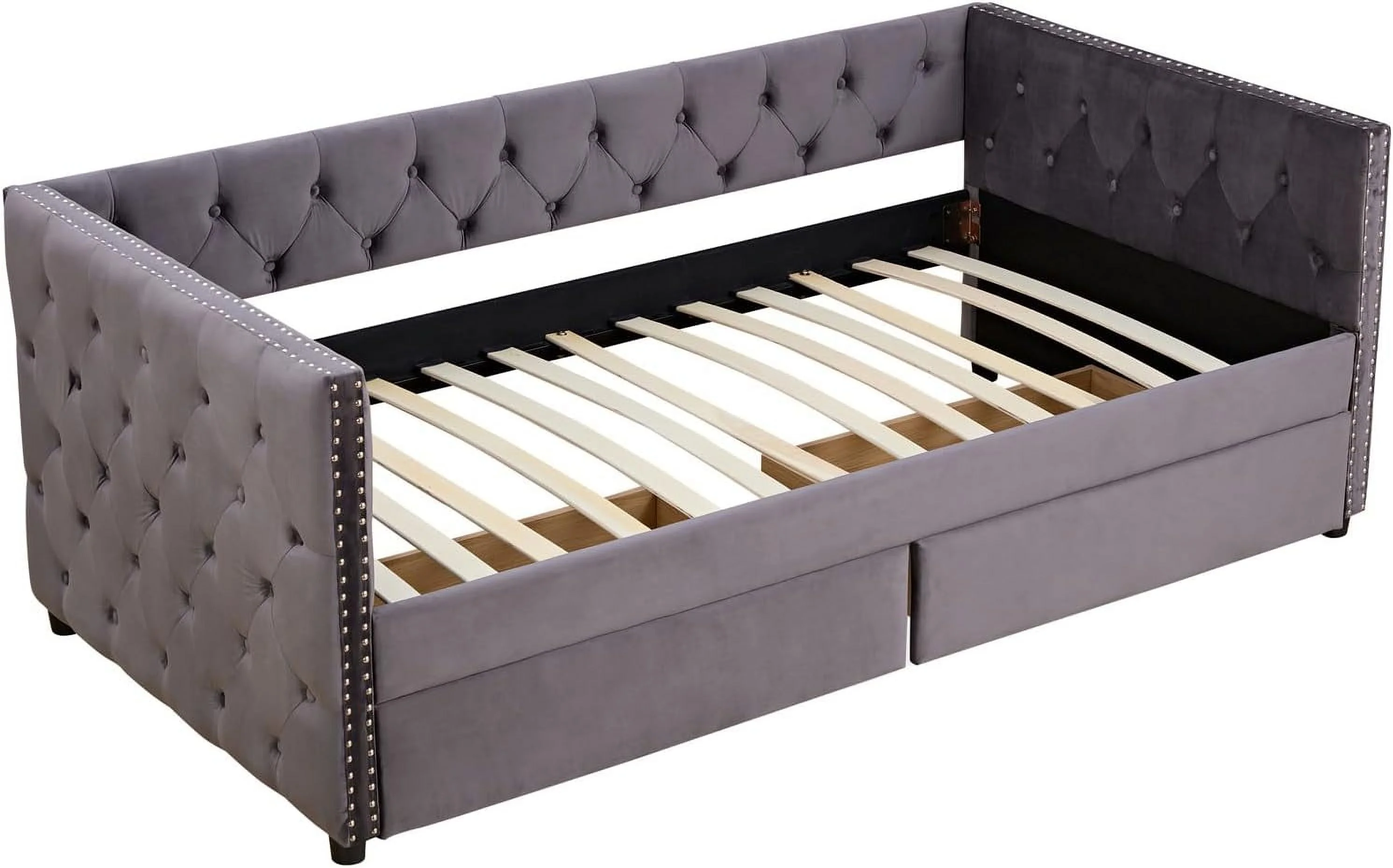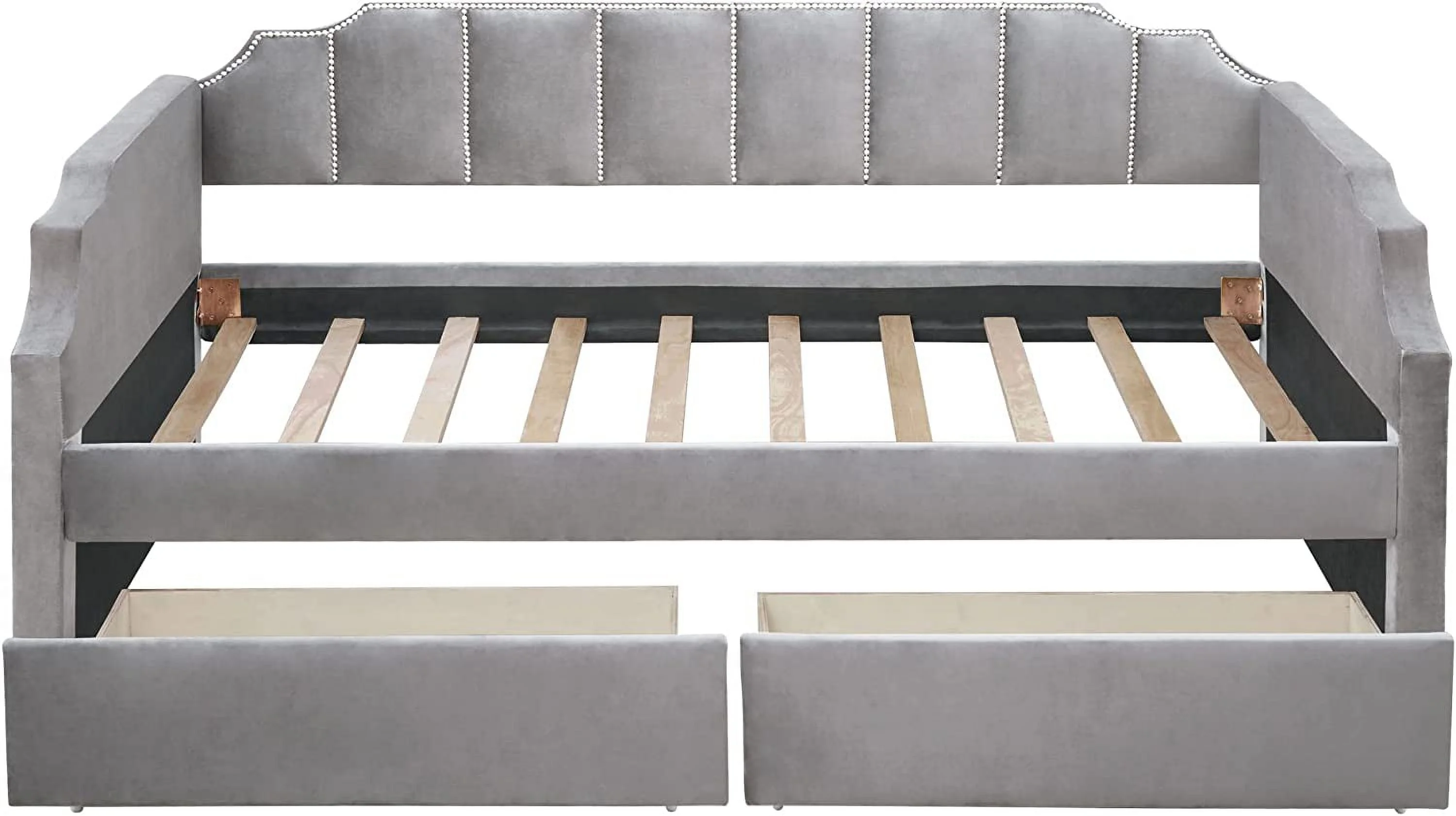 Upholstered Daybed With Two Storage Drawers, Tufted Sofa Bed Daybed With Nailhead Trim And Support (Grey) Wood Slat