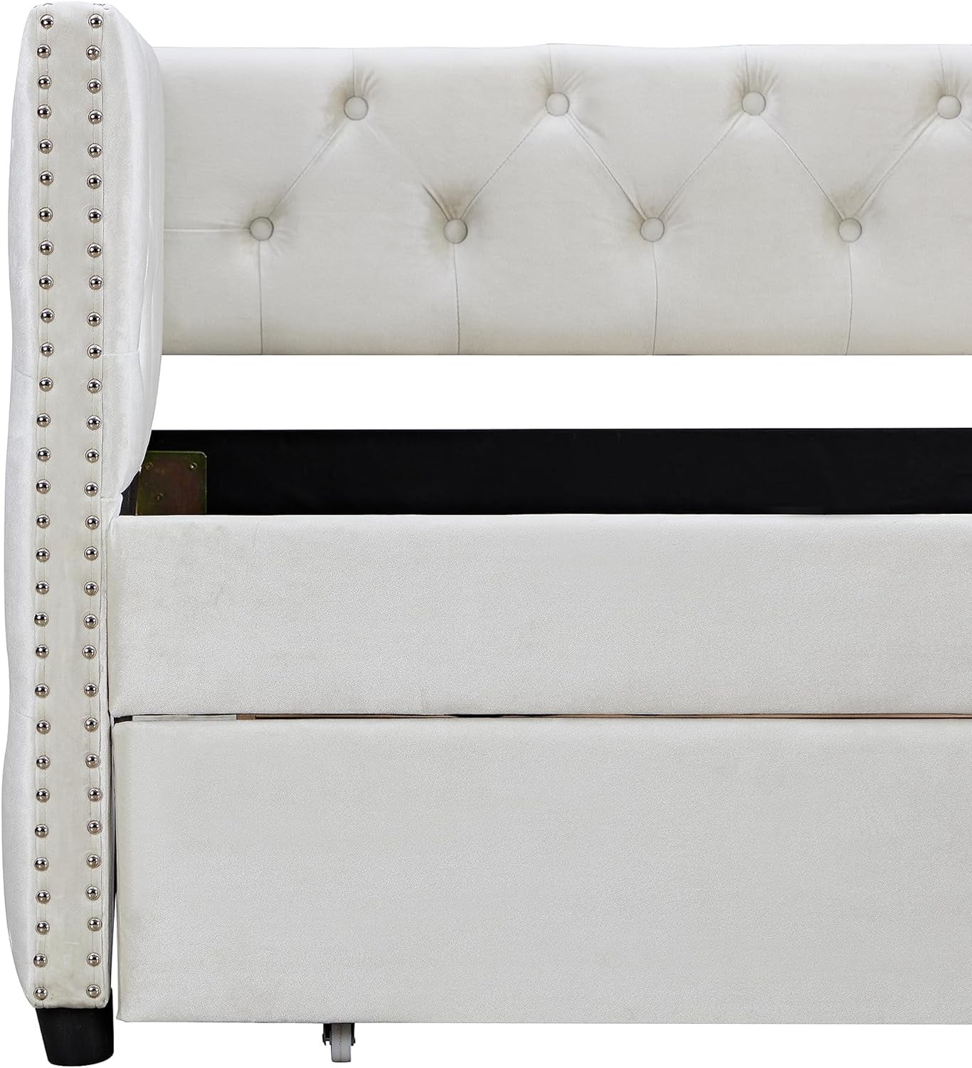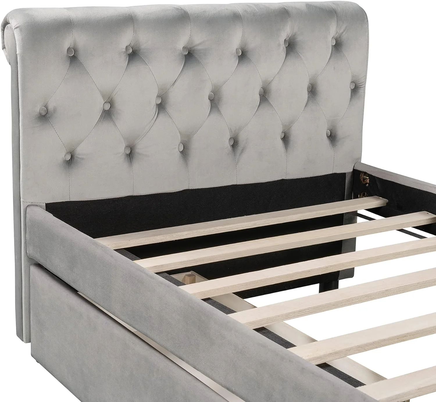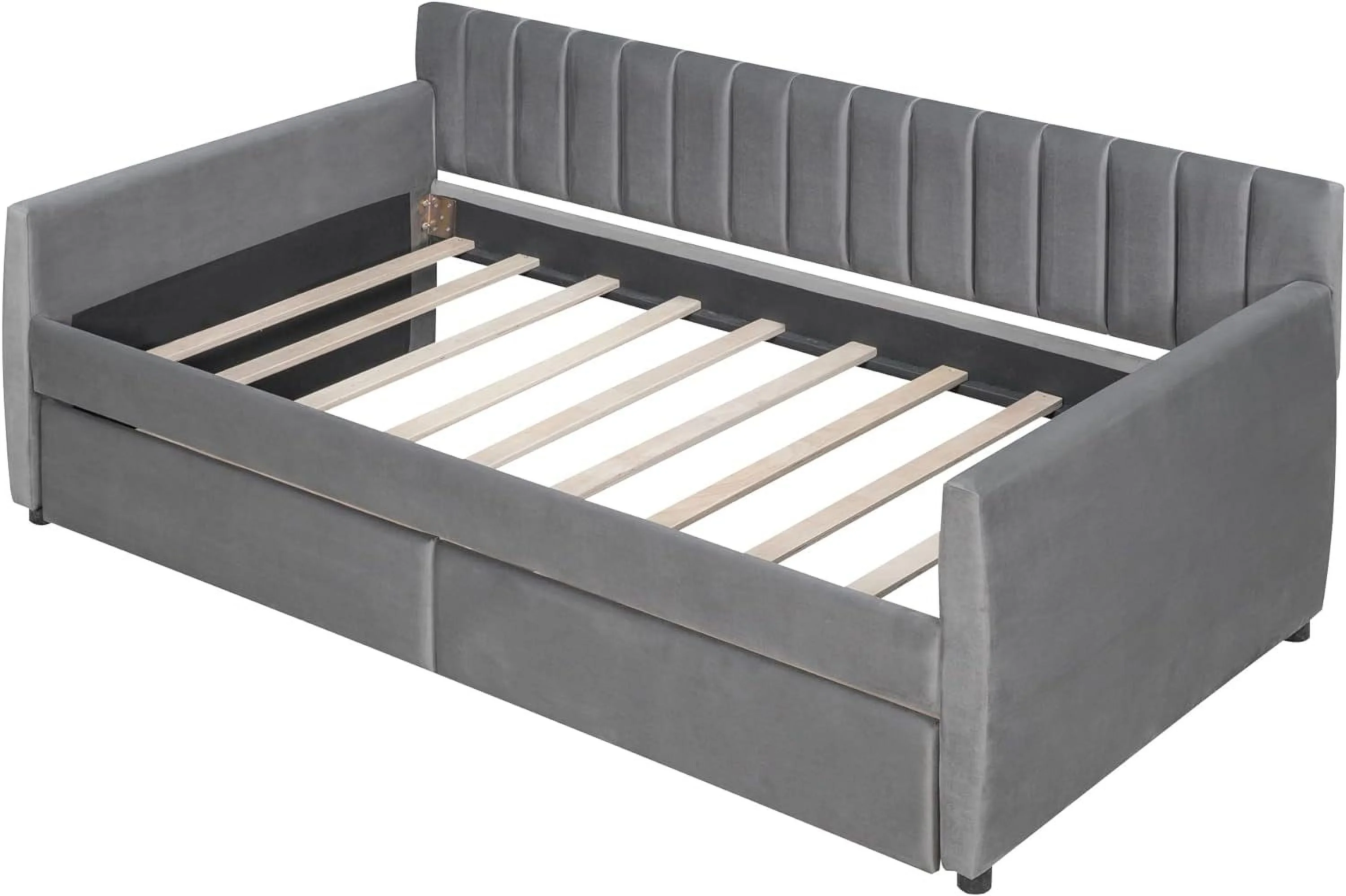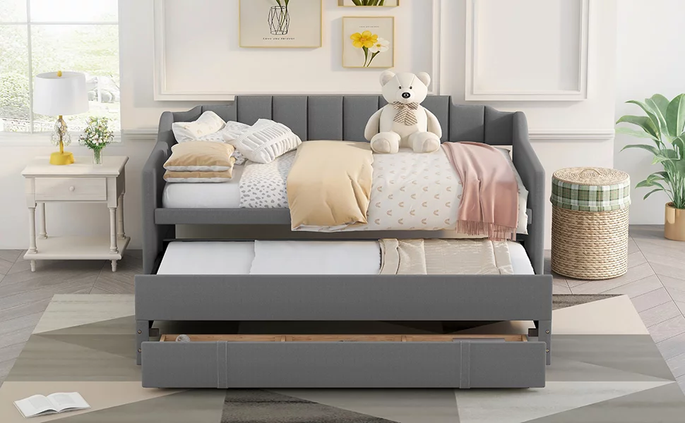 Twin Daybed with Trundle and Storage Drawers, Upholstered Linen with Wooden Daybeds,Gray
