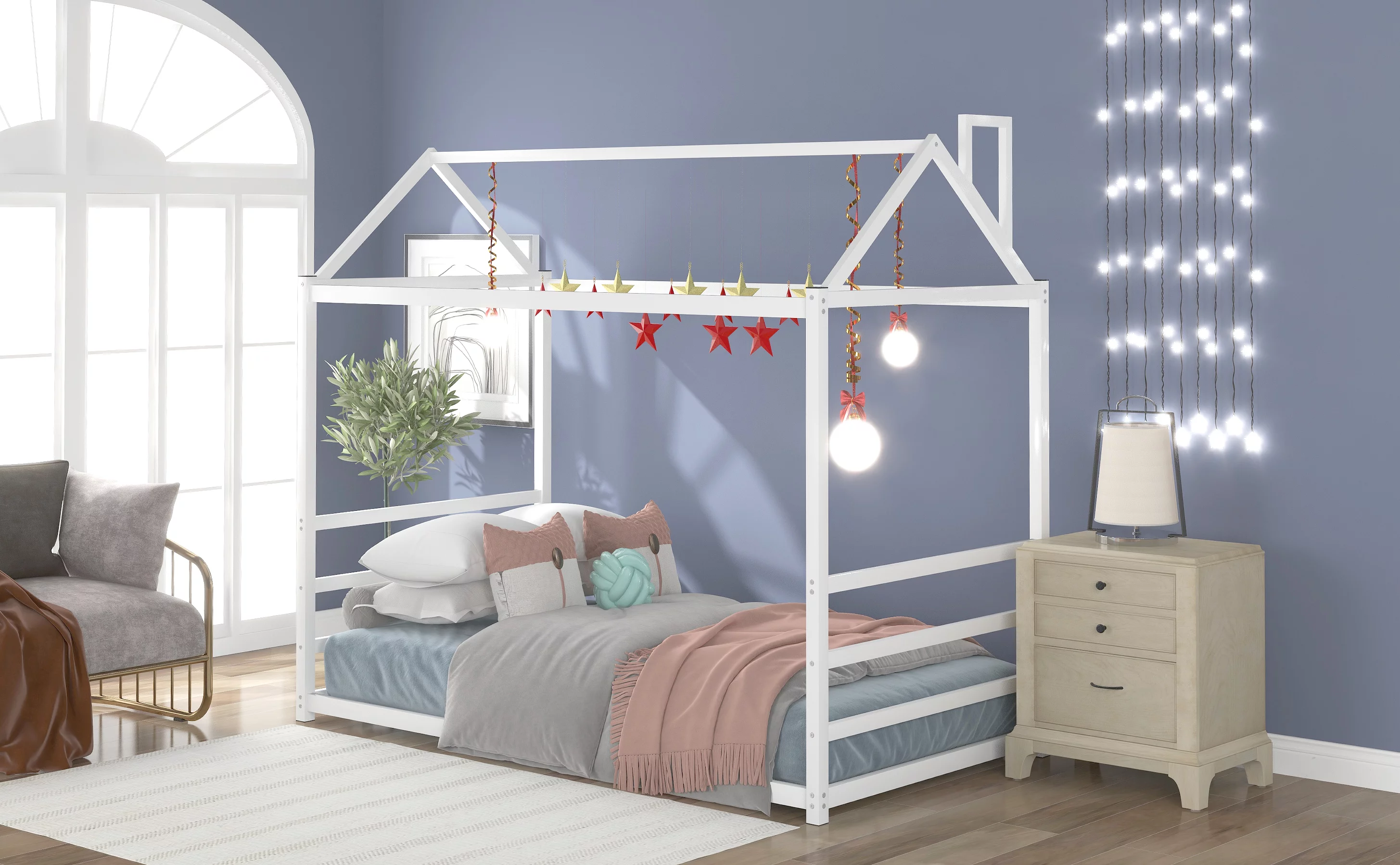 Momspeace Twin Size Daybed with Trundle, House-Shaped Headboard Bed with Guardrails Roof for Kids Bedroom, White