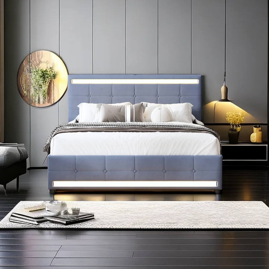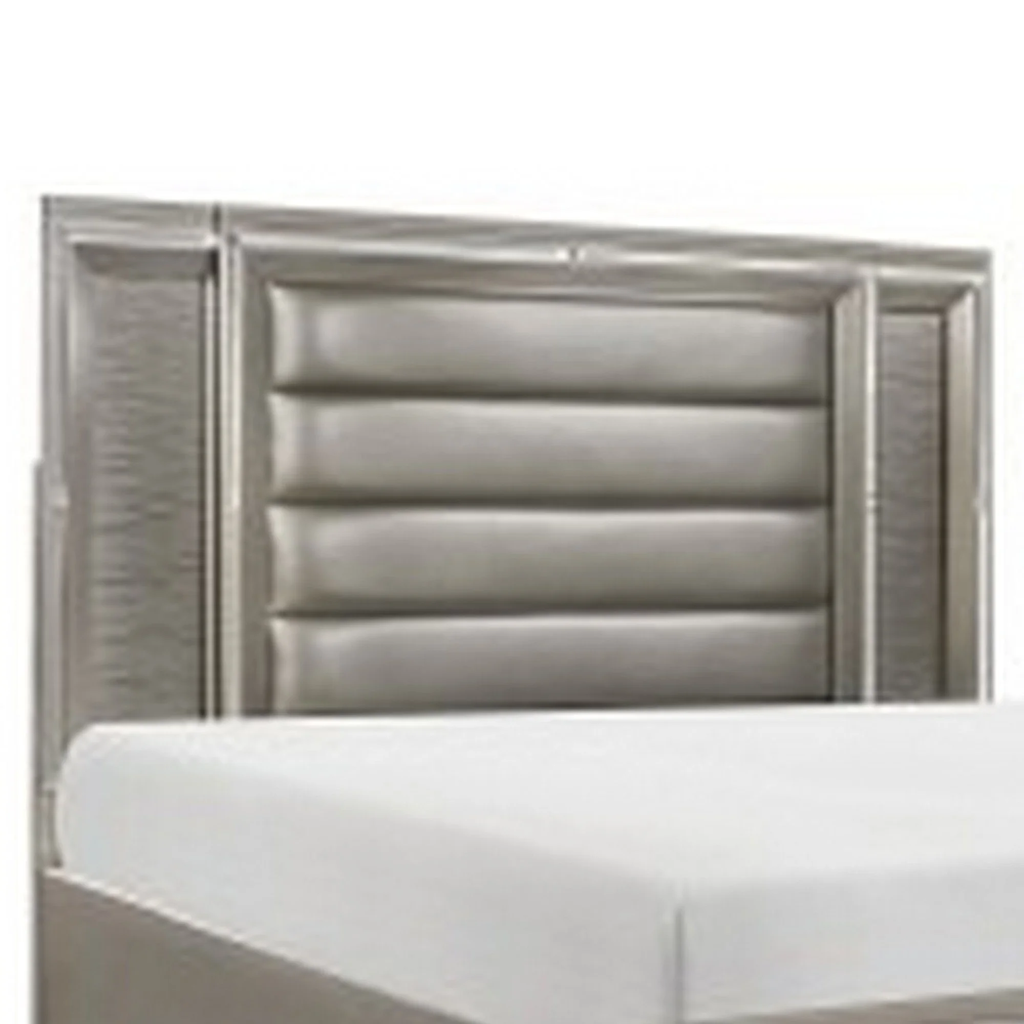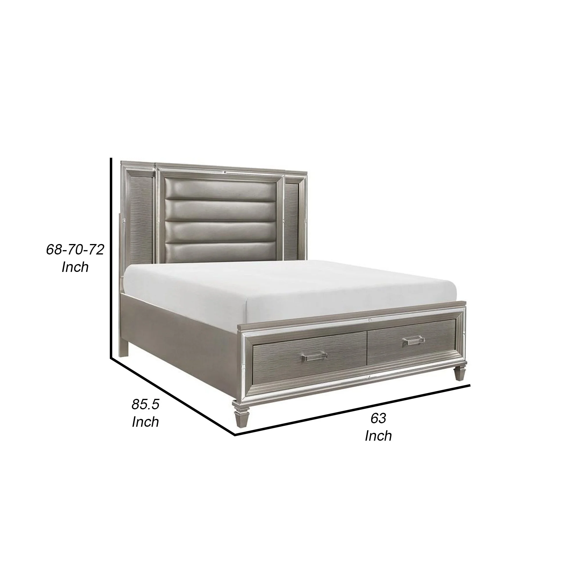 Benjara Delcy Queen Platform Bed, LED Headboard 2 Drawer Footboard, Mirrored Silver
