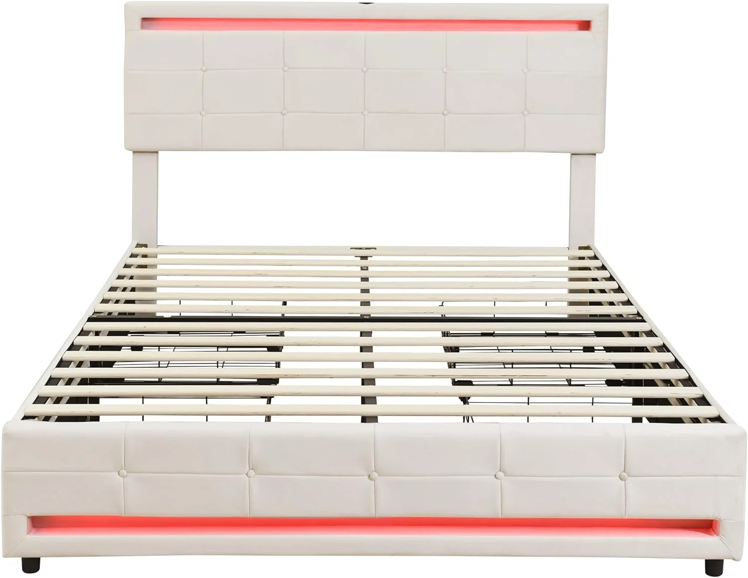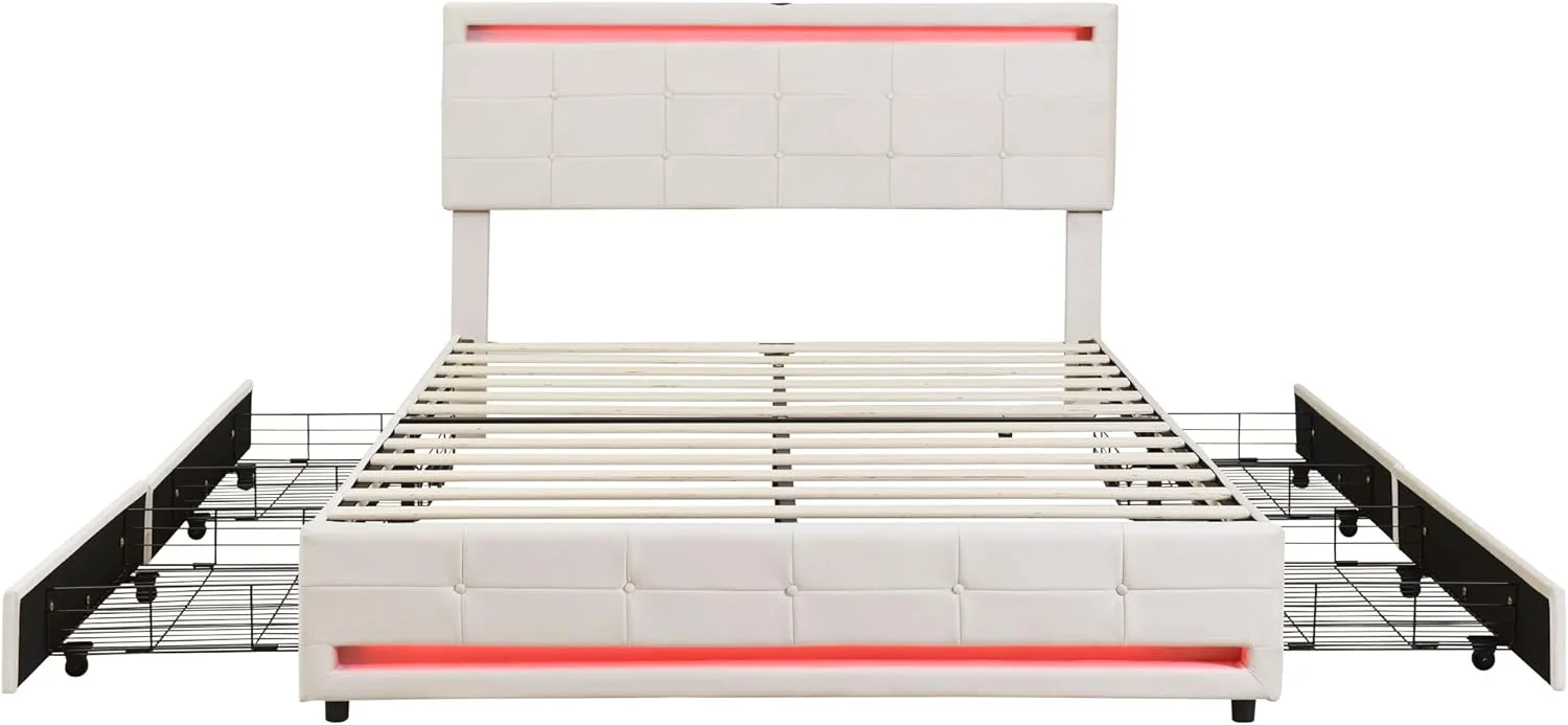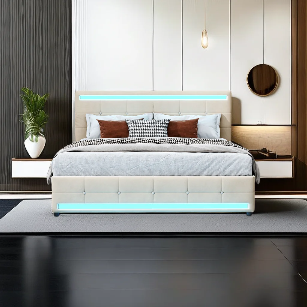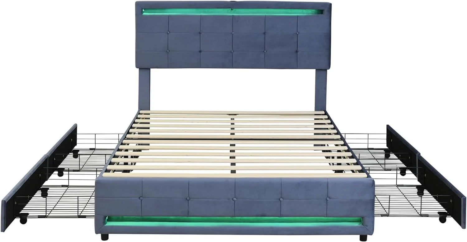 Benjara Delcy Queen Platform Bed, LED Headboard 2 Drawer Footboard, Mirrored Silver